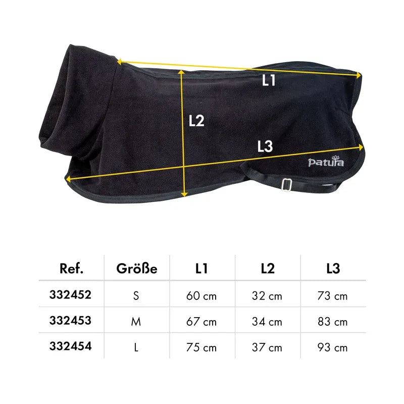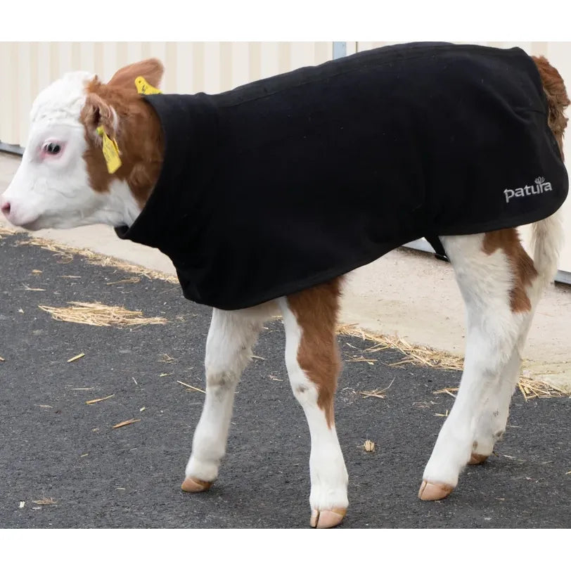 The difference of the PATURA calf blanket fleece to the PATURA calf rug lies in the material and the recommended area of use. Especially the softness of the material of the PATURA calf blanket fleece ensures a high level of comfort for calves. Similar to a pullover, the calf blanket is pulled over the calf's head and fastened around the calf's hind legs with 2 fasteners. The collar and the fleece ensure a high comfort factor and pleasant warmth for the calf on cold days.
