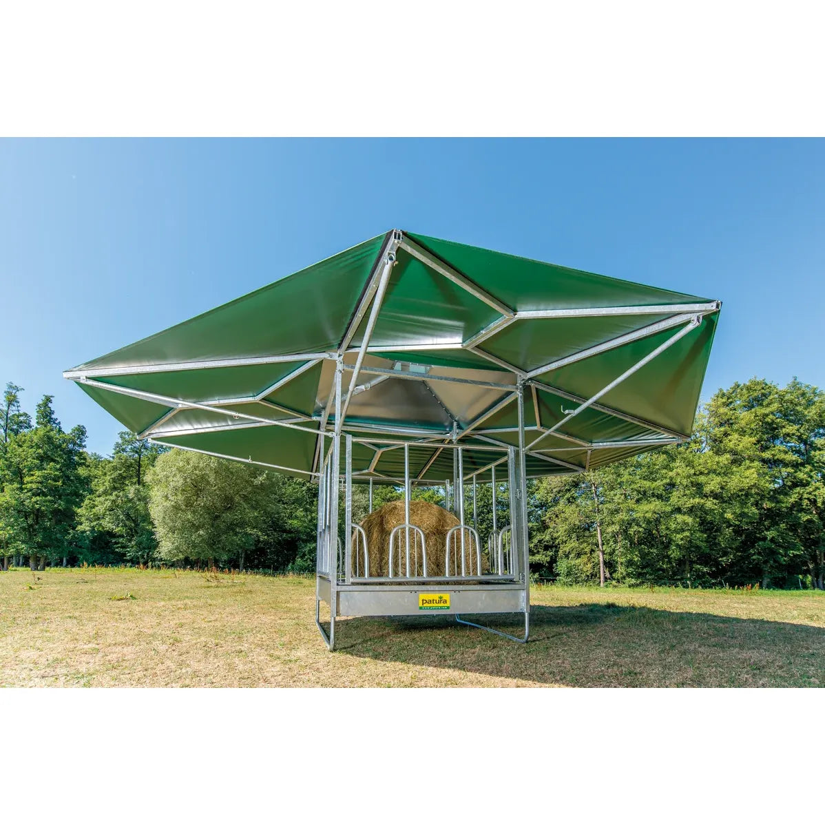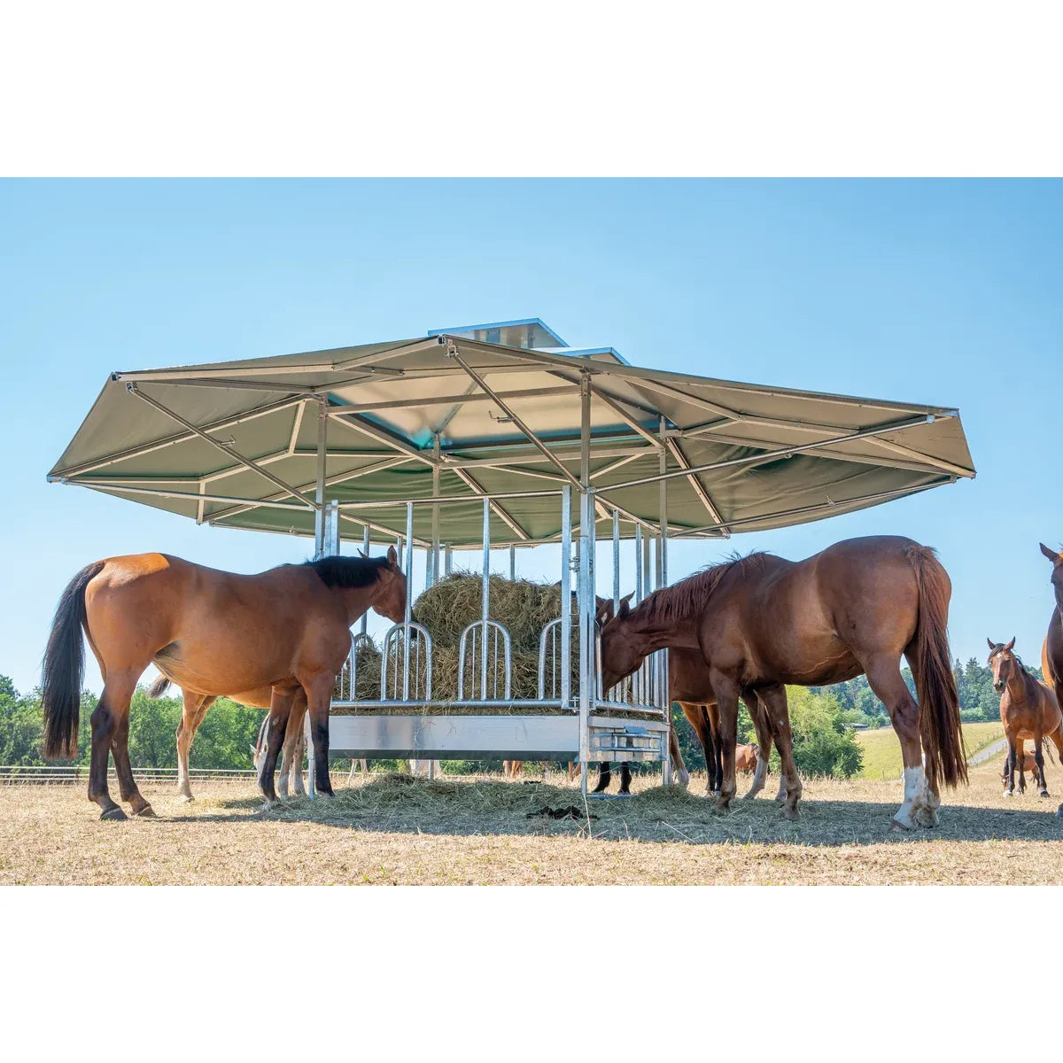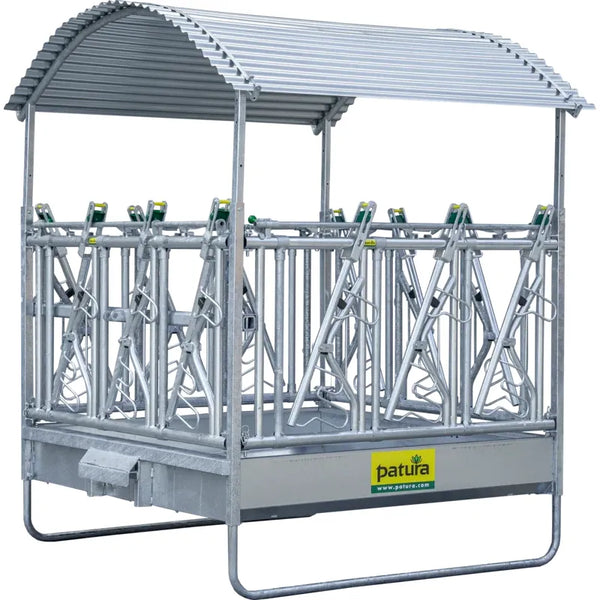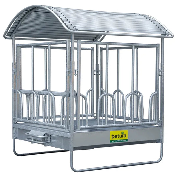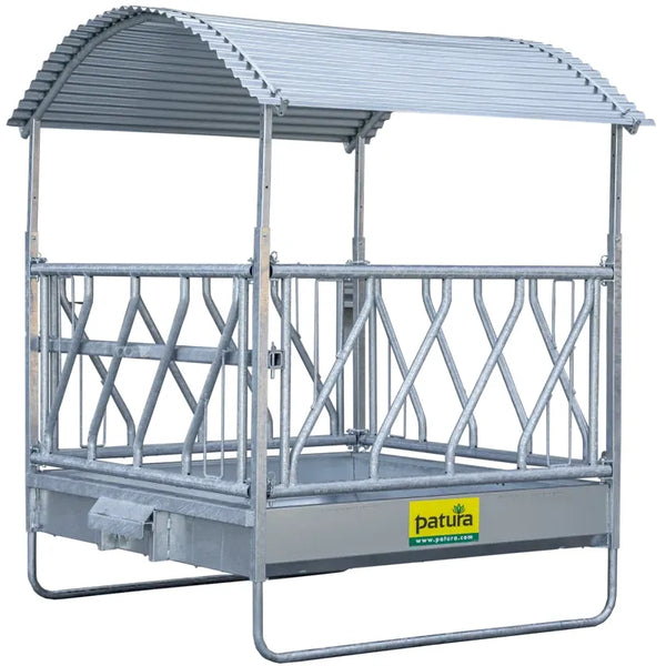 The new climatic rack is based on the tried and tested Profi square racks. The roof for the climate-controlled rack can be combined with all six feed fence variants. This innovative roof construction is mounted directly on the base frame of the rack. Due to the special design, the rack offers a very large roof area (36m² ) and provides a pleasant cooling effect thanks to the built-in chimney. The chimney effect always generates air movement, which creates a pleasant climate for the animals and also keeps annoying flies away. This creates an attractive place for the animals to eat and at the same time protects them from direct sunlight and rain.