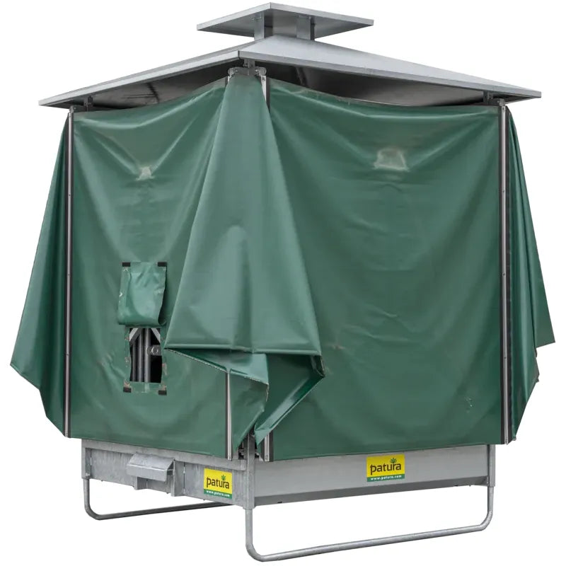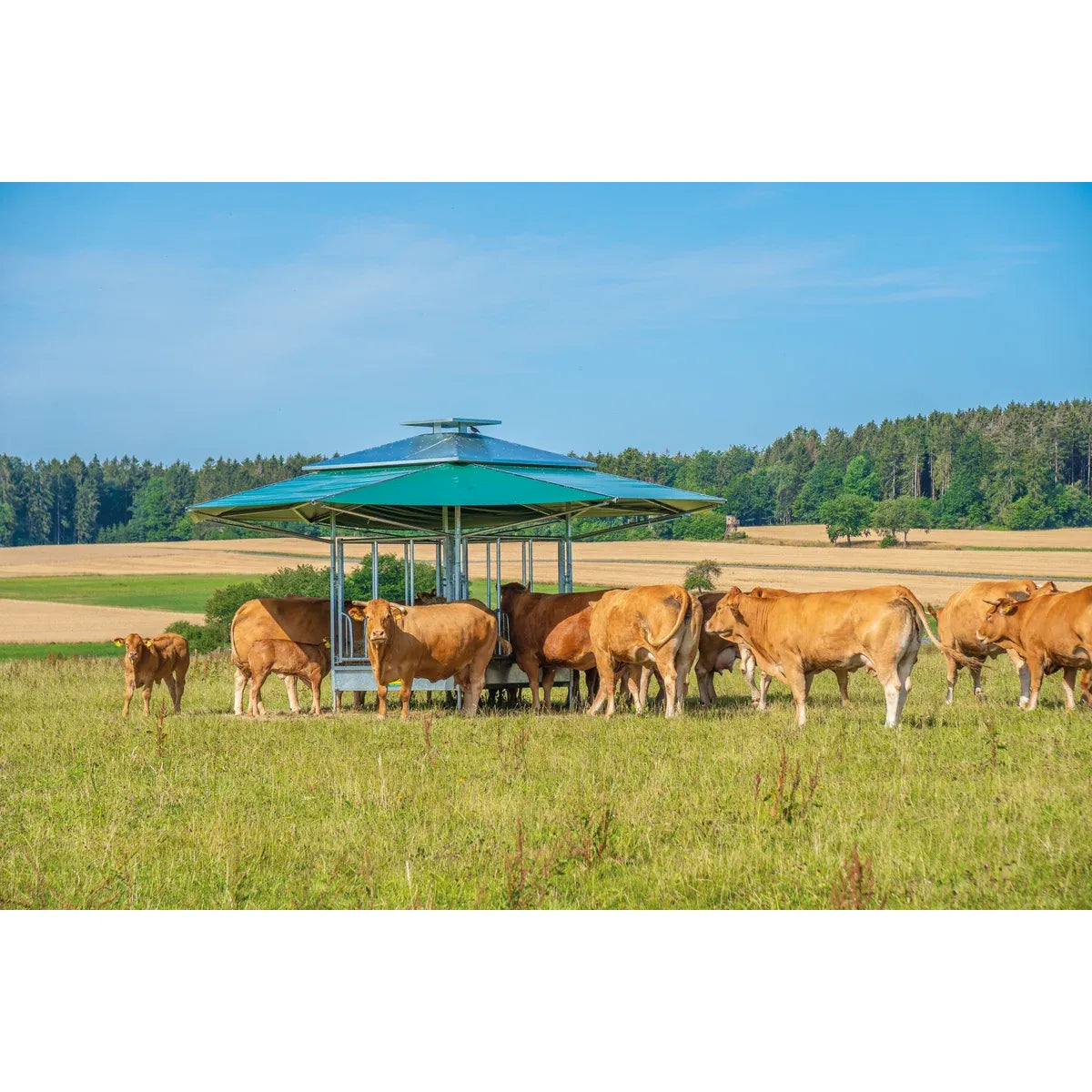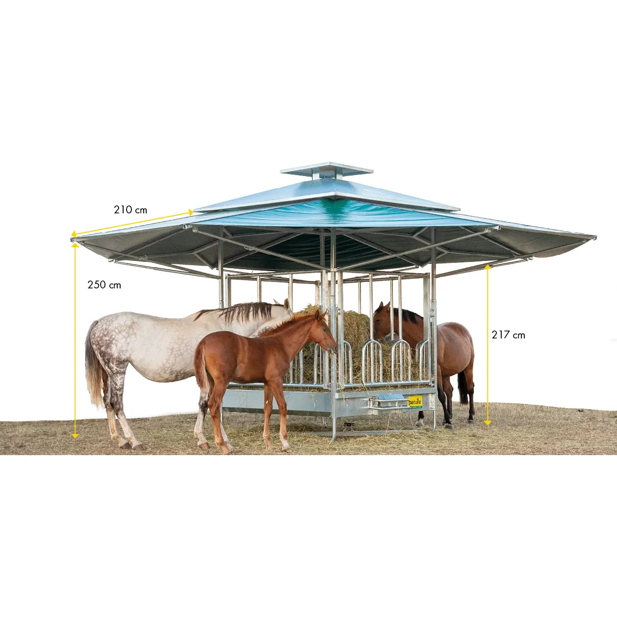 The new climatic rack is based on the tried and tested Profi square racks. The roof for the climate-controlled rack can be combined with all six feed fence variants. This innovative roof construction is mounted directly on the base frame of the rack. Due to the special design, the rack offers a very large roof area (36m² ) and provides a pleasant cooling effect thanks to the built-in chimney. The chimney effect always generates air movement, which creates a pleasant climate for the animals and also keeps annoying flies away. This creates an attractive place for the animals to eat and at the same time protects them from direct sunlight and rain.