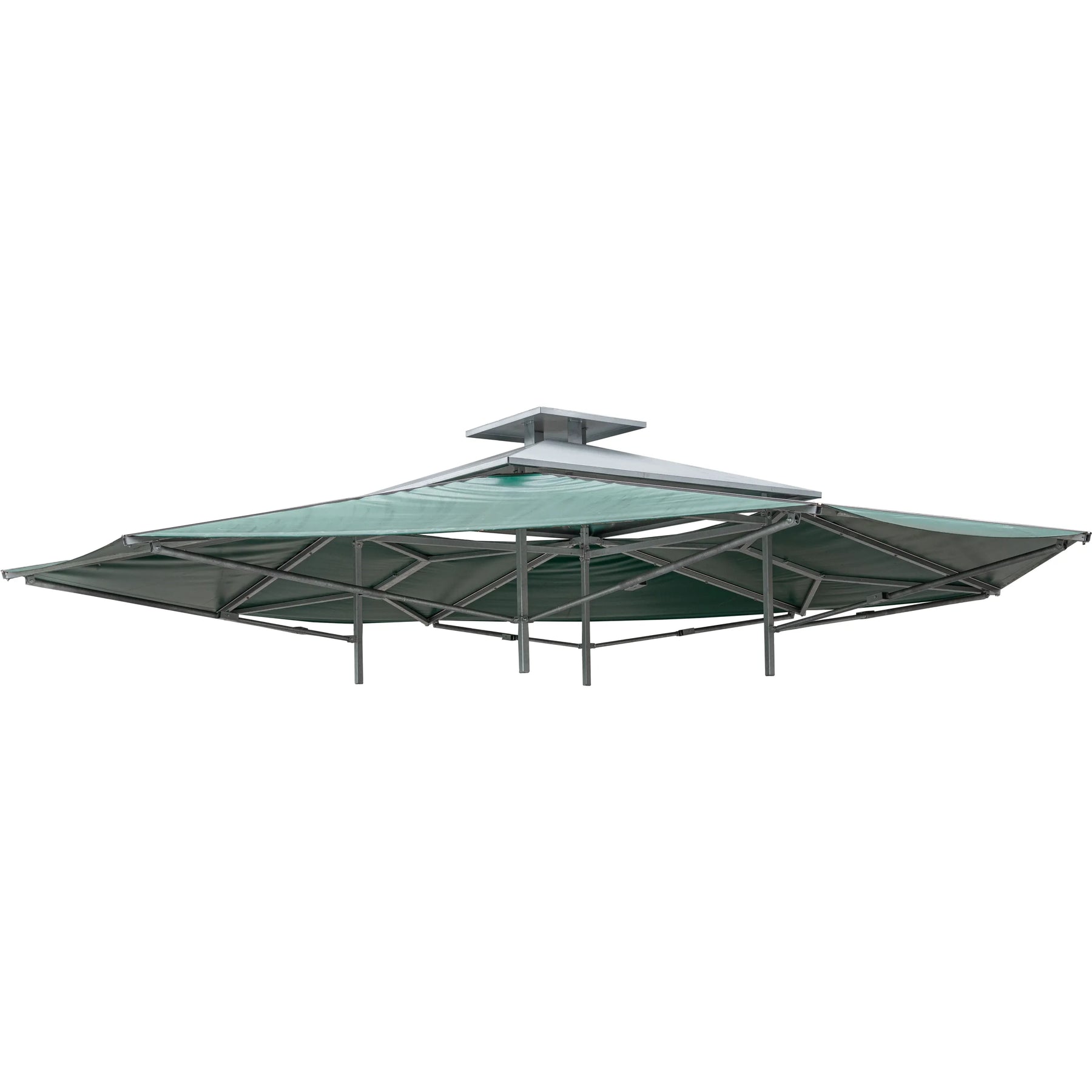 - Central sheet metal roof with chimney and 4 hinged roof surfaces