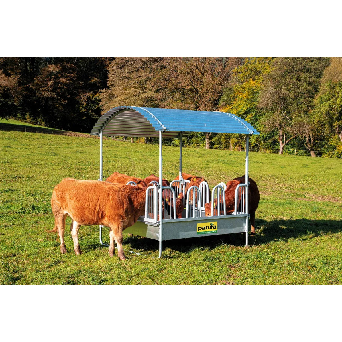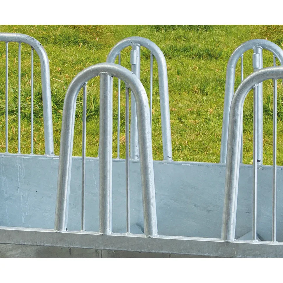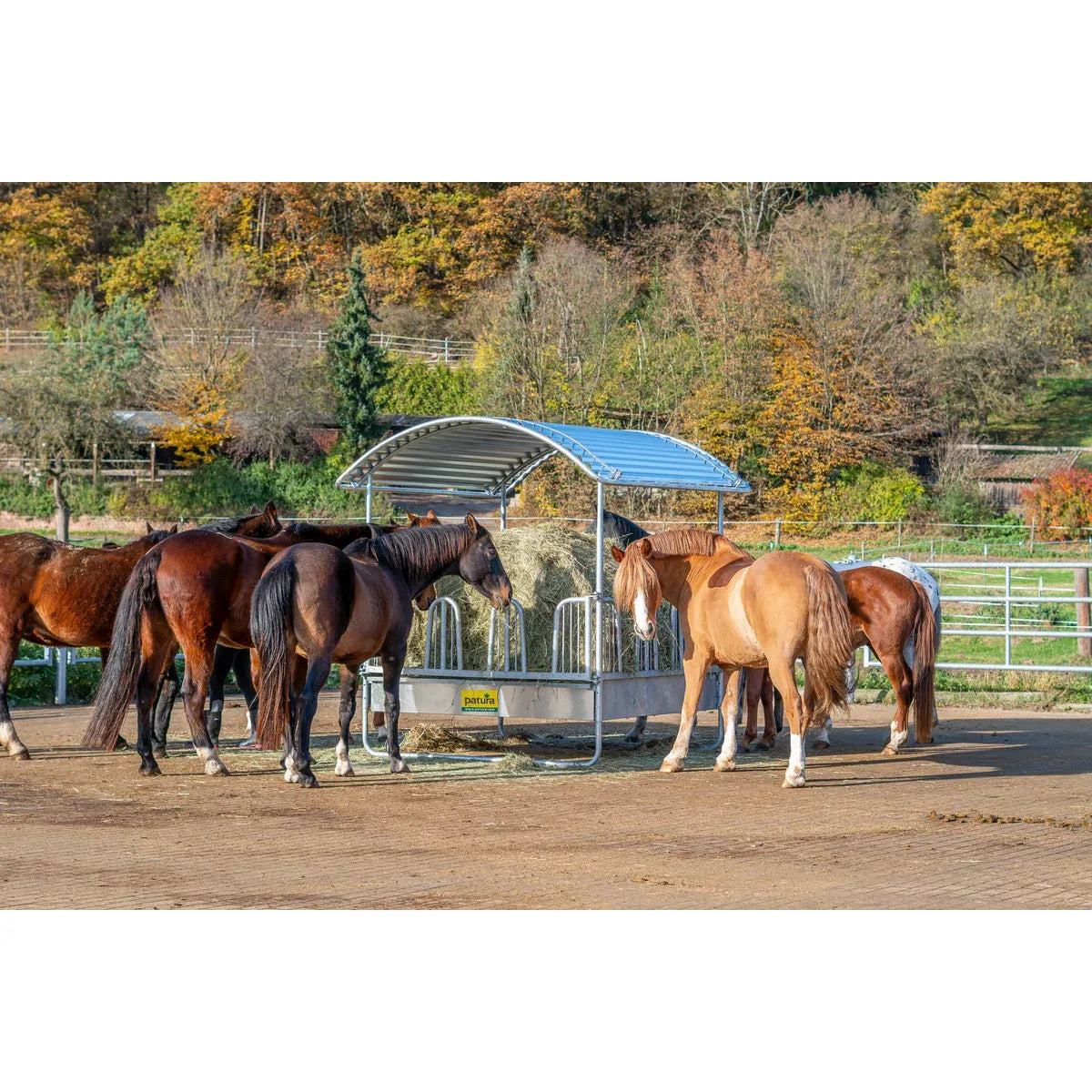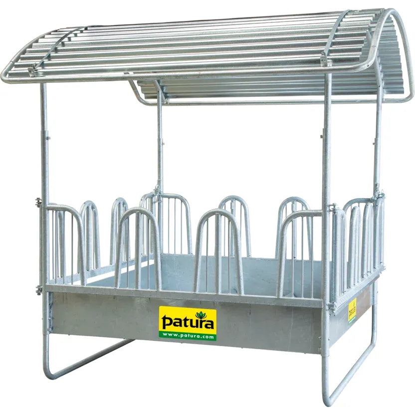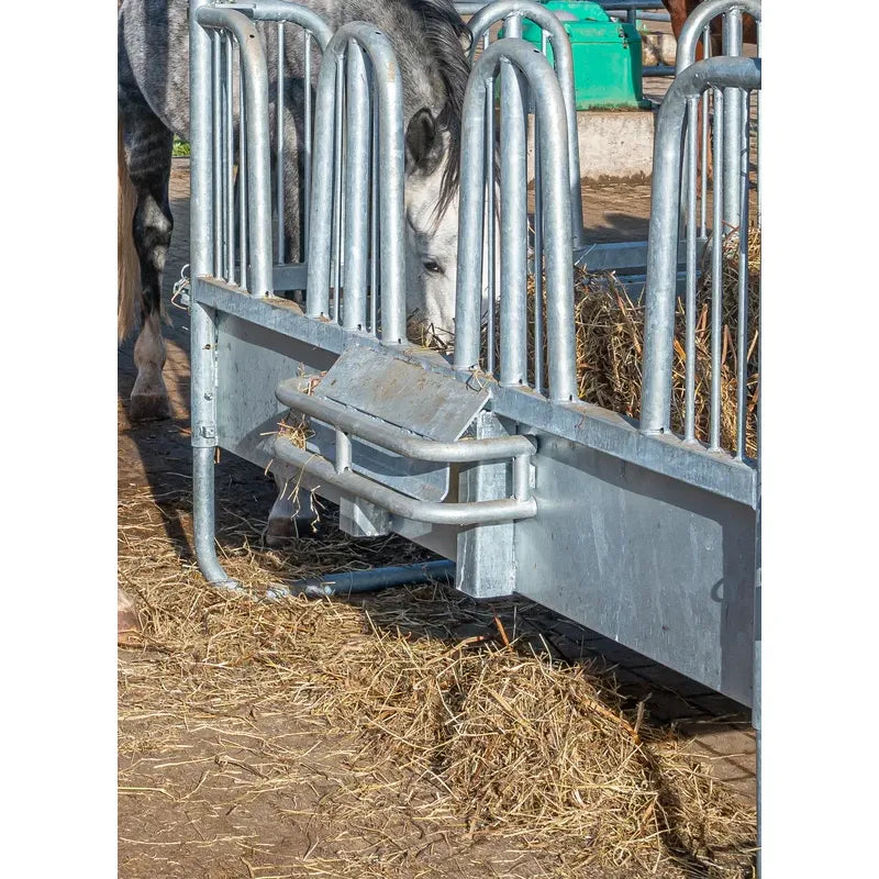 Discover the PATURA Compact square feeding trough with safety palisade feed fences - the perfect solution for providing your horse with a safe and reliable supply of roughage. With 12 feeding places and an unbeatable price-performance ratio, it offers everything you need! Thanks to additional struts and a maximum spacing of 5 cm, this feed fence meets all the requirements of horse keeping and the double reinforcement tubes ensure stability with minimum weight. Experience intelligent details and the highest load-bearing capacity.