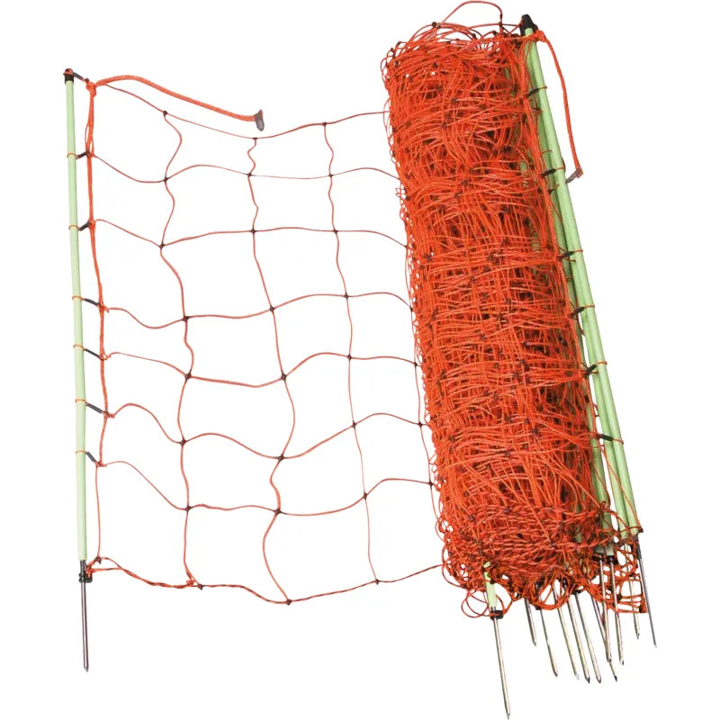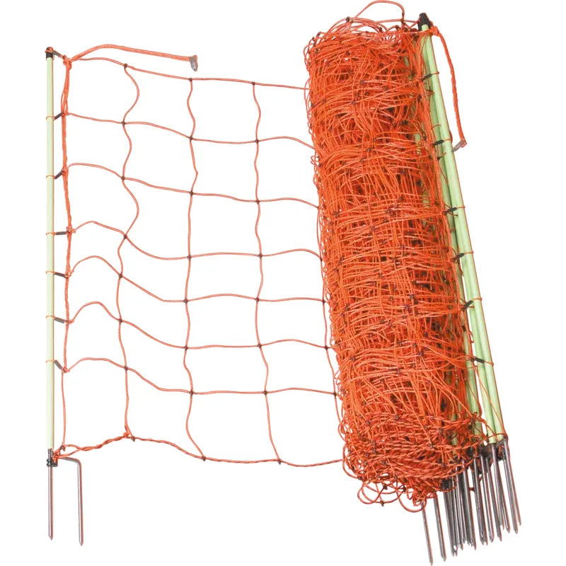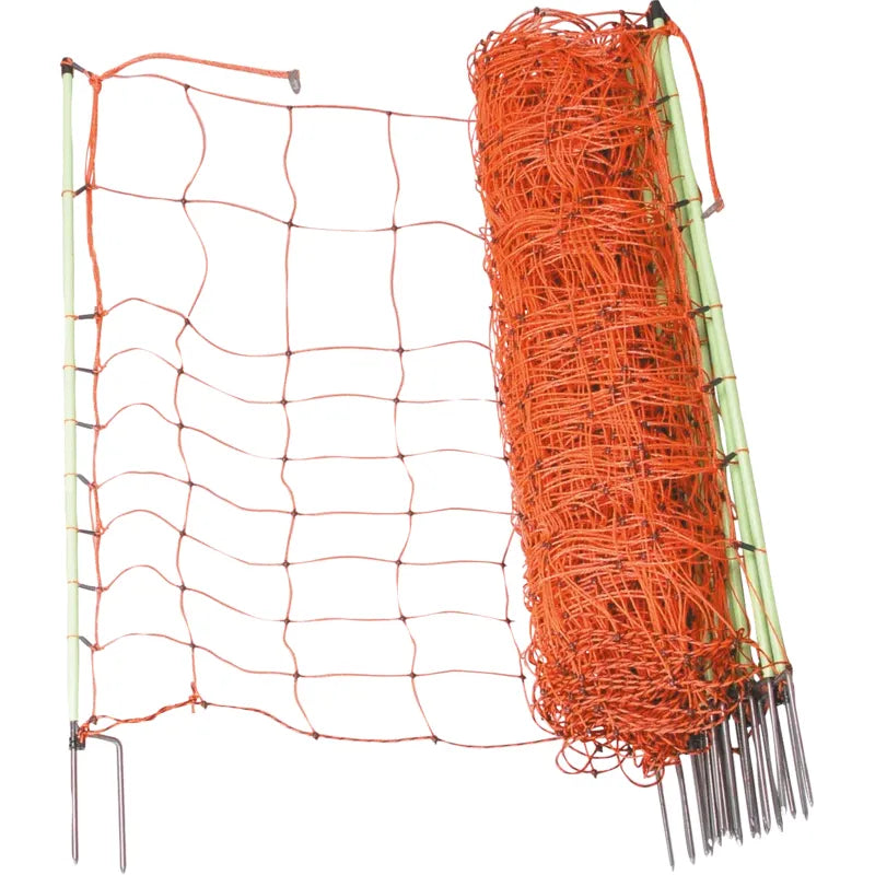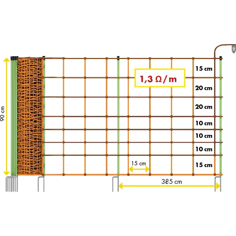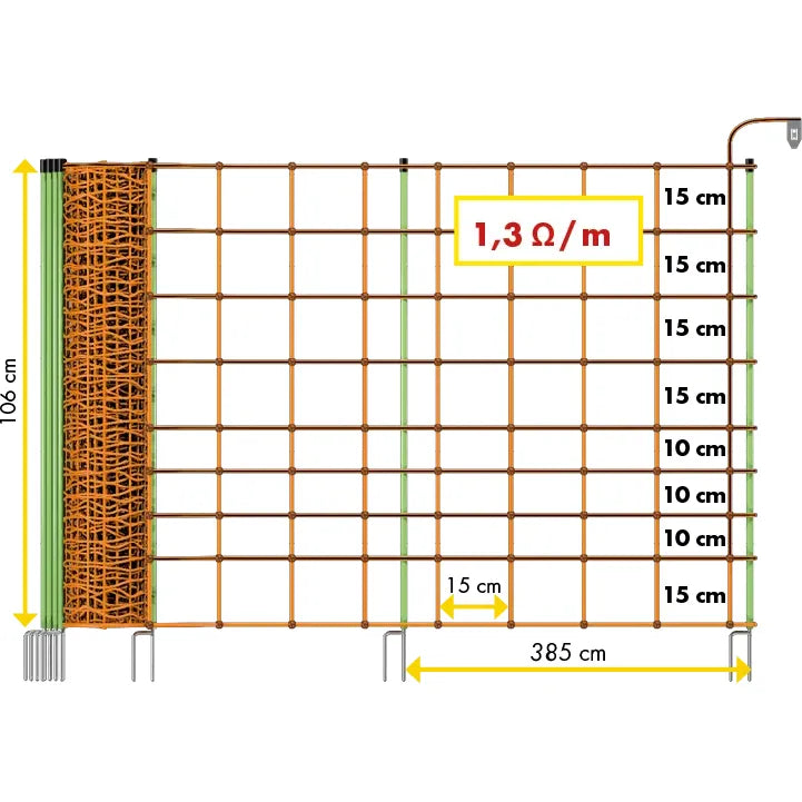 - Resistance: 1.4 Ohm / m - Length: 50 m - Clip for optimum connection - Double tip for easy entry - firmly welded knots - Stainless steel conductor for maximum bending strength - Polyethylene threads for maximum service life - with single tip or double tip - 2 different heights: - 0.90 m: 14 poles with double spike, 8 horizontal plastic strands (upper 7 current-carrying) - 1.06 m: 14 poles with double tip, 9 horizontal plastic strands (upper 8 current-carrying)