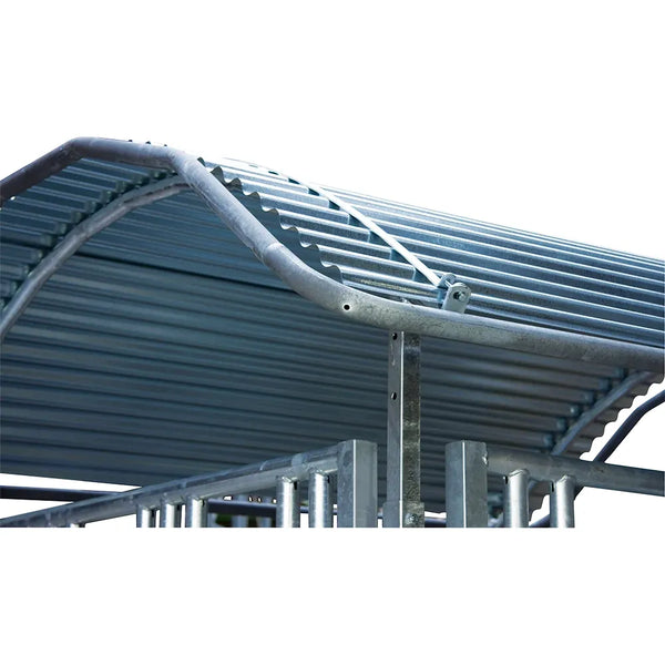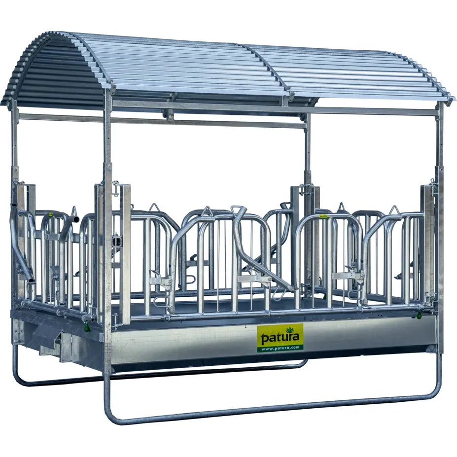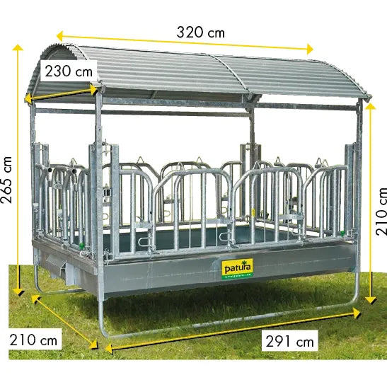 The large bale trough with safety catching feed fences, 10 feeding places ensures optimum roughage supply for smaller groups of animals. The integrated, all-round roof edge protection bar provides reliable protection in the head area. An optional plug-in three-point protection bar can be attached for even more animal safety. The rack is suitable for 2 round bales or 1 large pack, also with a frame for feed saving nets in the size 182x266cm.