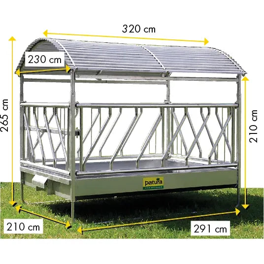 The large bale trough with sloping feed fences, 16 feeding places ensures optimum roughage supply for smaller groups of animals. The integrated, all-round roof edge protection bar provides reliable protection in the head area. An optional plug-in three-point protection bar can be attached for even more animal safety. The rack is suitable for 2 round bales or 1 large pack, also with a frame for feed saving nets in the size 182x266cm.