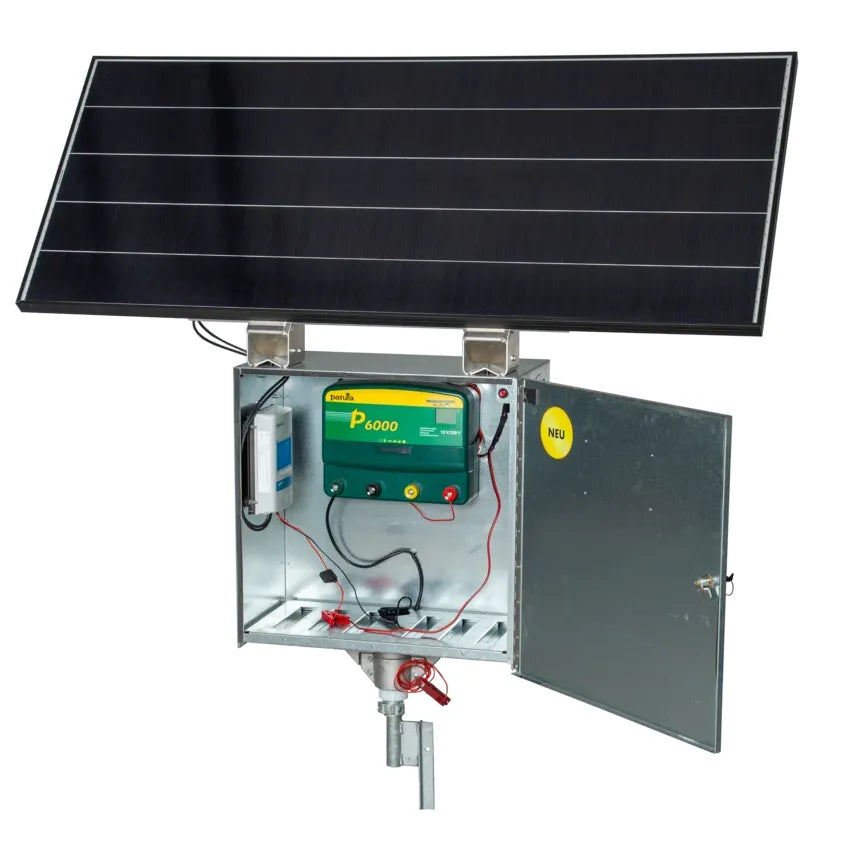 The Maxi safety box can accommodate electric fencing devices with pulse energies of up to 15J (P6000). This makes it particularly suitable for long fences with heavy vegetation. With the extra-large solar modules and a 200 Ah battery, maintenance-free operation is possible from April to October.