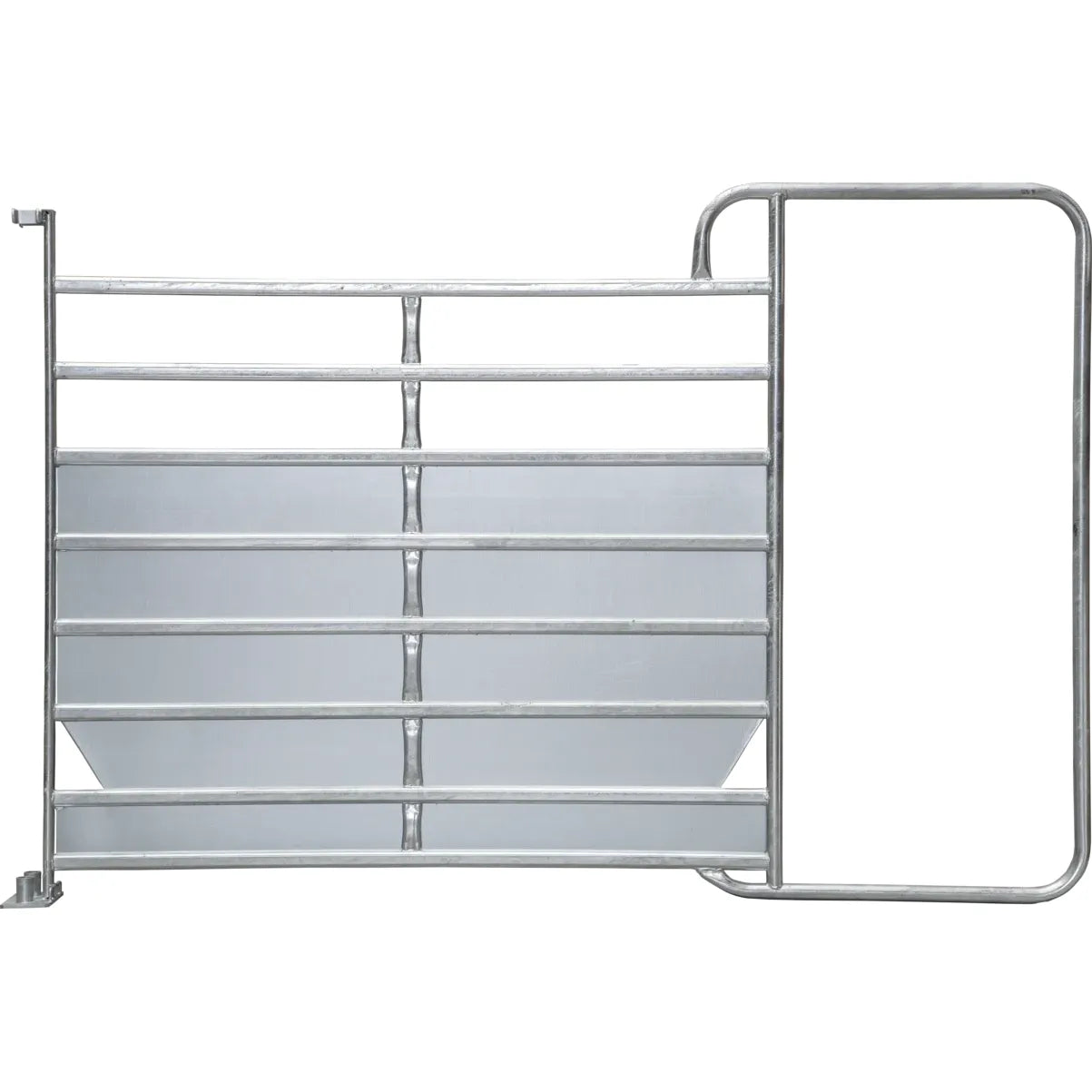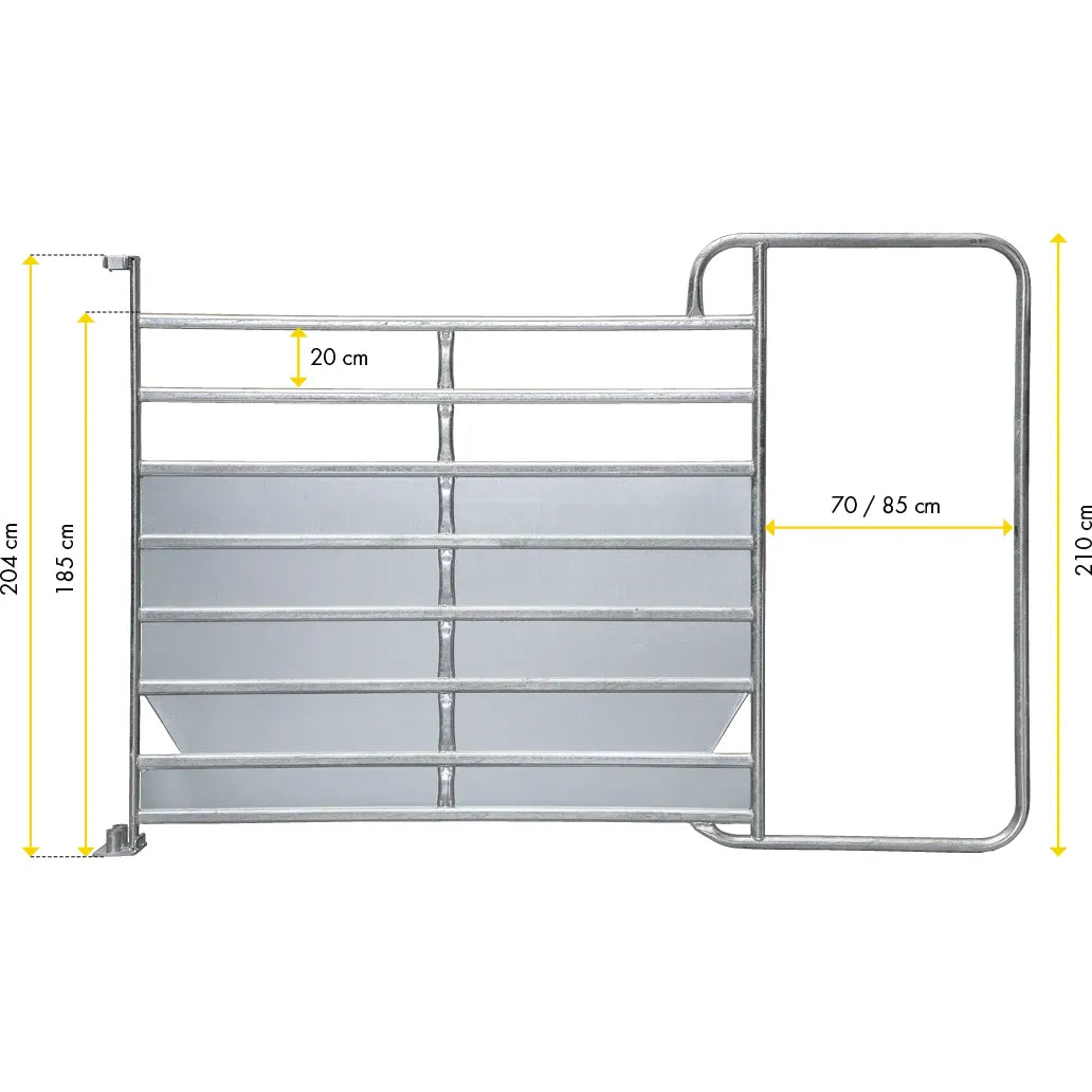 The panel is a stable, completely hot-dip galvanized panel. The panel offers maximum stability with low weight. Optimum stability on the ground and the possibility of slipping thanks to the skid-shaped feet. Quick connection of the panels even on uneven terrain thanks to chain fastener with stainless steel screw link. No slipping of the legs of jumping horses between the panels due to raised end pipes.