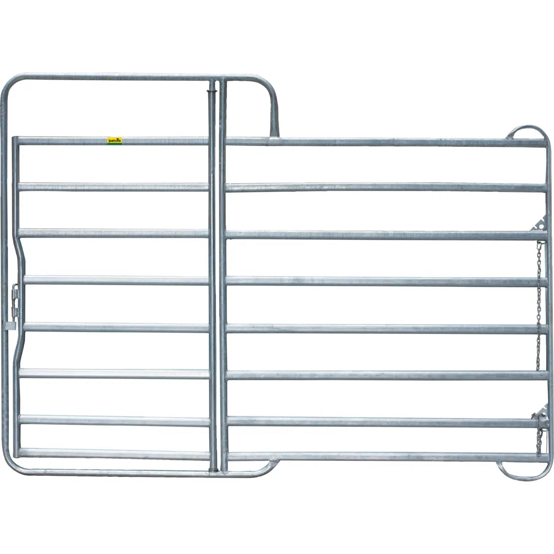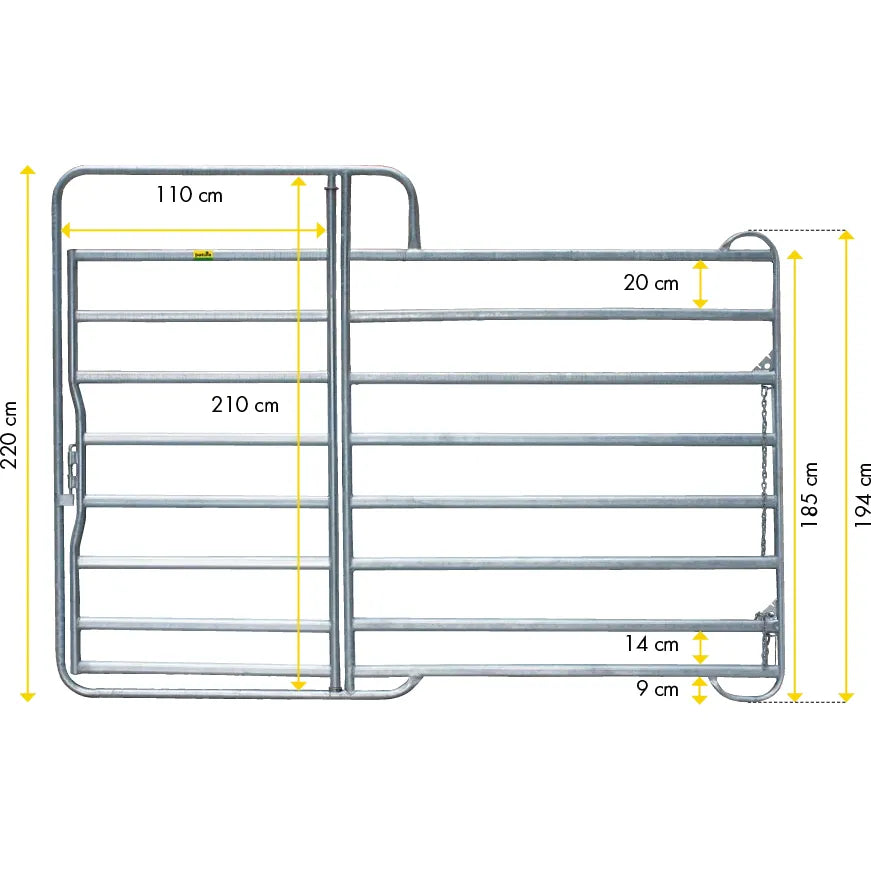 This Panel fence element is a sturdy, completely hot-dip galvanized panel with gate. The panel offers maximum stability with low weight. The spring latch enables the gate to be locked securely. Optimum stability on the ground and the possibility of slipping thanks to the skid-shaped feet. Quick connection of the panels even on uneven terrain thanks to the chain lock with stainless steel screw link. No slipping of the legs of jumping horses between the panels due to raised end pipes.