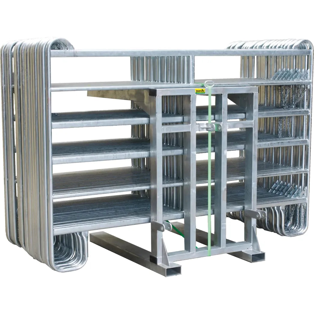 With the panel transport rack, you can transport panels (panel 5, panel 6, panel 8 and safety horse panel) safely and easily with a three-point hitch or pallet fork. Now with a new feature to prevent the panels from slipping sideways. Panels can be stored on the panel frame, no loading and unloading on the farm necessary. Holds up to 20 panels. Tensioning strap is included.