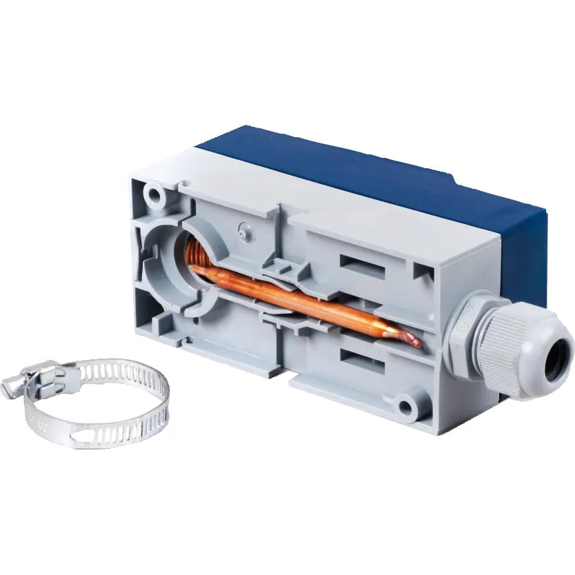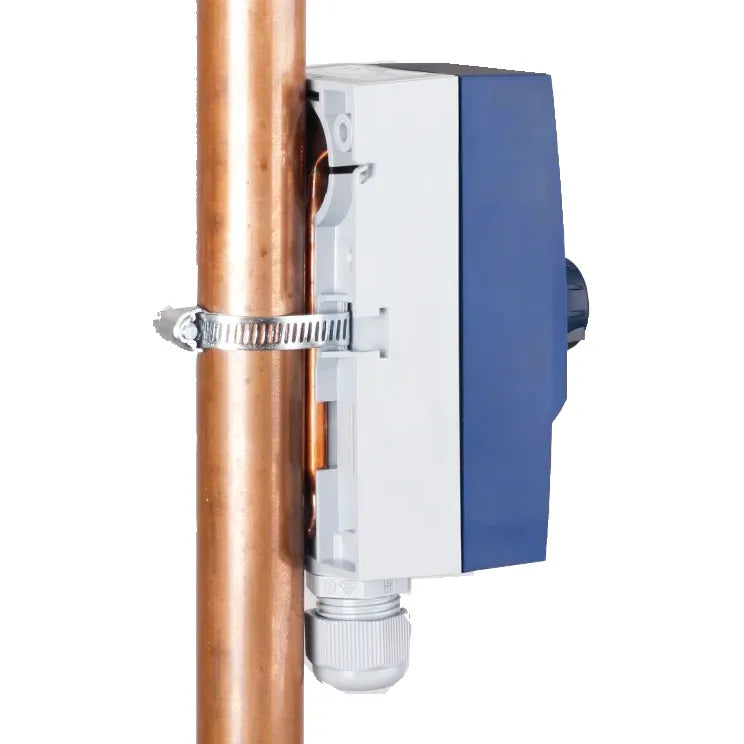 The switching criterion for the frost protection thermostat is the air temperature. With pipe contact thermostats, the temperature of the water pipe (=water temperature) is used as the switching criterion.