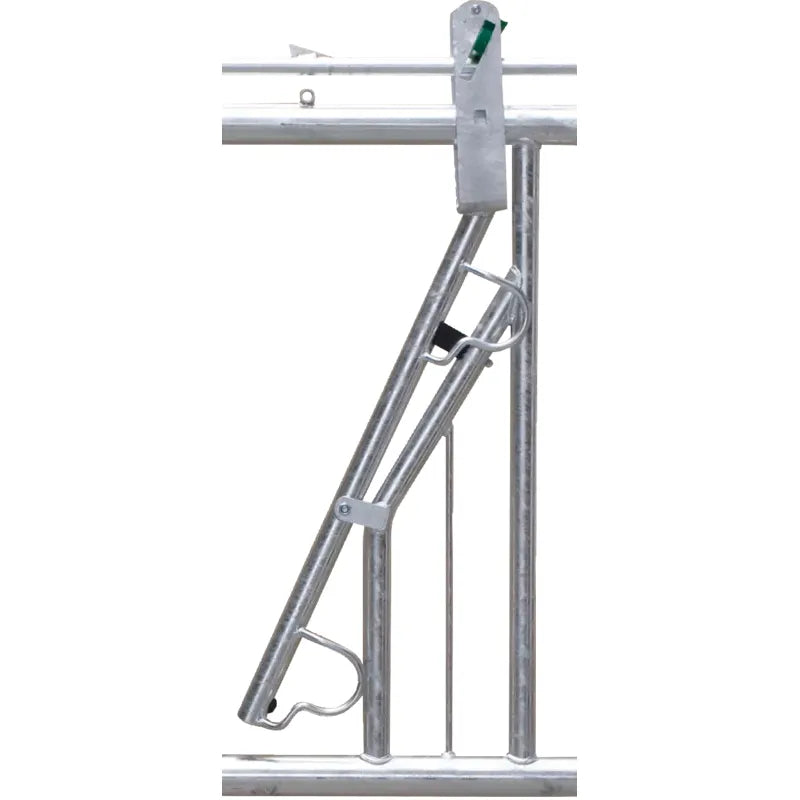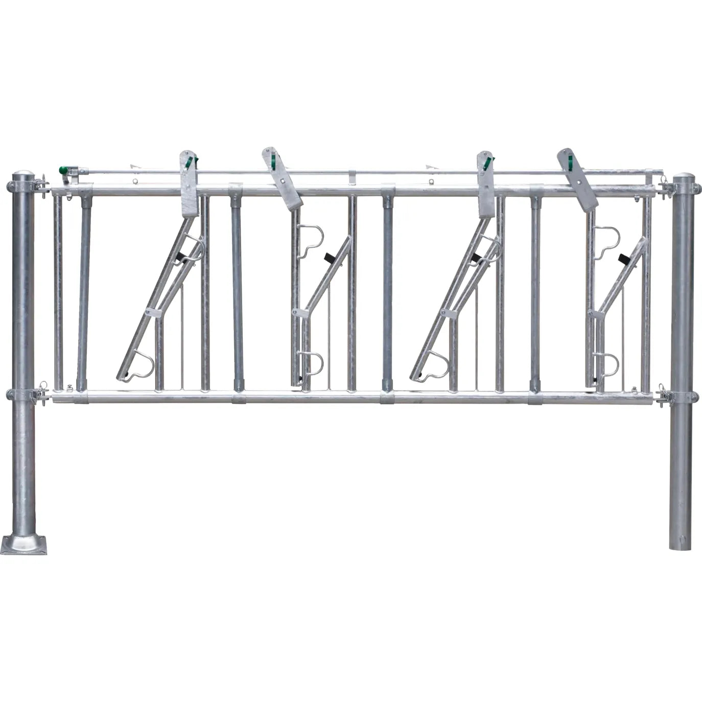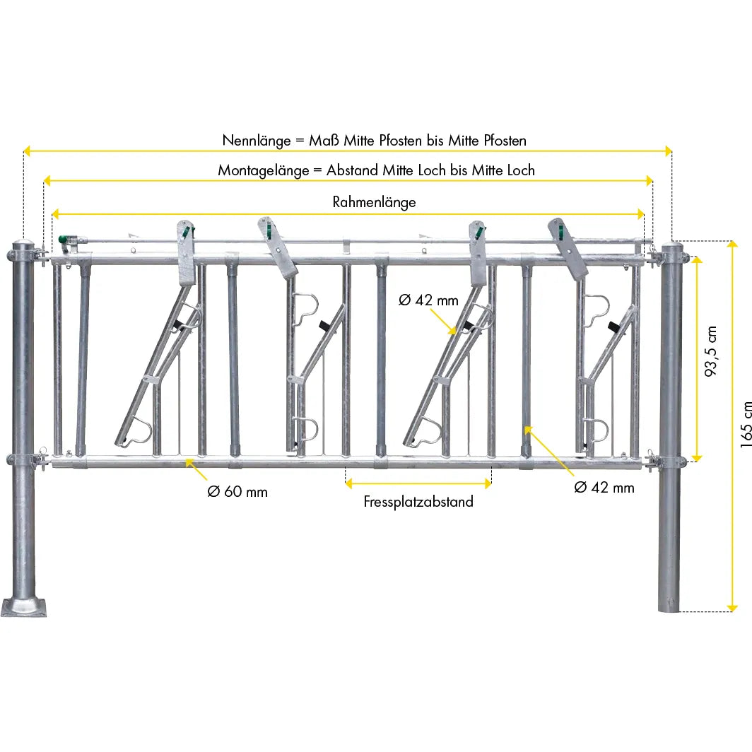 The PATURA Self-locking grille with adjustable neck width ensure that animals that lie down or slip in the feed fence can escape from the bottom of the feed fence without any problems. The special anti-noise design provides triple noise insulation. Rubber buffers prevent the development of noise when opening or closing the catch bar. A plastic-coated locking bolt enables silent locking. The pivot point of the catch bar is reinforced for years of wear-free operation. We only use high-quality steel tubes of 60.3 mm (2") for the frame of the feed fence. The diameter of the intermediate tubes and catching bars is 42.4 mm. All feeding places can be locked individually. It is possible to install the feed fences at an angle. We supply standard lengths from 1 to 6 m with feeding place widths from 50 to 100 cm.