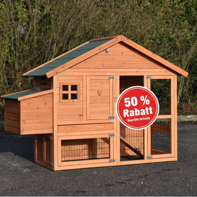 Großer Holzhühnerstall mit Auslaufgehege, Giebeldach und Drahtgittertüren – idealer Gartenstall für Hühner.