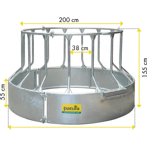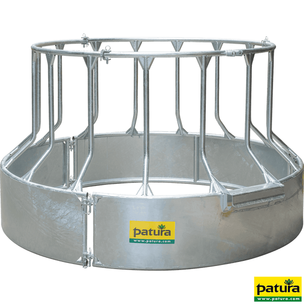 Le râtelier économiseur d'aliments de Patura Grâce à la disposition spéciale des cornadis, les pertes de fourrage sont réduites au minimum lors de l'affouragement au pâturage. Le fourrage qui tombe tombe à l'intérieur du râtelier, ce qui évite les pertes dues au piétinement. Il y a jusqu'à 75% de pertes de fourrage en moins par rapport aux râteliers ronds traditionnels. Grâce à sa construction massive et à la quadruple stabilisation des tubes du cornadis, le râtelier économiseur d'énergie est parfaitement adapté à l'élevage bovin.