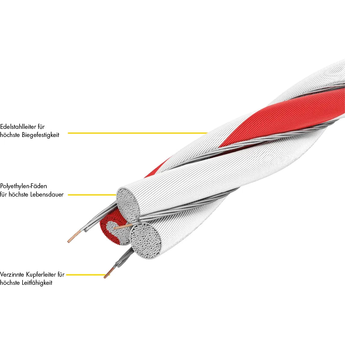 Come caratteristica speciale PATURA la lavorazione combinata di conduttori in acciaio inox e rame. I conduttori in acciaio inox sono estremamente resistenti, mentre quelli in rame sono altamente conduttivi. Solo questa combinazione consente a un conduttore di rame rotto di essere nuovamente alimentato direttamente da un conduttore in acciaio inox più stabile. A differenza dei trefoli convenzionali, la lunga durata e l'alta conduttività sono combinate in un unico prodotto.