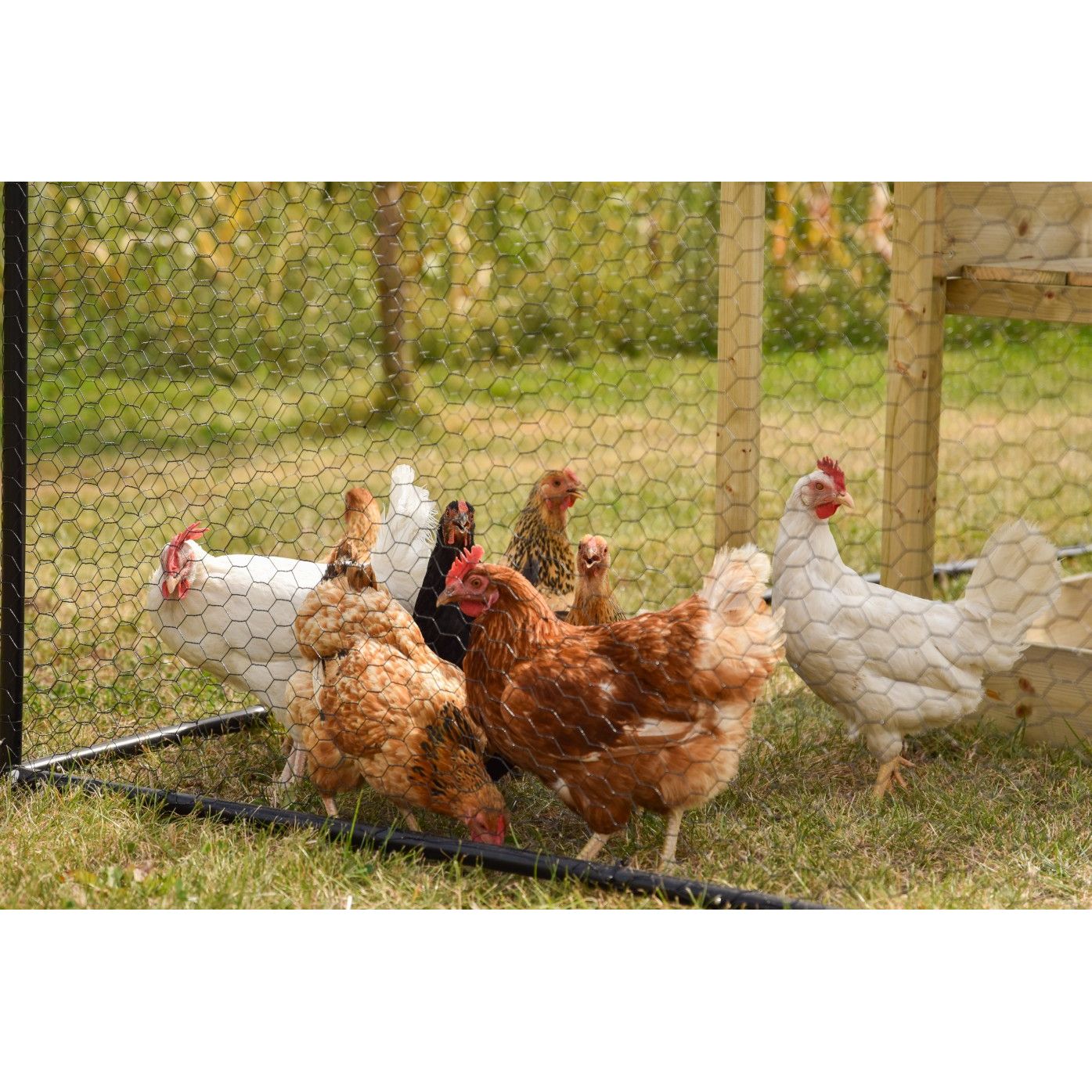 Aussenhühnerstall aus Drahtgitter im Garten, rechteckiger Hühnerlauf mit mehreren Hühnern, Holzfuttertrog und grüne Tränke auf Gras; Heuhaufen im Hintergrund.