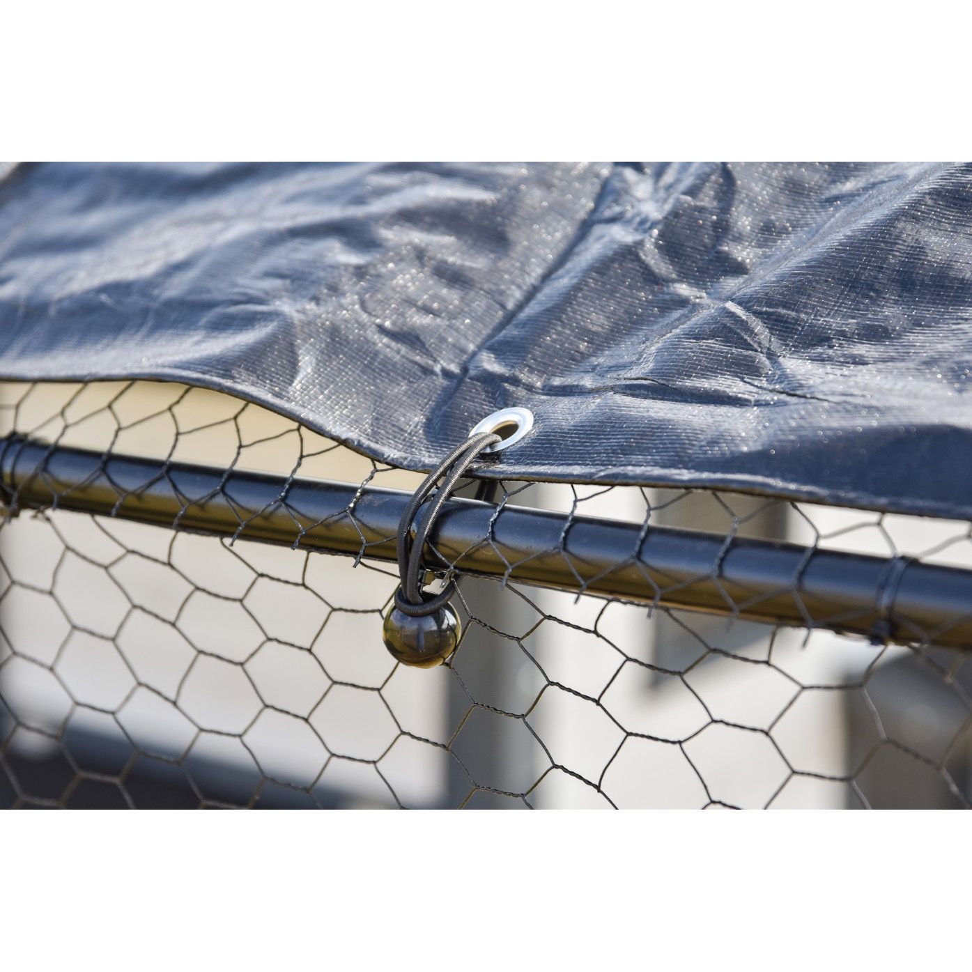 Nahaufnahme einer blauen Abdeckplane, die über einen Drahtgitterzaun gespannt ist, befestigt durch eine Metallöse und eine schwarze Bungee-Kordel mit einer kleinen schwarzen Kugel am Ende.