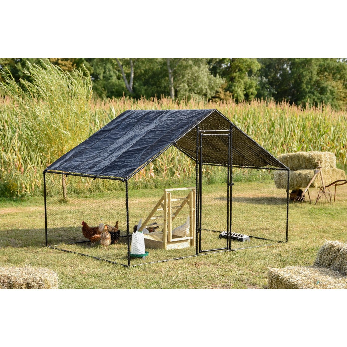 Hühnerstall-Gehege aus schwarzem Metallrahmen mit Planendach, auf einer Wiese neben Heuballen; Hühner im Gehege, sichtbare Futter- und Wasserbehälter, Maisfeld und Bäume im Hintergrund