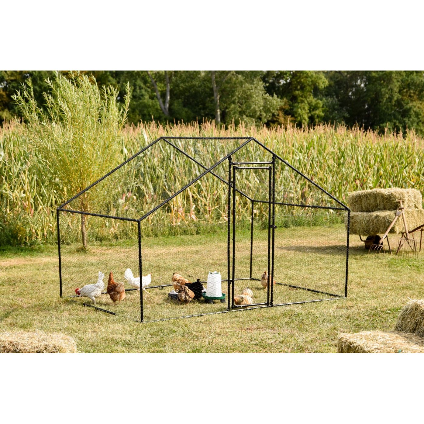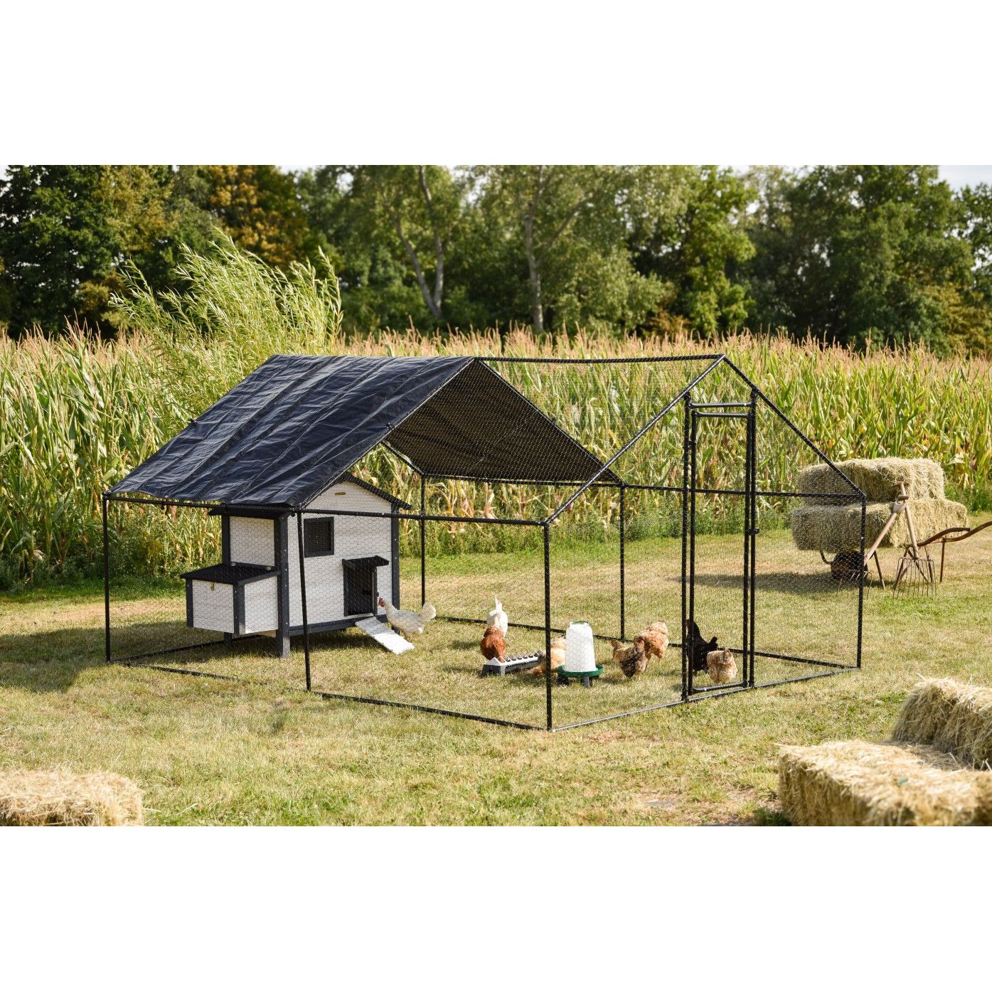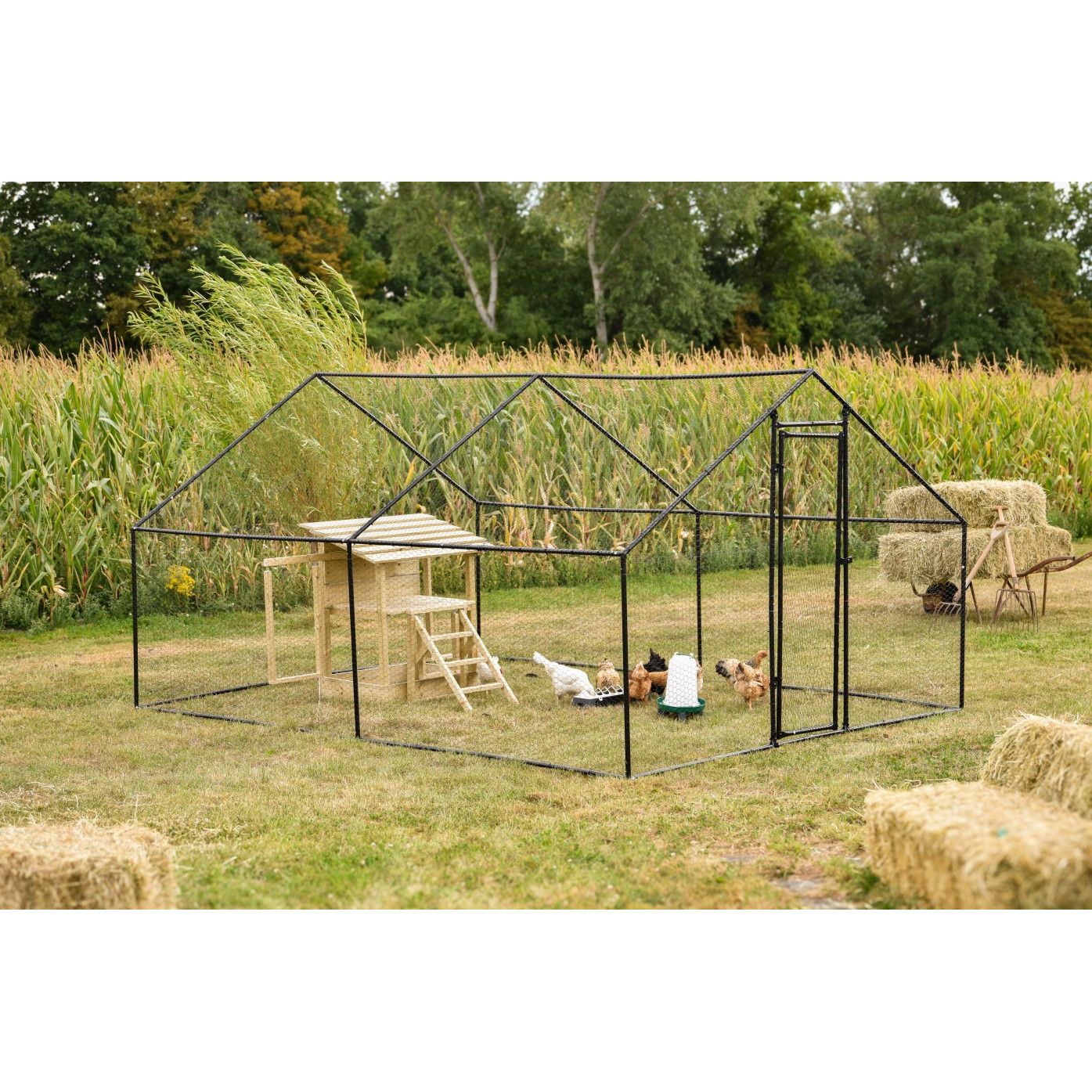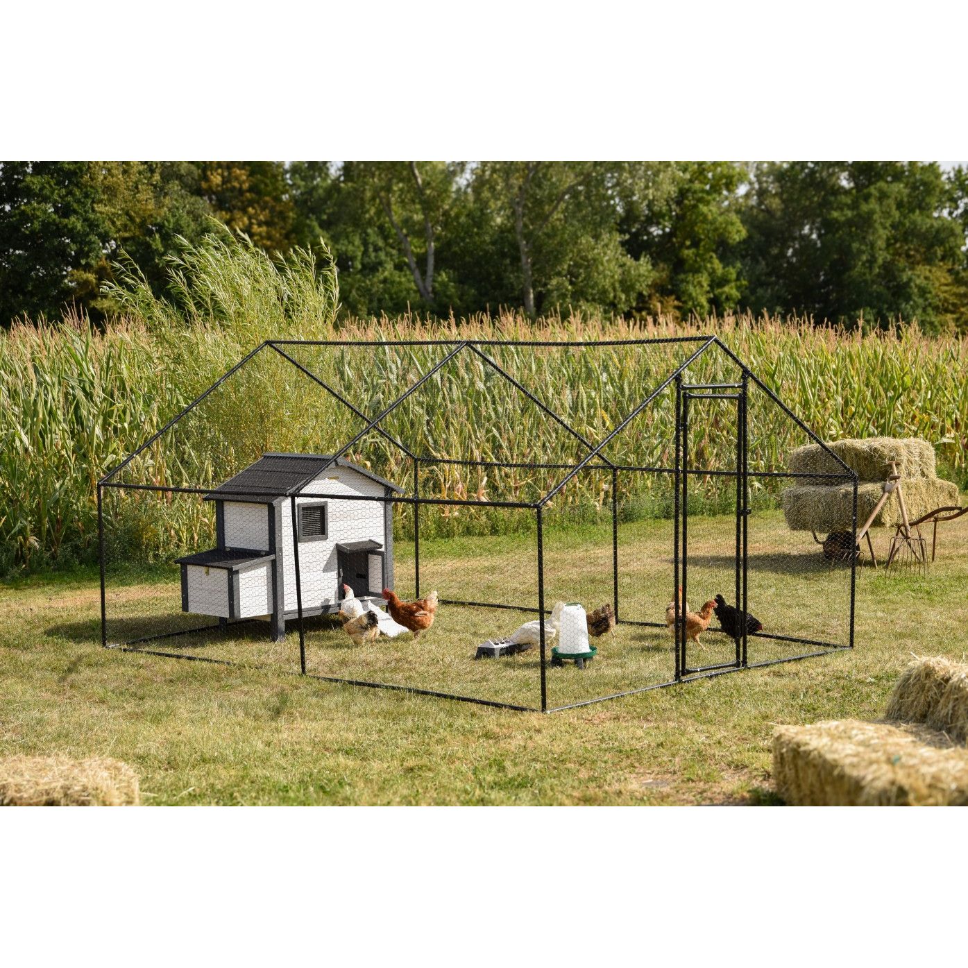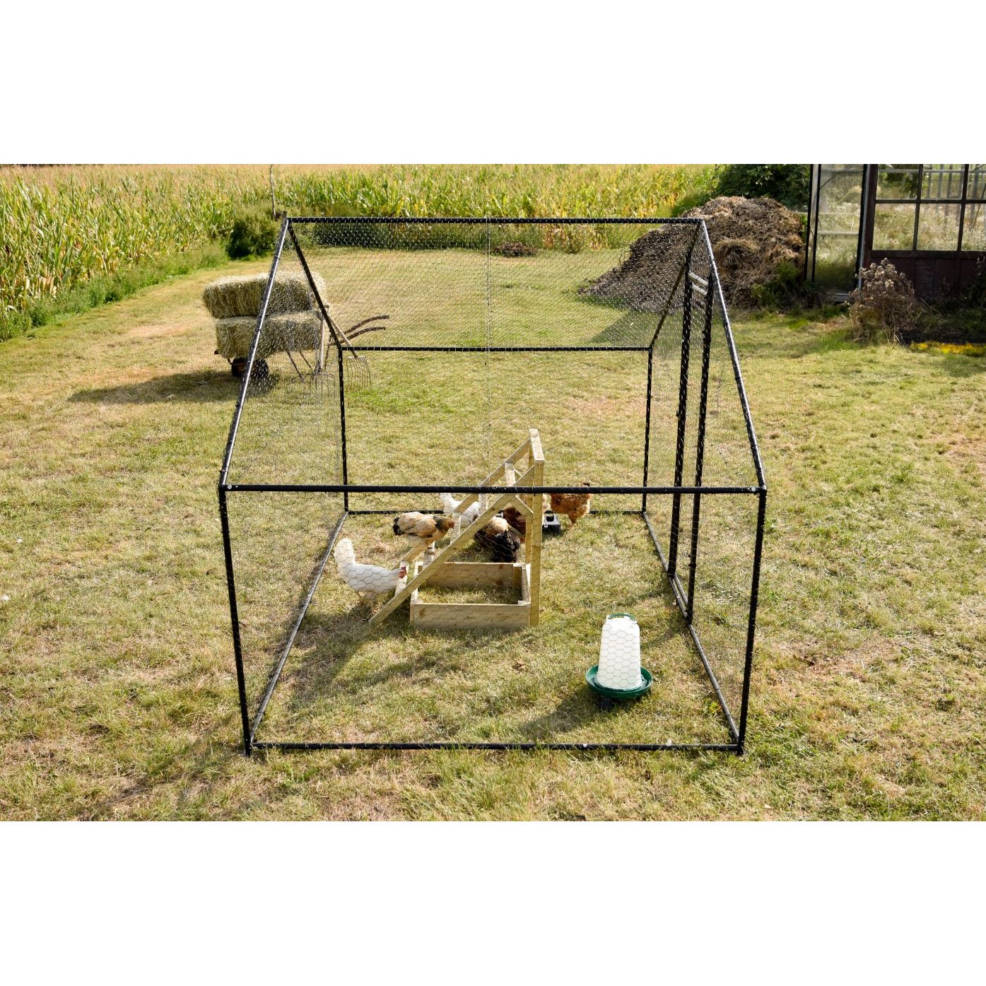 Aussen-Geflügelgehege aus schwarzem Metallrahmen mit weissem Hühnerstall, Hühnern, Wassertränke und Heuballen; Maisfeld im Hintergrund.