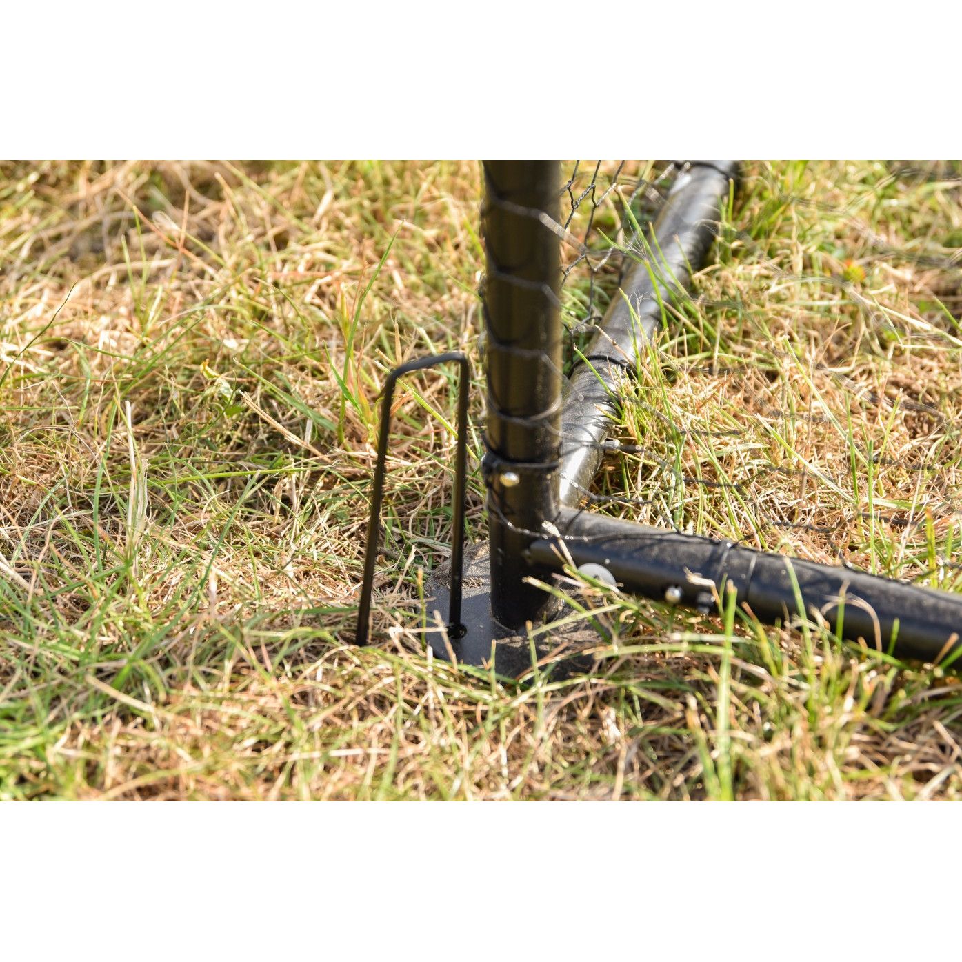 Metallbodenanker im Gras: Vertikaler Stab mit Erdanker und daneben schwarzer Gartenschlauch auf dem Boden.