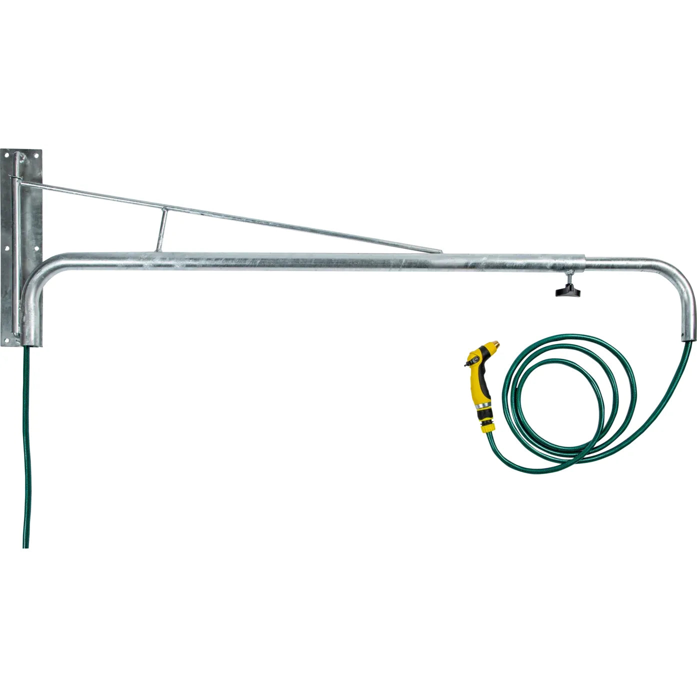 Grazie a un braccio girevole telescopico, la doccia a spruzzo per cavalli può essere allungata di 1 metro. Il robusto tubo dell'acqua è sufficientemente dimensionato per raggiungere facilmente tutte le aree di lavaggio. Il getto d'acqua può essere regolato sul soffione in dotazione a seconda dell'uso previsto e delle preferenze.