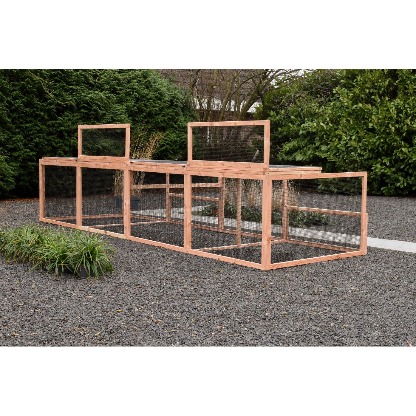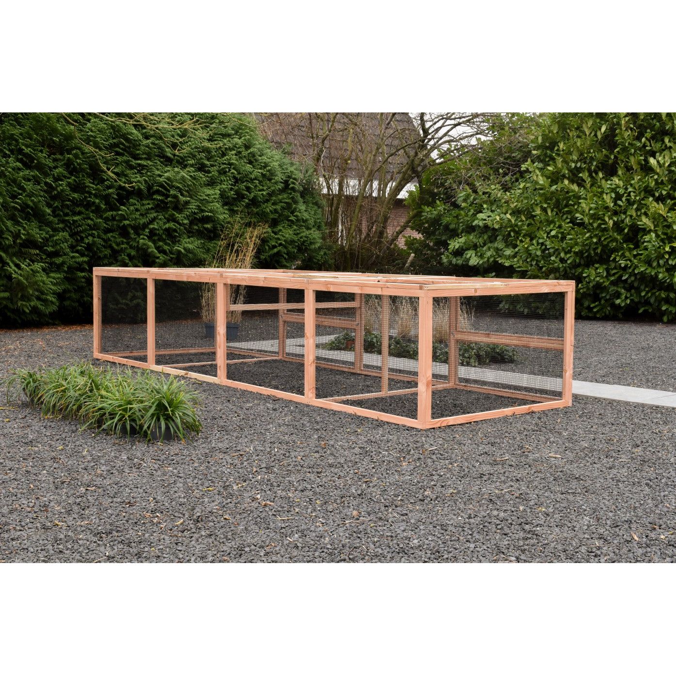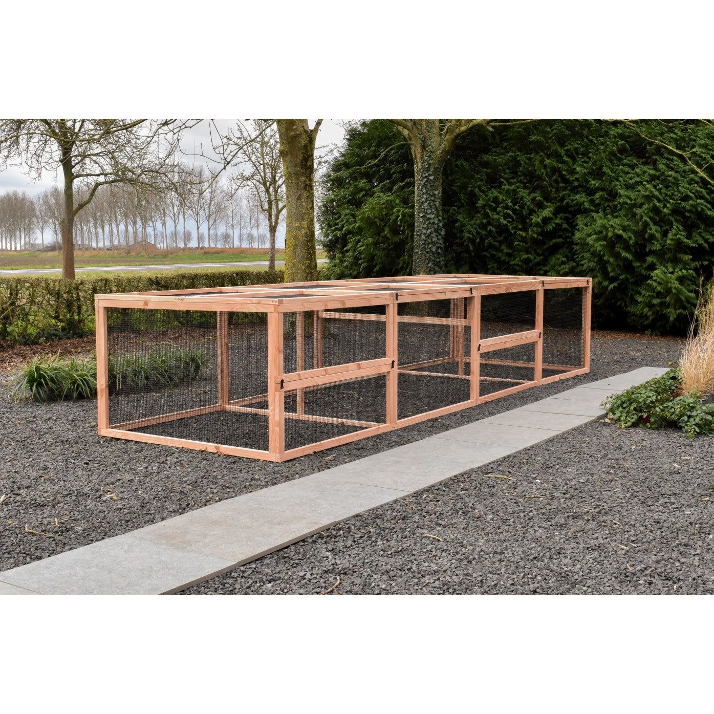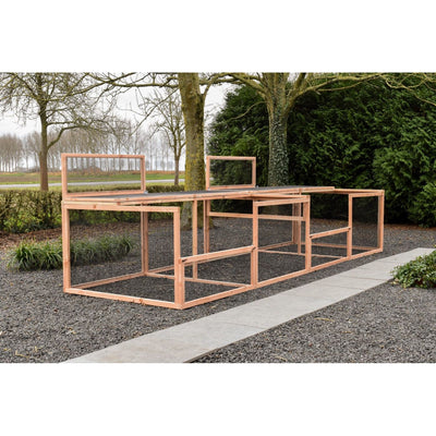 Grazie alla struttura stabile in abete Douglas non trattato o in abete impregnato che non richiede manutenzione, la gabbia è robusta e durevole. Per la versione in abete Douglas, si consiglia di trattare il legno con olio di abete Douglas per preservarne il colore; tuttavia, il legno può anche essere verniciato individualmente nel colore desiderato.