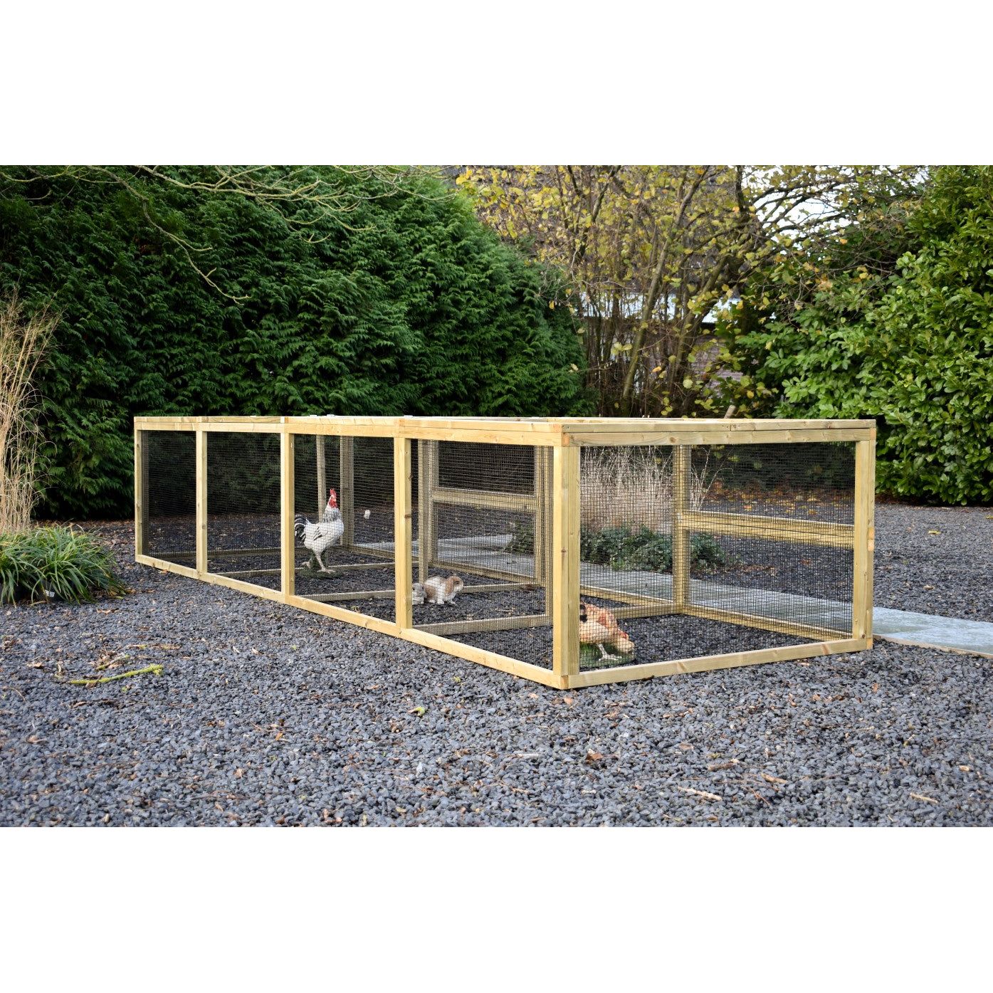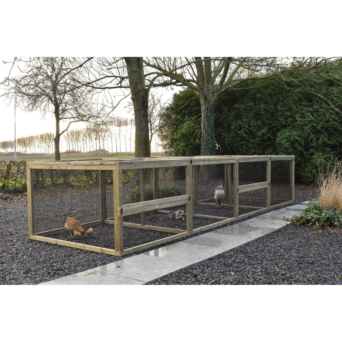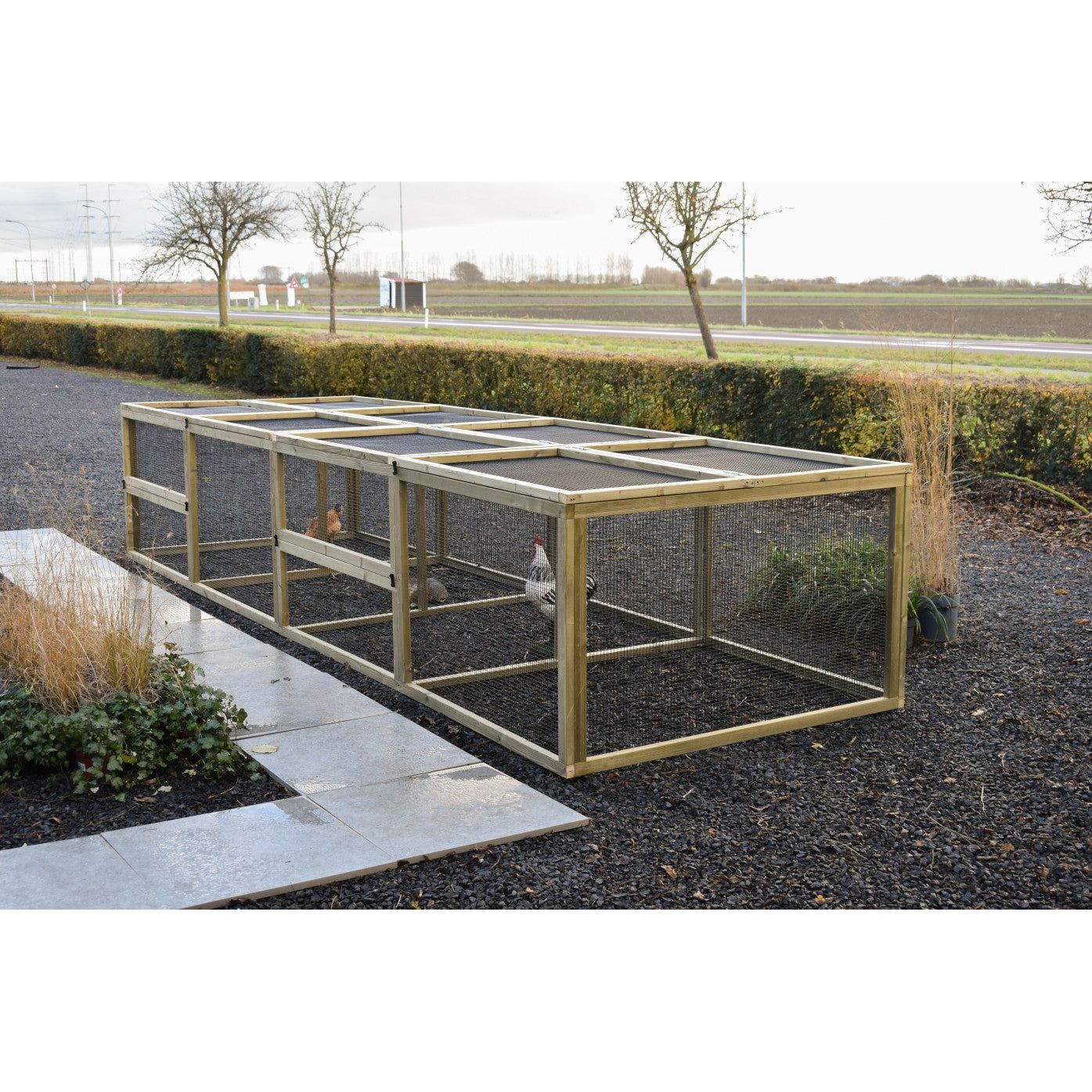 Grazie alla struttura stabile in abete Douglas non trattato o in abete impregnato che non richiede manutenzione, la gabbia è robusta e durevole. Per la versione in abete Douglas, si consiglia di trattare il legno con olio di abete Douglas per preservarne il colore; tuttavia, il legno può anche essere verniciato individualmente nel colore desiderato.