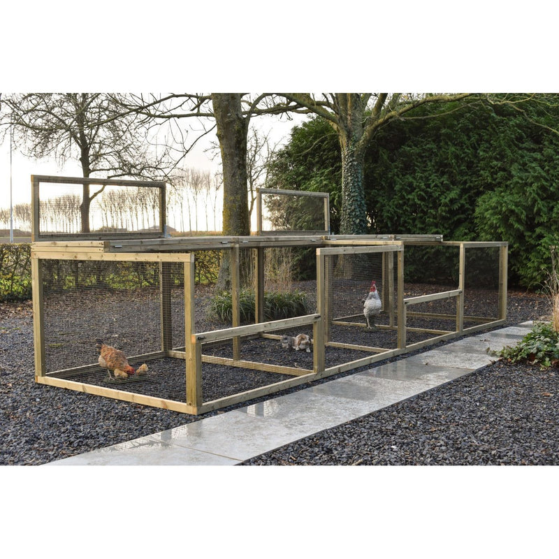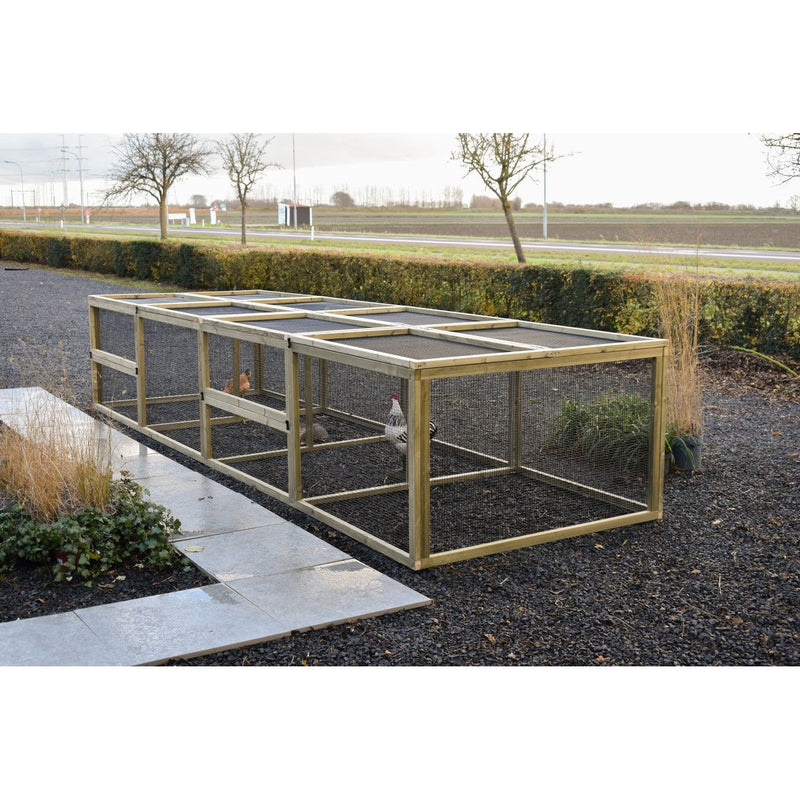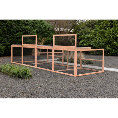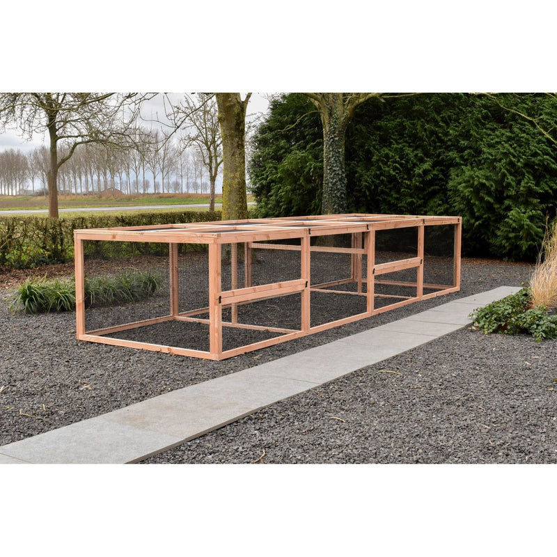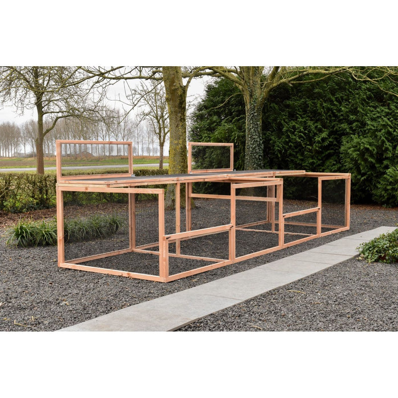 Il recinto Eggy offre a gatti, conigli o galline uno spazio esterno riparato e spazioso. Con i suoi 4,6 metri di lunghezza, offre un'ampia libertà di movimento, sia per grattarsi, che per giocare o sonnecchiare. Il modello viene fornito senza conigliera notturna ed è ideale come aggiunta alle conigliere esistenti o per farvi trascorrere la giornata.