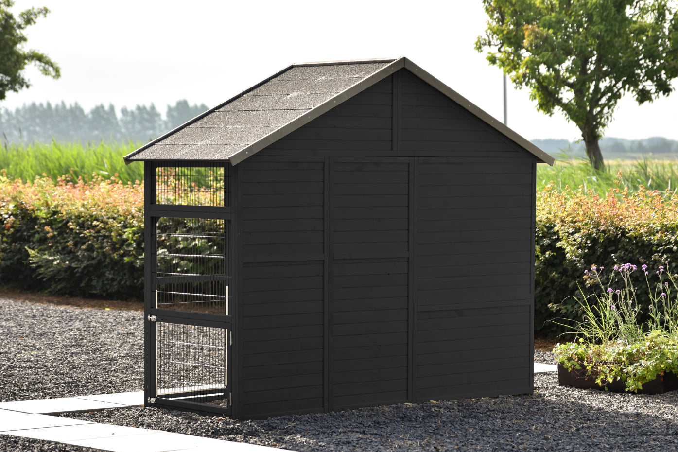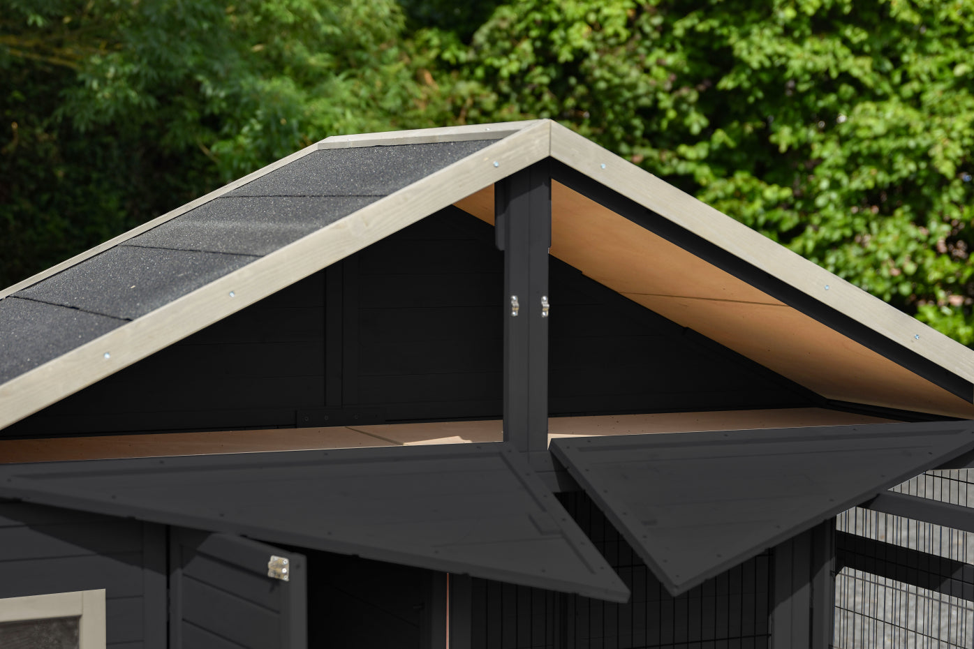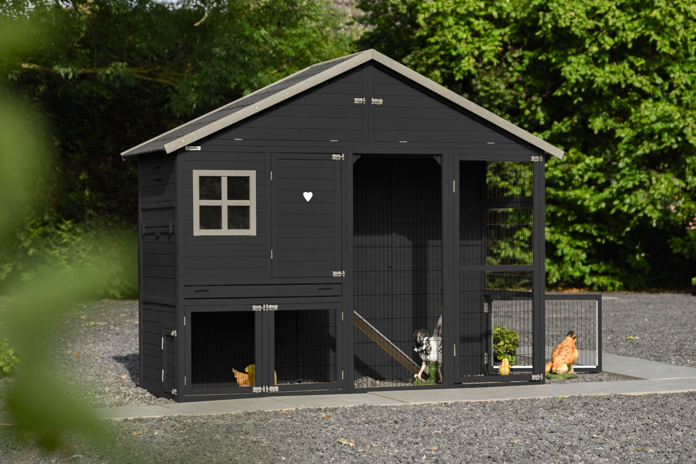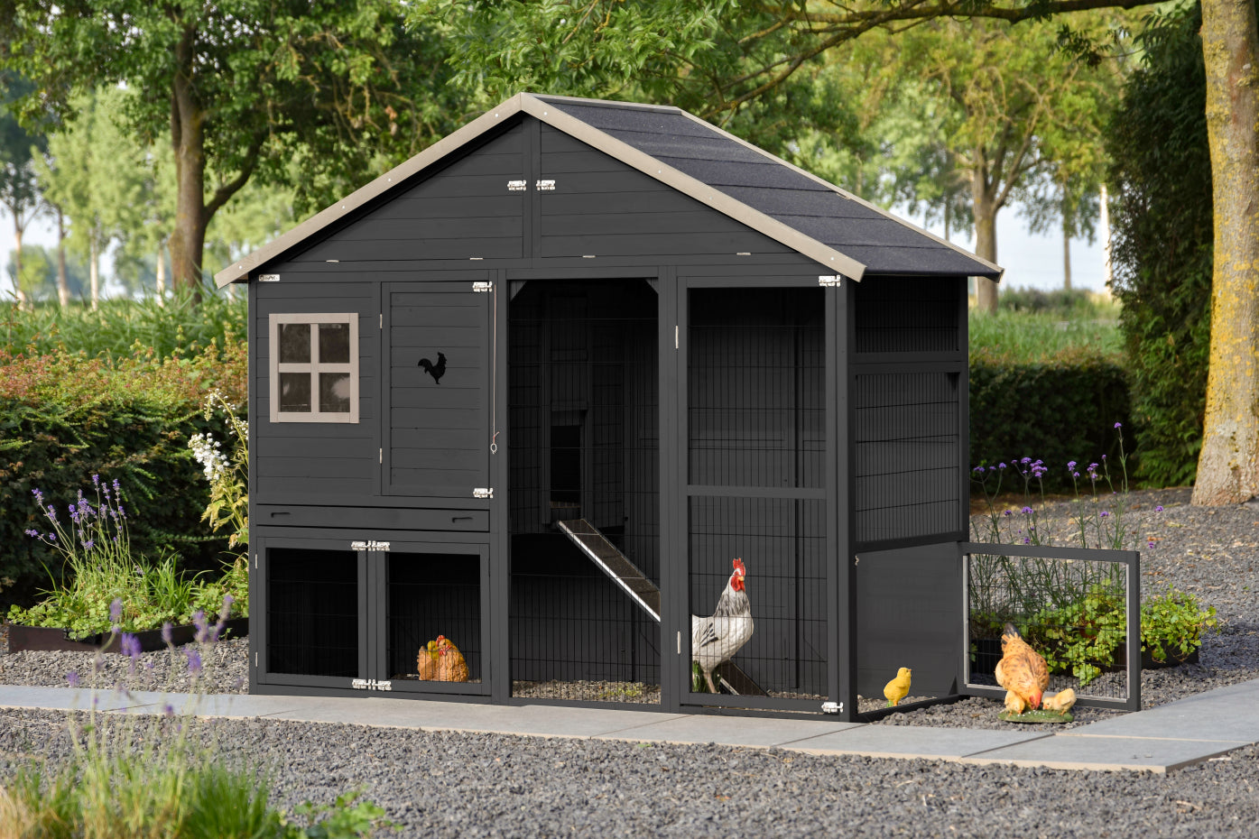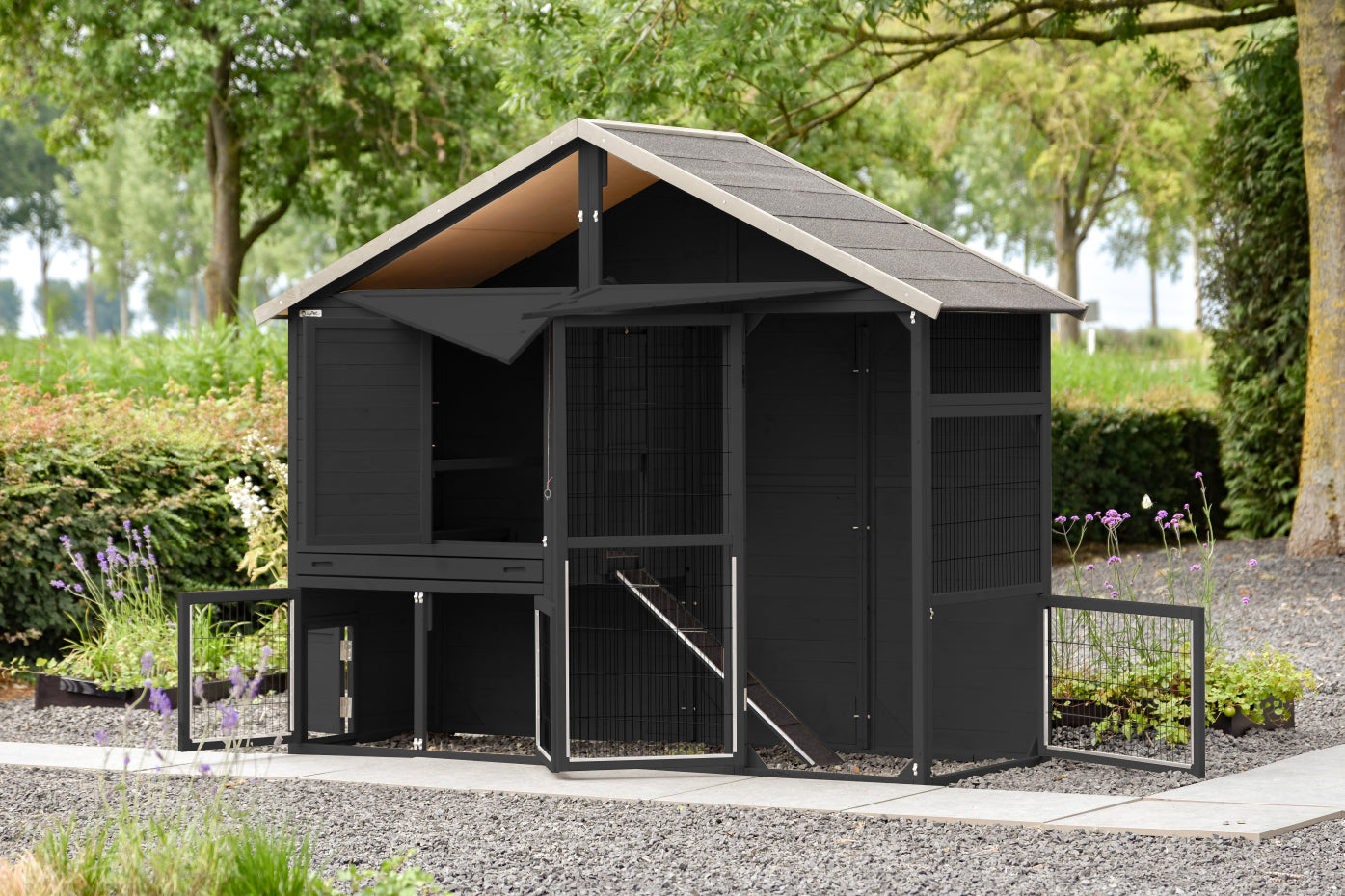 Il pollaio Holiday Large Black è spazioso, pratico ed esteticamente accattivante. La solida parete posteriore in legno e la parete laterale chiusa con sportello offrono ai polli un'ulteriore protezione. La stia è dotata di un corridoio e di una zona notte chiudibile con 2 posatoi. Sotto il tetto c'è un ampio spazio per riporre le galline, facilmente accessibile dalla parte anteriore. La stia è adatta per circa 6-10 polli.
