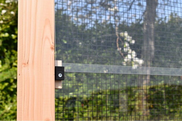 Ein Metall-Schieber verbindet den Stall mit der Voliere und ermöglicht eine einfache und sichere Handhabung.