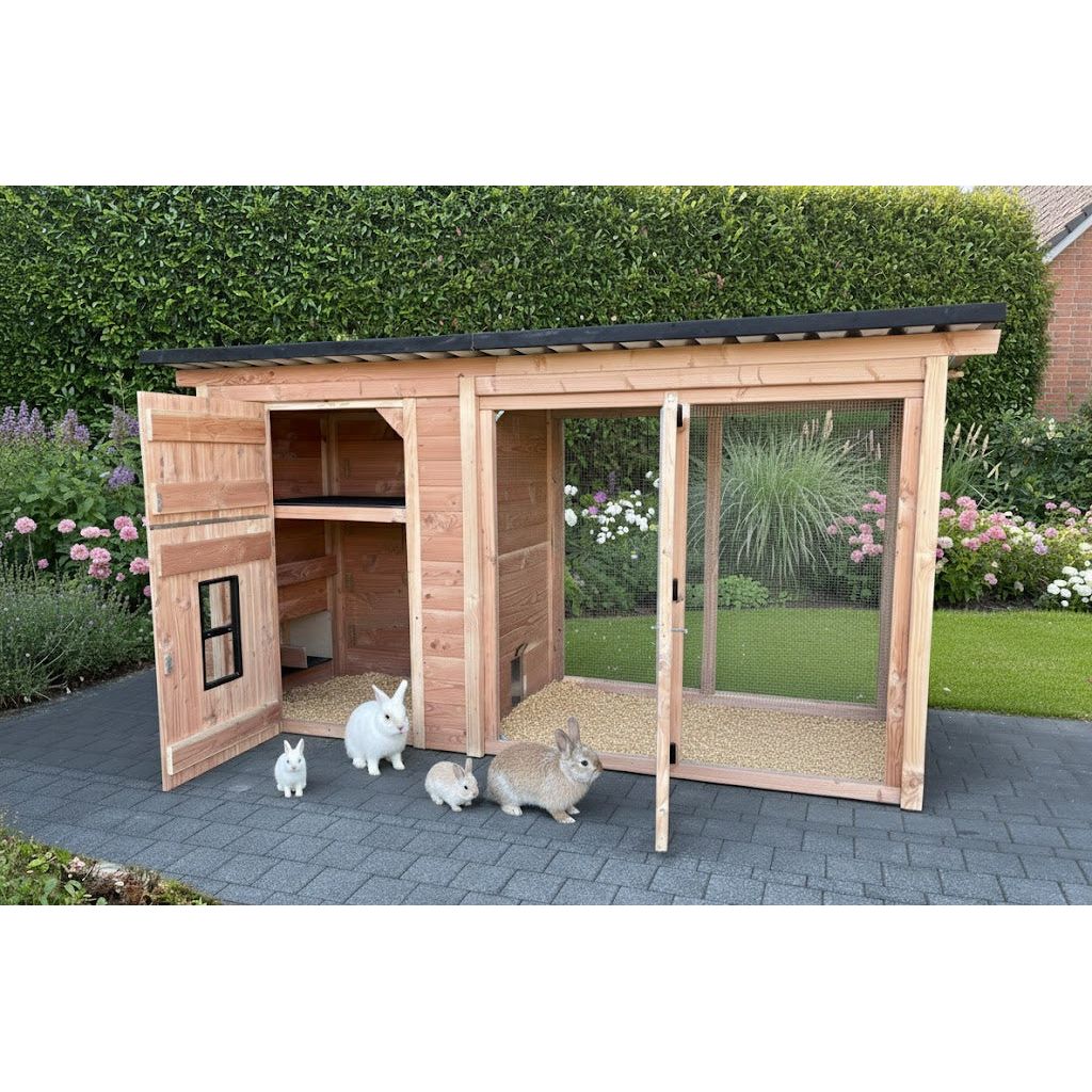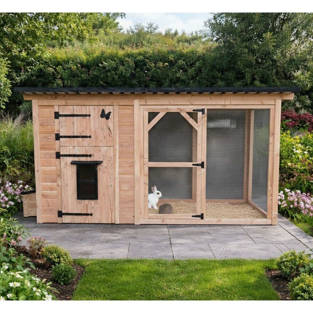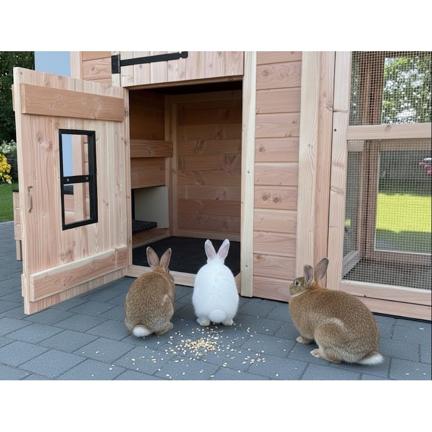 Dieser Kaninchenstall vereint natürliche Materialien, praktische Funktionen und eine stabile Bauweise – ideal für alle, die ihren Kaninchen ein sicheres und komfortables Zuhause bieten möchten. Gefertigt aus langlebigem Douglasienholz, überzeugt der Stall durch seine robuste Struktur und sein harmonisches Erscheinungsbild im Garten.