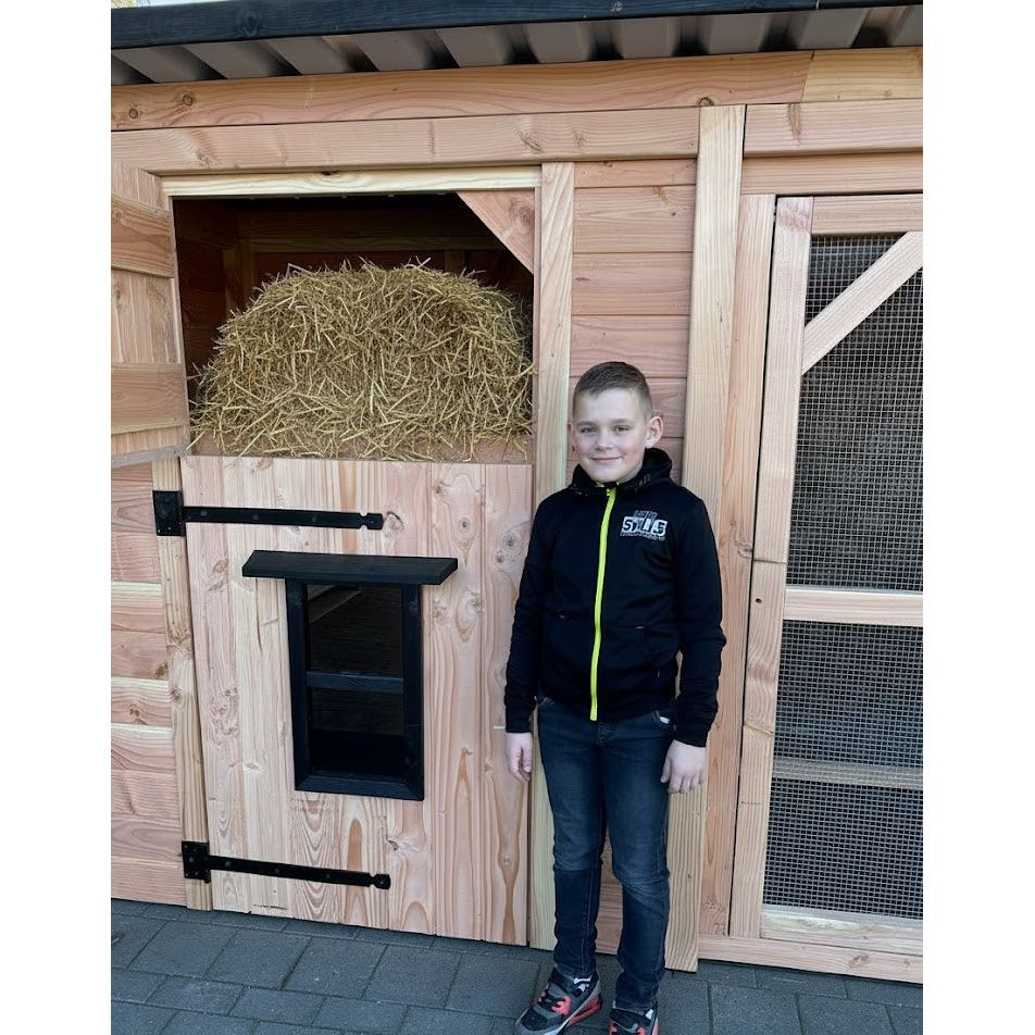Die grosszügige Doppeltüre lässt sich bequem mit einem Schlüssel abschliessen und sorgt so für optimalen Schutz vor ungebetenen Gästen. Im oberen Bereich befindet sich ein praktischer Stauraum – perfekt zur Aufbewahrung von Futter, Heu, Stroh, Hobelspänen.