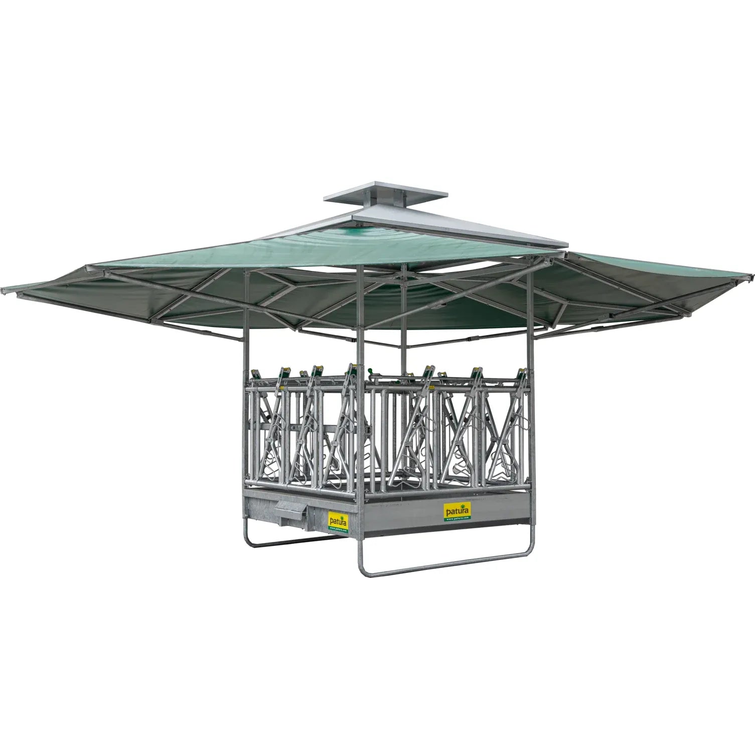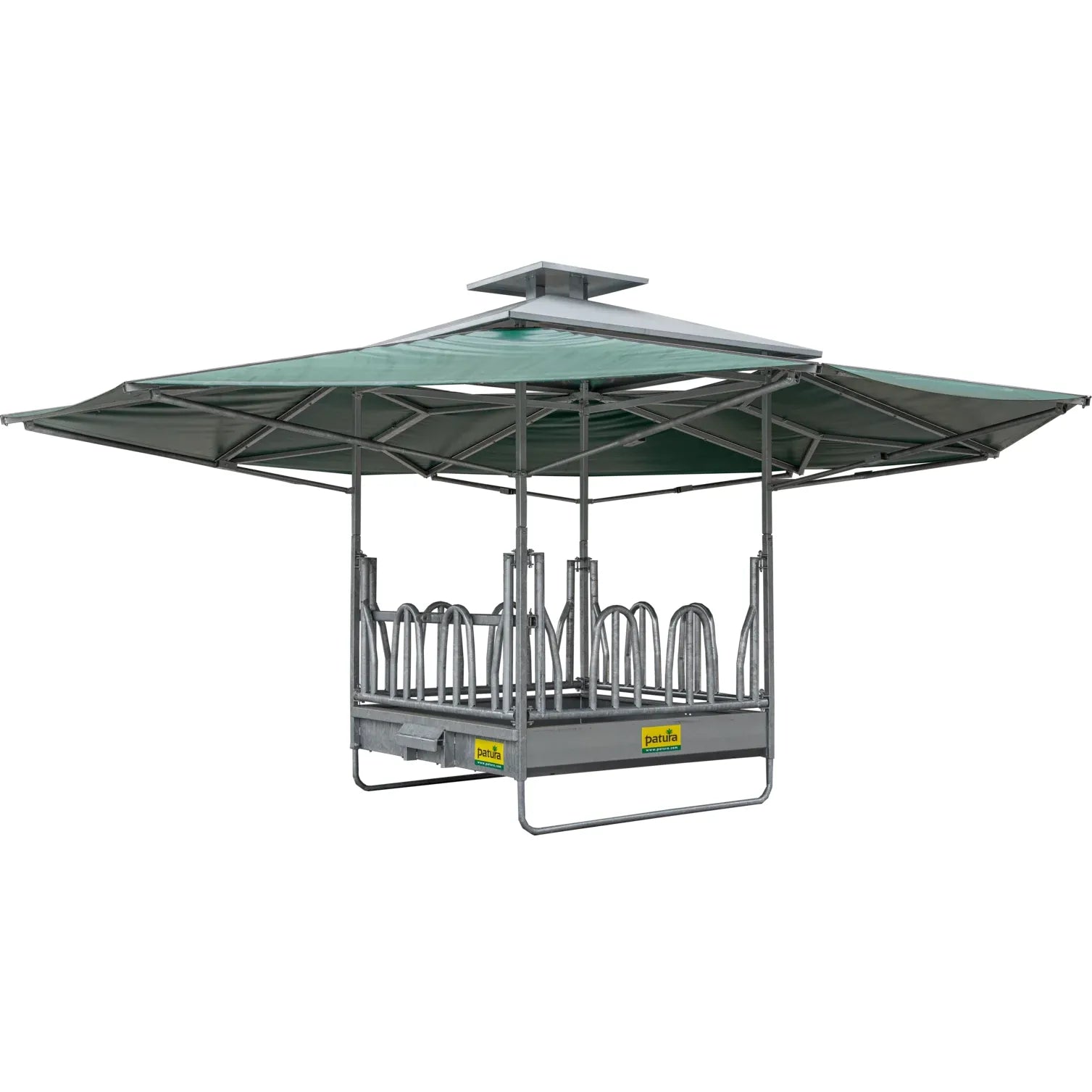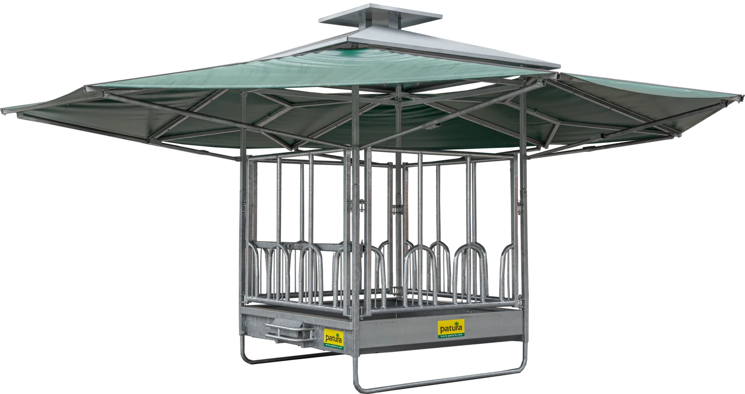 Die neue Klima-Raufe basiert auf den bewährten Profi-Viereckraufen. Das Dach für die Klima-Raufe lässt sich mit allen sechs Fressgittervarianten kombinieren. Diese innovative Dachkonstruktion wird direkt auf den Grundrahmen der Raufe aufgebaut. Aufgrund der speziellen Bauweise bietet die Raufe eine sehr grosse Dachfläche (36m²) und sorgt dank des eingebauten Kamines für einen angenehmen Kühlungseffekt. Durch die Kaminwirkung wird immer eine Luftbewegung erzeugt, die ein angenehmes Klima für die Tiere schafft und zusätzlich lästige Fliegen fernhält. Für Rinder und Pferde entsteht so ein attraktiver Platz zur Futteraufnahme mit gleichzeitigem Schutz vor direkter Sonneneinstrahlung und Regen.