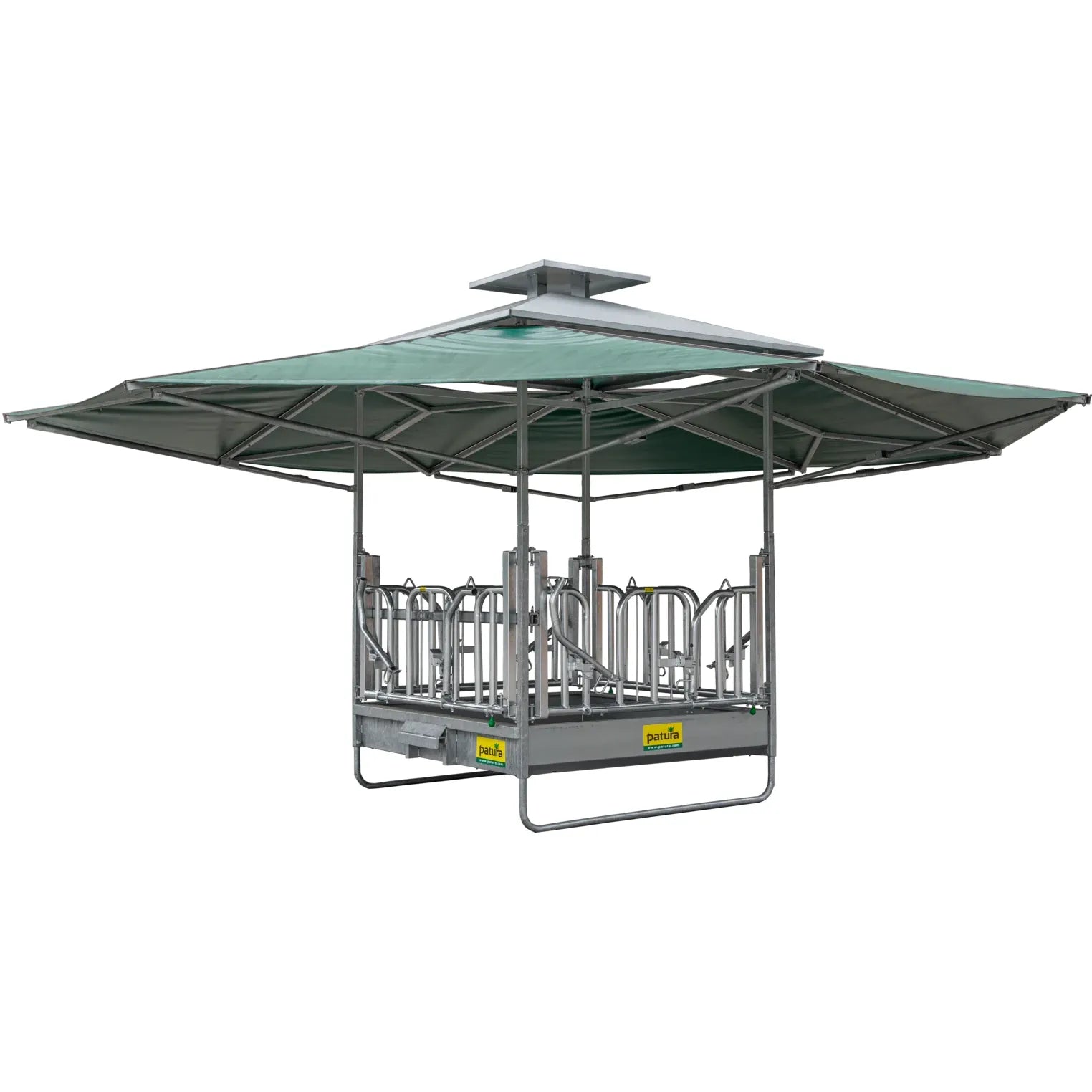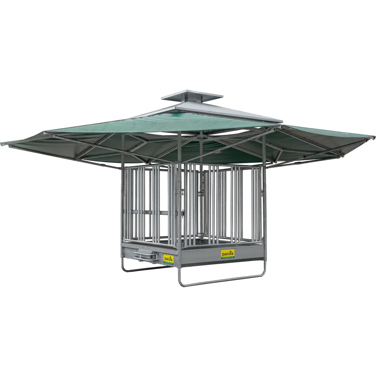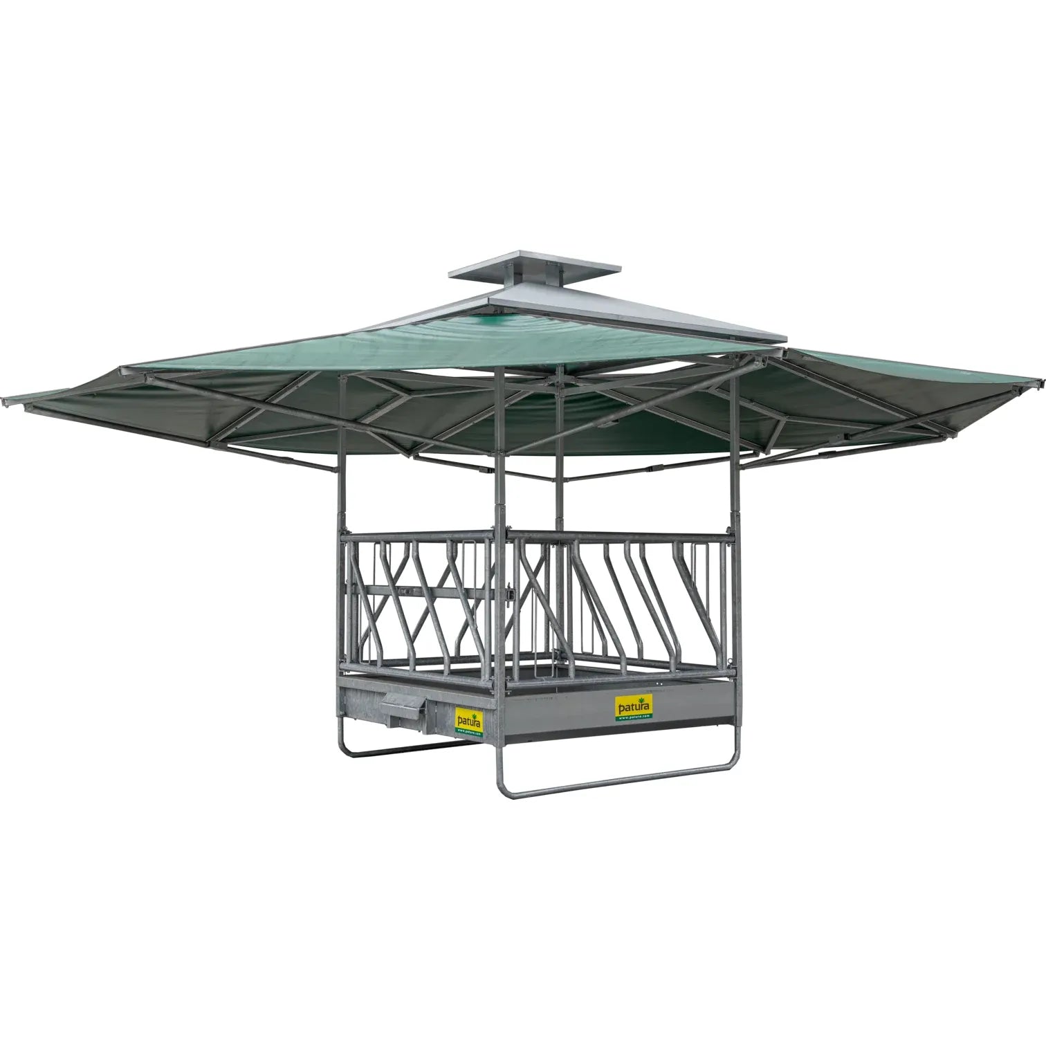 Die neue Klima-Raufe basiert auf den bewährten Profi-Viereckraufen. Das Dach für die Klima-Raufe lässt sich mit allen sechs Fressgittervarianten kombinieren. Diese innovative Dachkonstruktion wird direkt auf den Grundrahmen der Raufe aufgebaut. Aufgrund der speziellen Bauweise bietet die Raufe eine sehr grosse Dachfläche (36m²) und sorgt dank des eingebauten Kamines für einen angenehmen Kühlungseffekt. Durch die Kaminwirkung wird immer eine Luftbewegung erzeugt, die ein angenehmes Klima für die Tiere schafft und zusätzlich lästige Fliegen fernhält. Für Rinder und Pferde entsteht so ein attraktiver Platz zur Futteraufnahme mit gleichzeitigem Schutz vor direkter Sonneneinstrahlung und Regen.