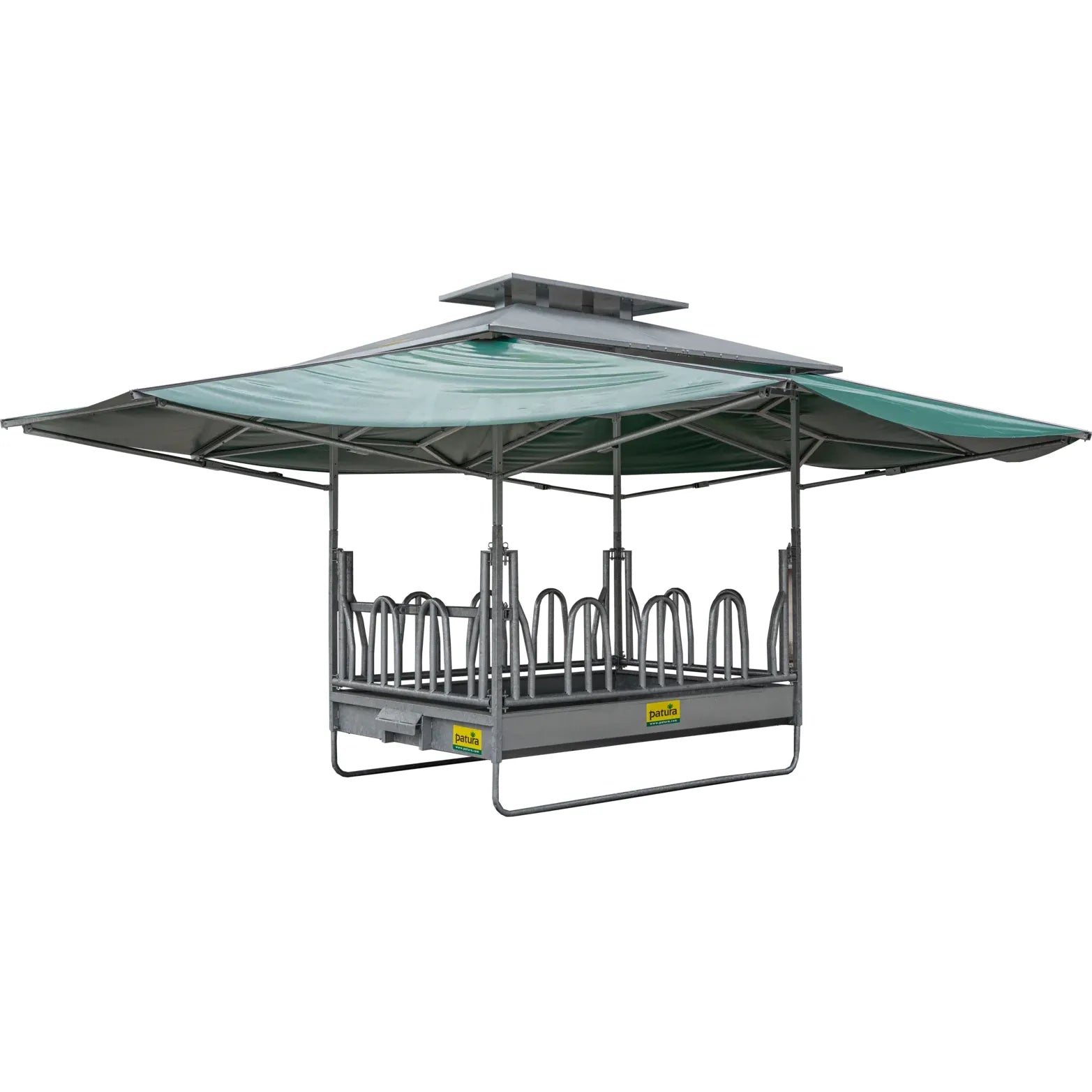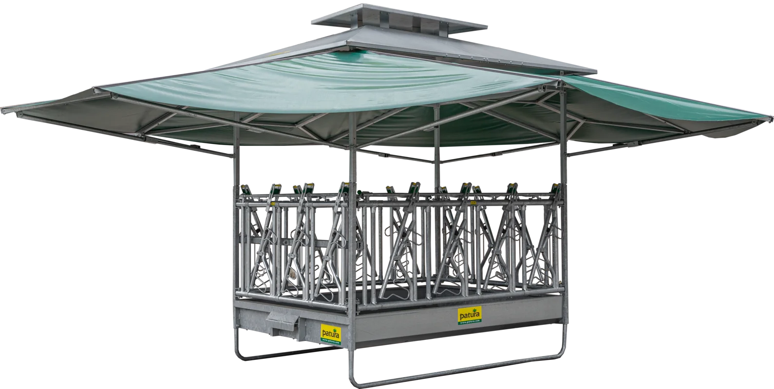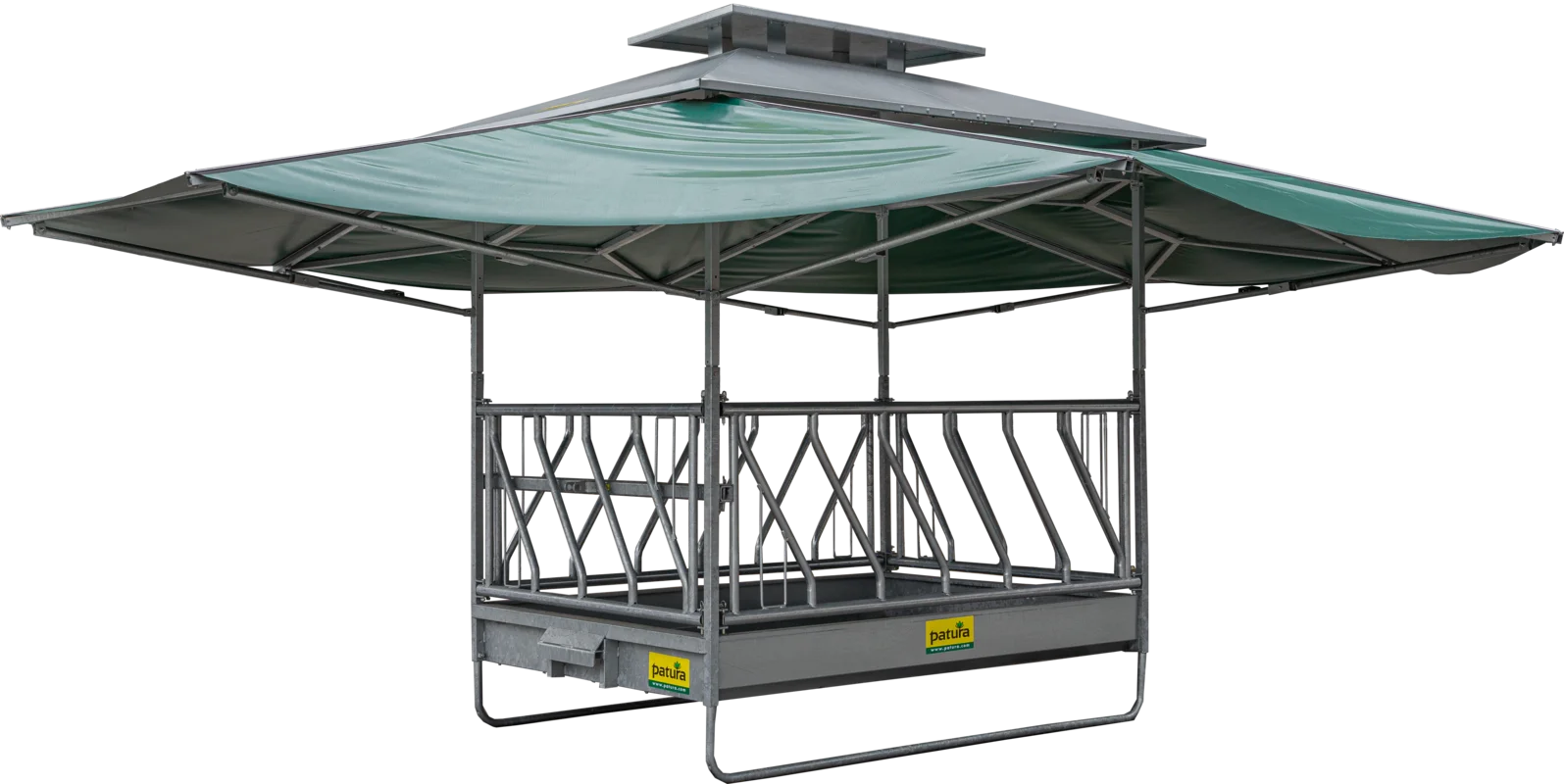 Das neue PATURA Klima-Dach für die Grossballenraufen macht die Realisierung von Tierwohl so einfach wie noch nie, denn gleich zwei Grundbedürfnisse von Weidetieren werden hier kombiniert: der Zugang zu Futter und der Witterungsschutz. Bis zu 16 Tiere können wahlweise mit zwei Rundballen oder einem Quaderballen mit Raufutter versorgt werden, während zeitgleich die enorme Dachfläche von 42 m² das hochwertige Futter sowie die Tiere vor direkter Sonneneinstrahlung und vor Regen schützt. Der im Dach integrierte Kamin erzeugt eine natürliche Luftströmung, warme Luft kann nach oben abziehen, kühlere Luft strömt von unten nach. Das durch den ständigen Luftaustausch entstehende Kleinklima sorgt für eine geringere Insektenbelastung und einen angenehmen Temperaturunterschied an heissen Tagen. Da der Vertritt der Grasnarbe im Bereich um die Raufe verringert wird, muss diese seltener versetzt werden. Soll sie doch einmal bewegt werden, kann dies einfach, nach Einklappen der Seitenteile, über die Dreipunkt-Anhängung des Traktors erfolgen. Mit einer Einfahrhöhe von 2,50 m kann die Raufe wie gehabt mit einem geeigneten Frontlader befüllt werden.