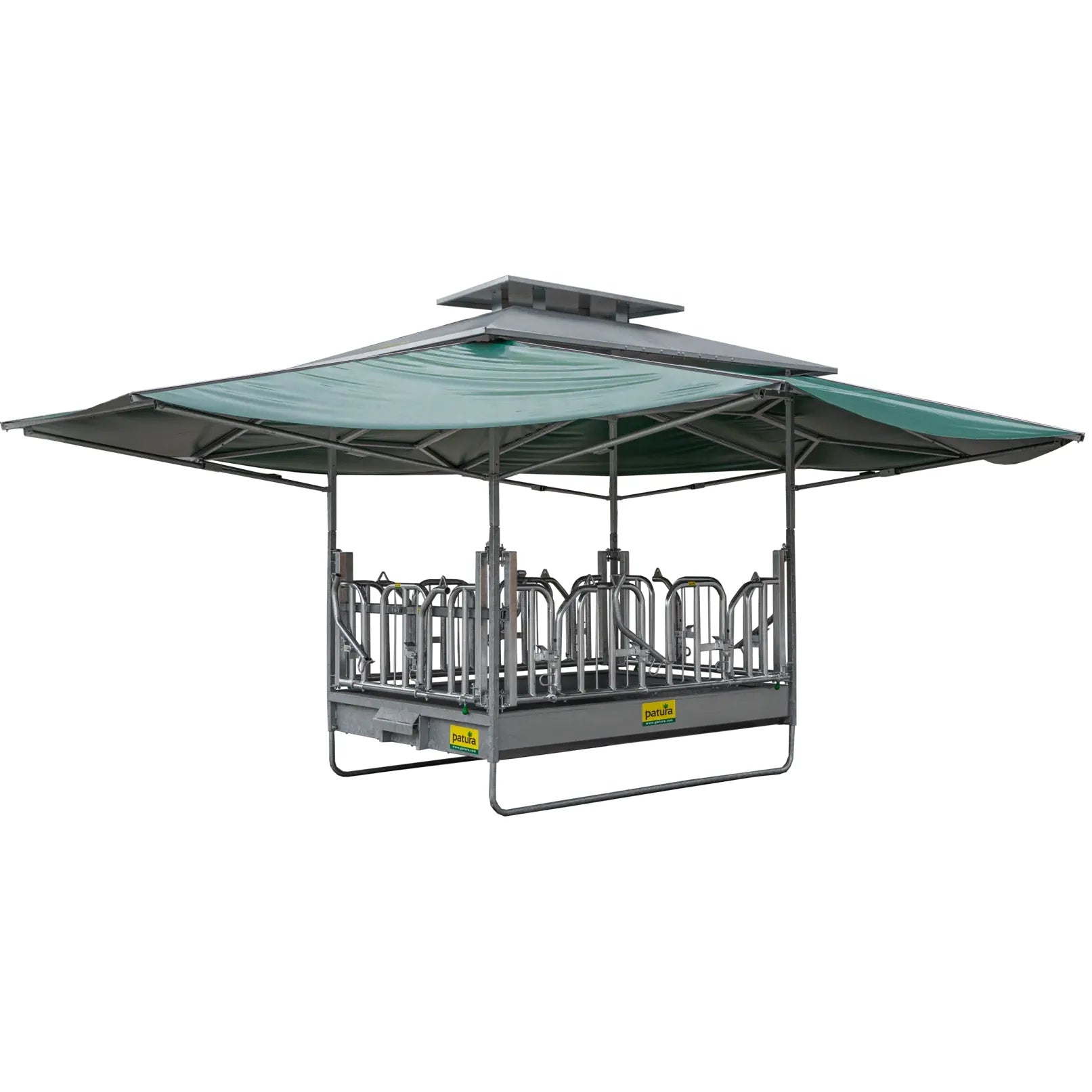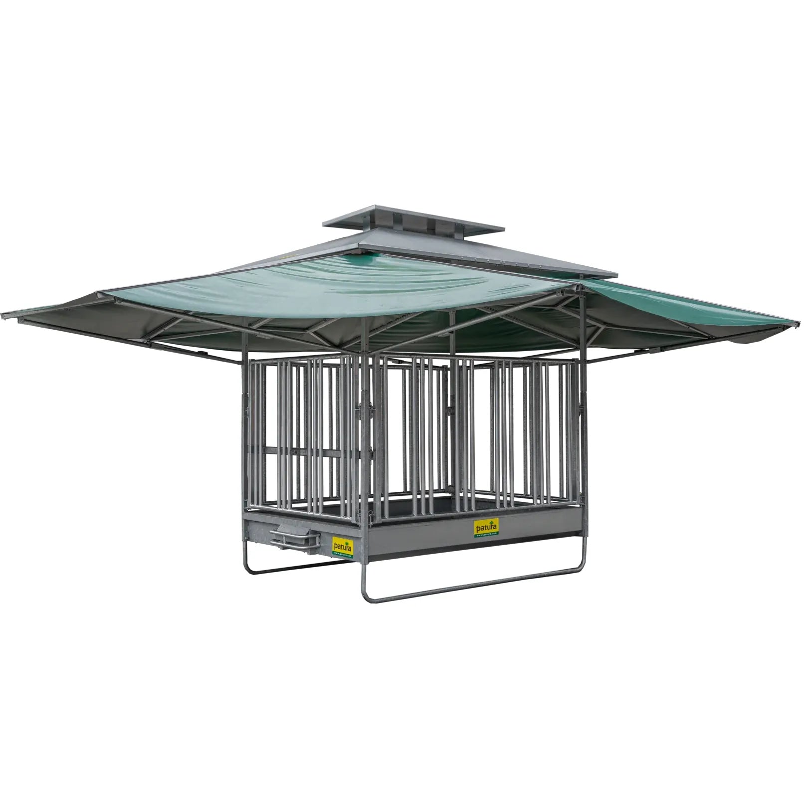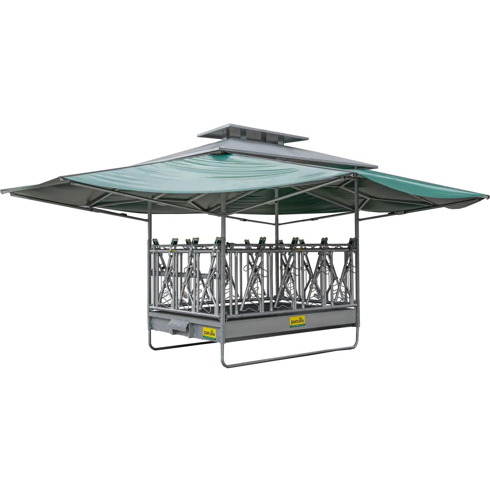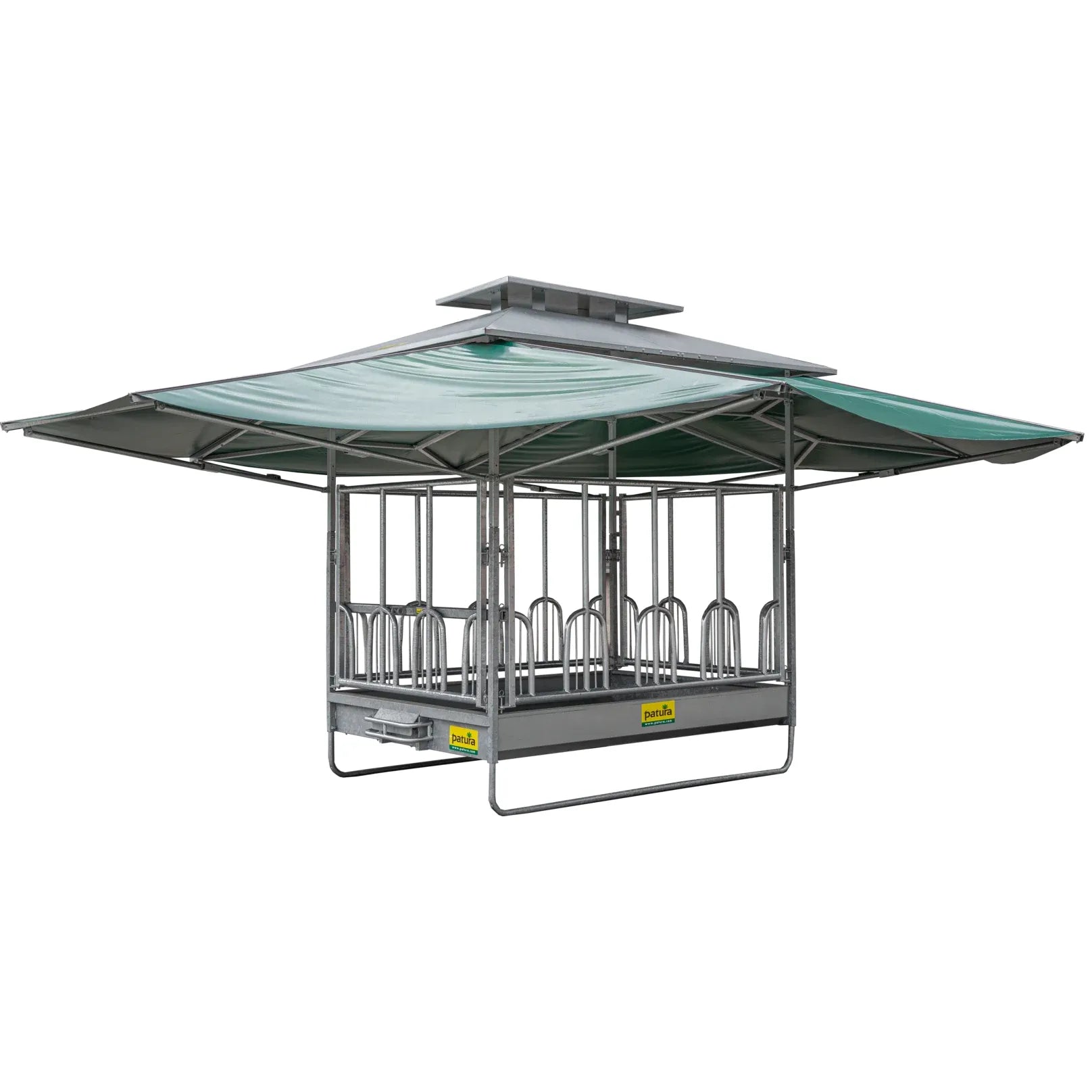 Das neue PATURA Klima-Dach für die Grossballenraufen macht die Realisierung von Tierwohl so einfach wie noch nie, denn gleich zwei Grundbedürfnisse von Weidetieren werden hier kombiniert: der Zugang zu Futter und der Witterungsschutz. Bis zu 16 Tiere können wahlweise mit zwei Rundballen oder einem Quaderballen mit Raufutter versorgt werden, während zeitgleich die enorme Dachfläche von 42 m² das hochwertige Futter sowie die Tiere vor direkter Sonneneinstrahlung und vor Regen schützt. Der im Dach integrierte Kamin erzeugt eine natürliche Luftströmung, warme Luft kann nach oben abziehen, kühlere Luft strömt von unten nach. Das durch den ständigen Luftaustausch entstehende Kleinklima sorgt für eine geringere Insektenbelastung und einen angenehmen Temperaturunterschied an heissen Tagen. Da der Vertritt der Grasnarbe im Bereich um die Raufe verringert wird, muss diese seltener versetzt werden. Soll sie doch einmal bewegt werden, kann dies einfach, nach Einklappen der Seitenteile, über die Dreipunkt-Anhängung des Traktors erfolgen. Mit einer Einfahrhöhe von 2,50 m kann die Raufe wie gehabt mit einem geeigneten Frontlader befüllt werden.
