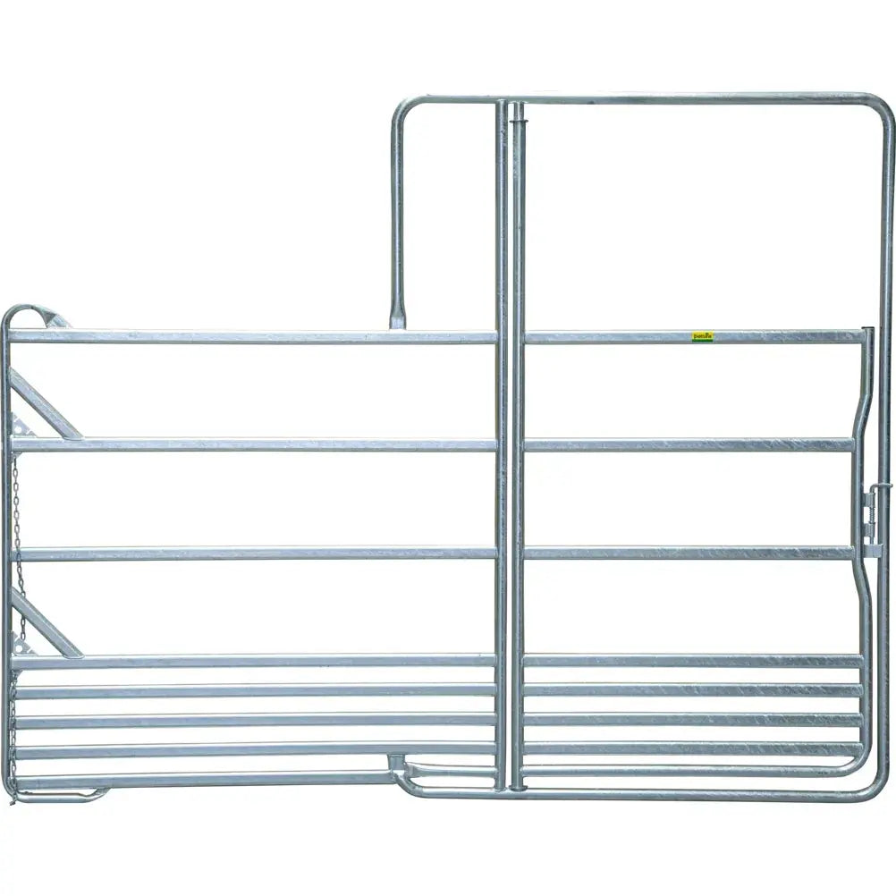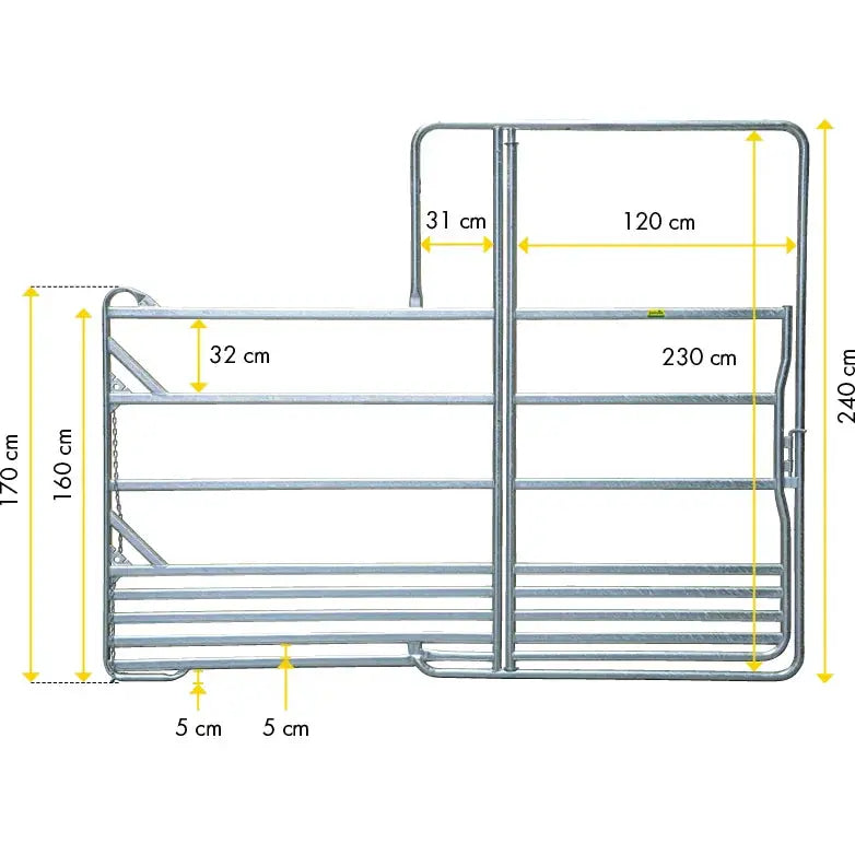 Dieses Zaunelement Panel ist ein stabiles, komplett feuerverzinktes Panel mit Tor. Das Panel bietet höchste Stabilität bei geringem Gewicht. Der Federriegel ermöglicht ein sicheres Verschliessen der Tor. Optimale Standsicherheit im Gelände und Möglichkeit des Verrutschens durch Füsse in Kufenfom. Schnelle Verbindung der Panels auch in unebenem Gelände durch Kettenverschluss mit Edelstahl-Schraubglied. Kein Abrutschen der Beine aufspringender Pferde zwischen den Panels durch hochgezogene Endrohre.