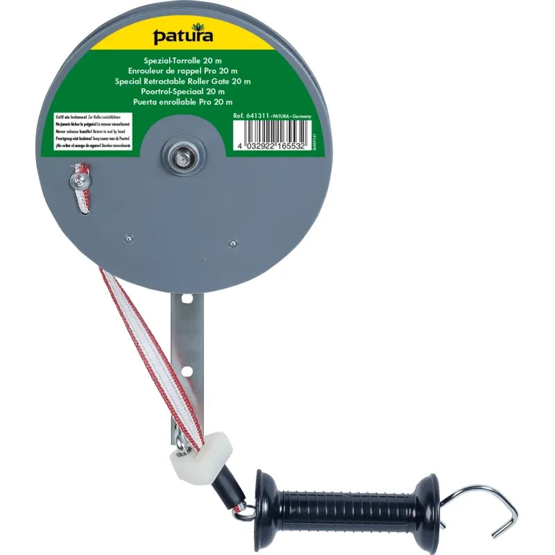 Professionelle und robuste Torrollen für den täglichen Einsatz. Zum Einrichten von flexiblen Toren und Abtrennungen an Weiden, Treibwegen und Paddocks. Das 20 mm Breitband rollt sich selbsttätig wieder auf die Rolle. Inklusive Edelstahl-Torgriffisolator.