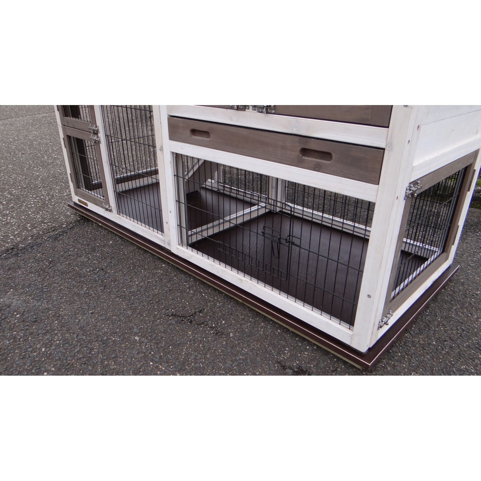 Kaninchenstall aus weissem Holz mit Drahtgitterwänden, steht auf Asphalt; offener unterer Bereich mit Metallboden.