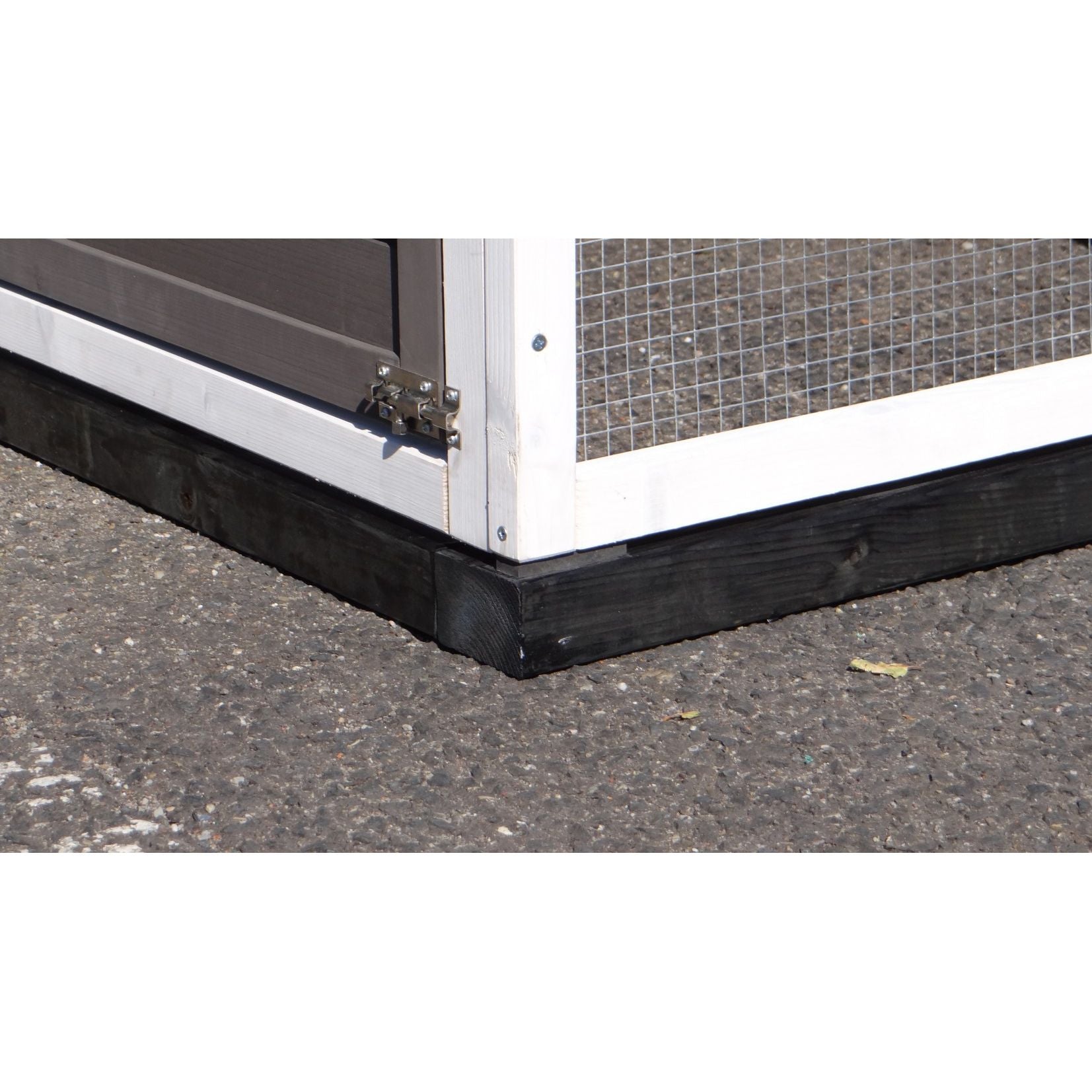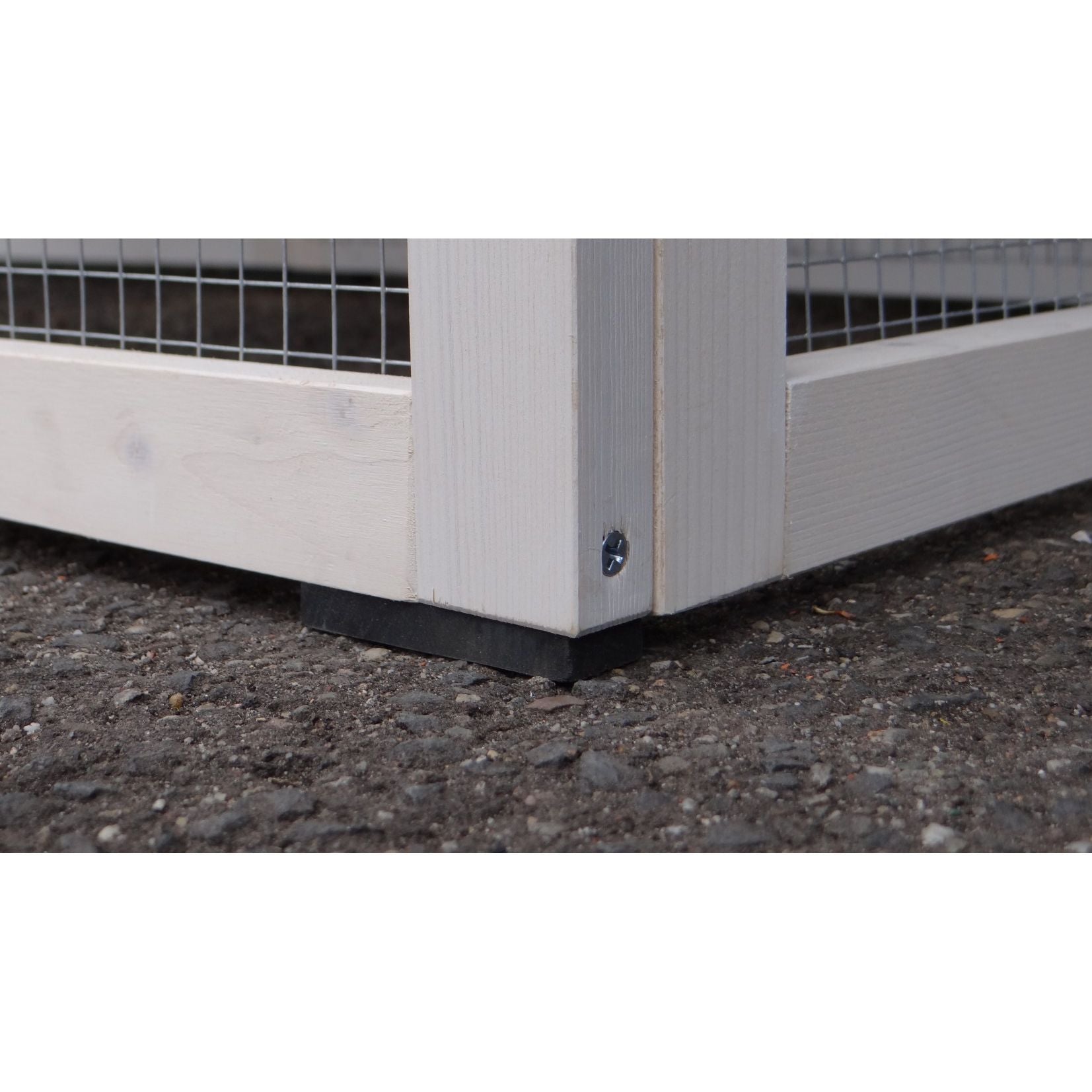Eckansicht eines Kleintiergeheges: weisser Holzrahmen mit Drahtgitterseite, Türscharnier am unteren Rahmen, schwarzer Sockel auf Asphalt.