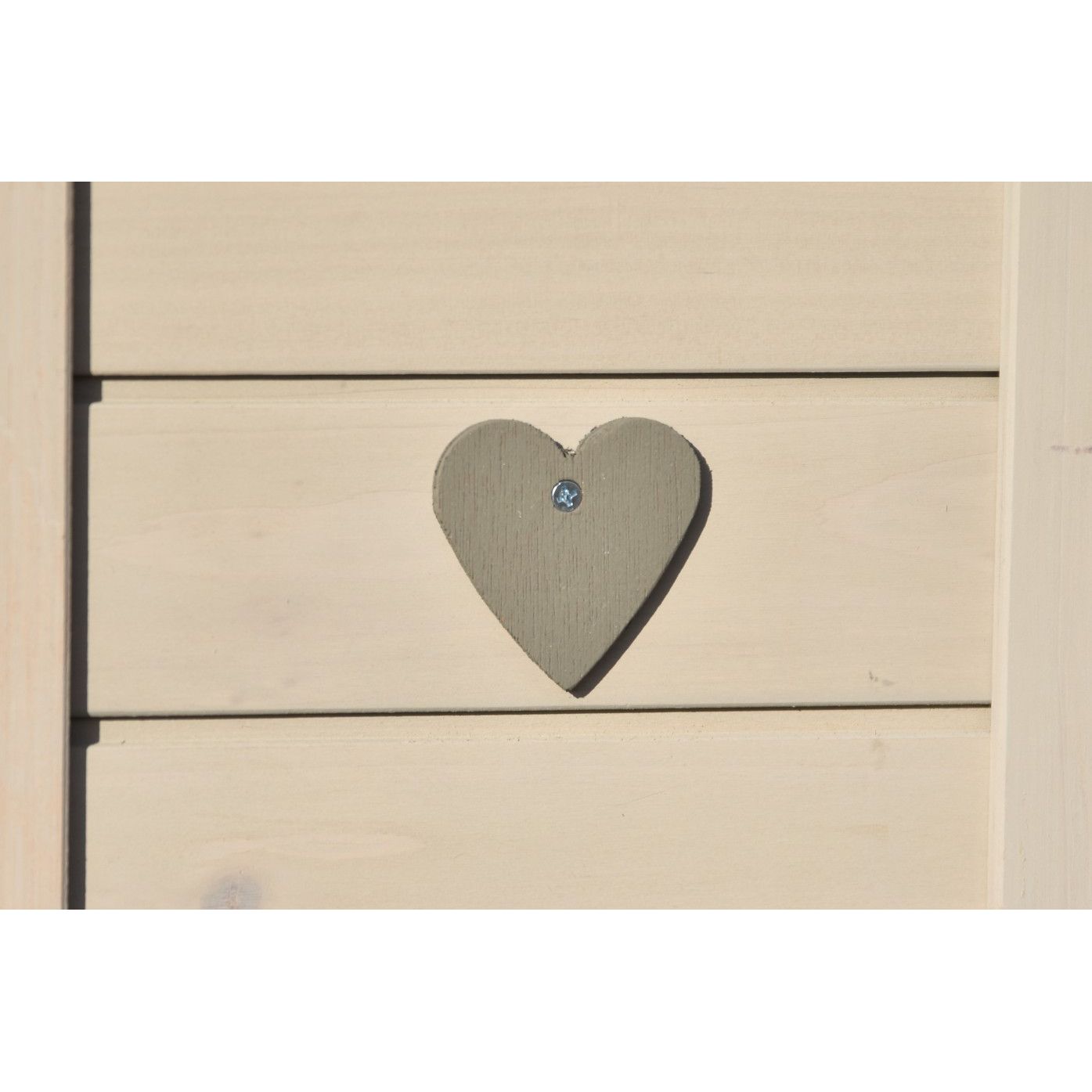 Nahaufnahme eines grauen Holzherzens, das an einem hellen Holzpaneel befestigt ist, mit Schraubenkopf in der Mitte.