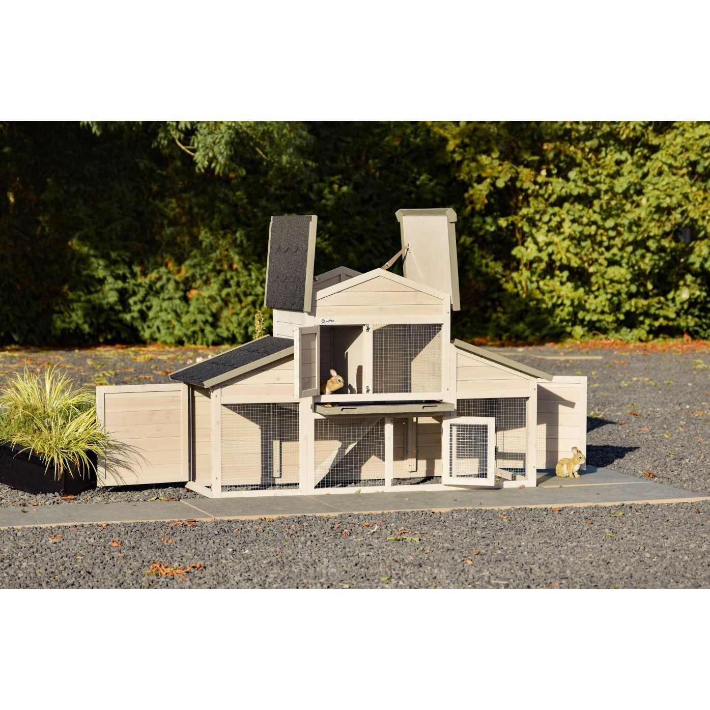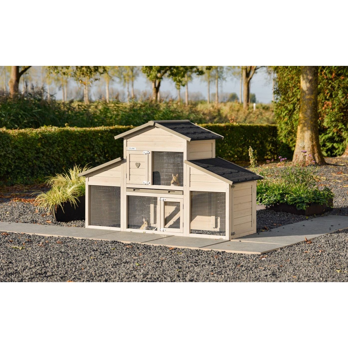 Mehrstöckiger Kaninchenstall aus hellem Holz mit Drahtgittertüren und schwarzem Schindeldach, im Garten auf Kiesboden, umgeben von Hecken und Bäumen.