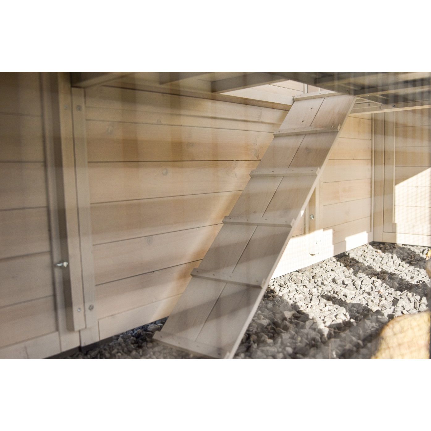 Holztreppe mit Stufen als Rampe lehnt diagonal an der Holzfassade eines Garten-Schuppens; Kiesboden im Vordergrund.