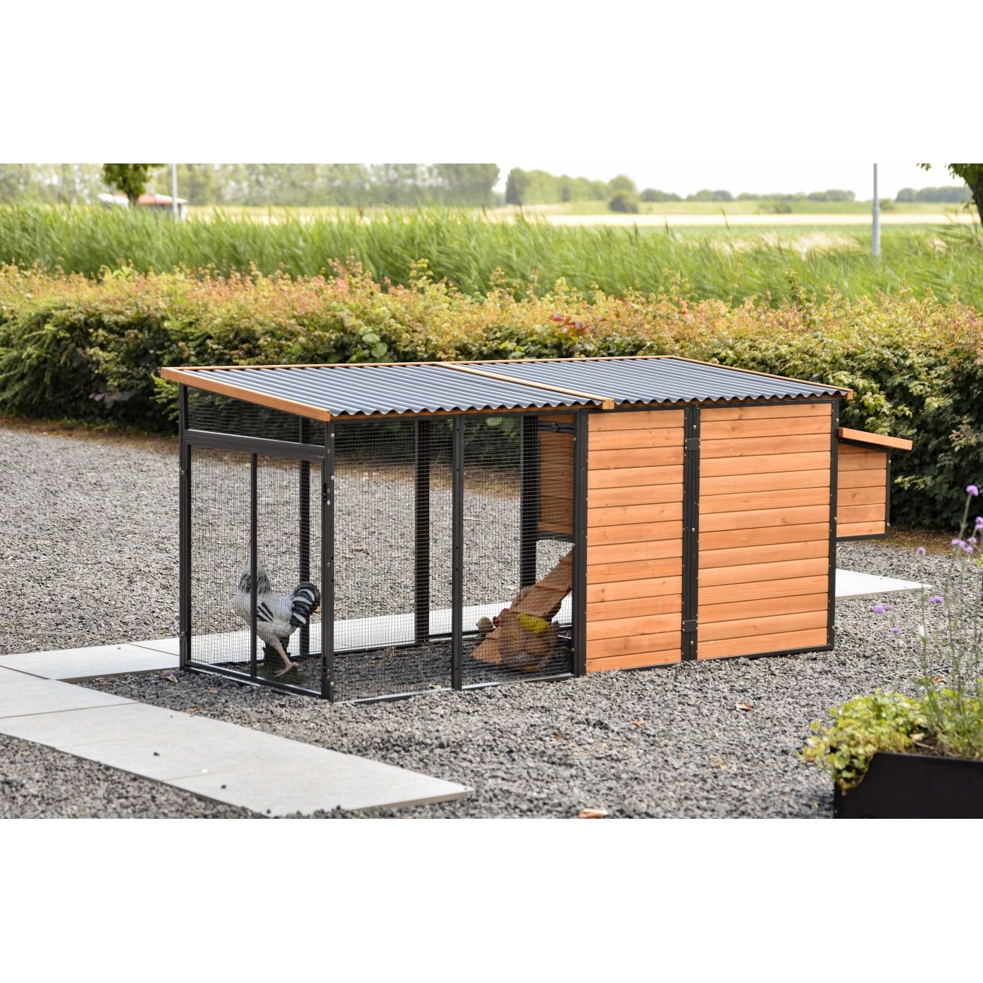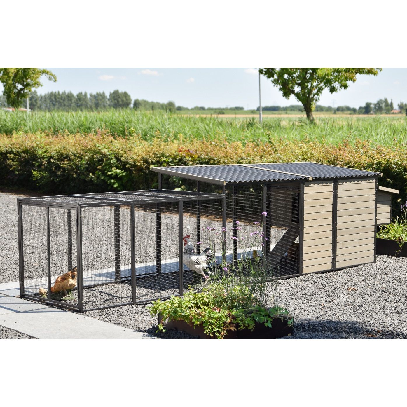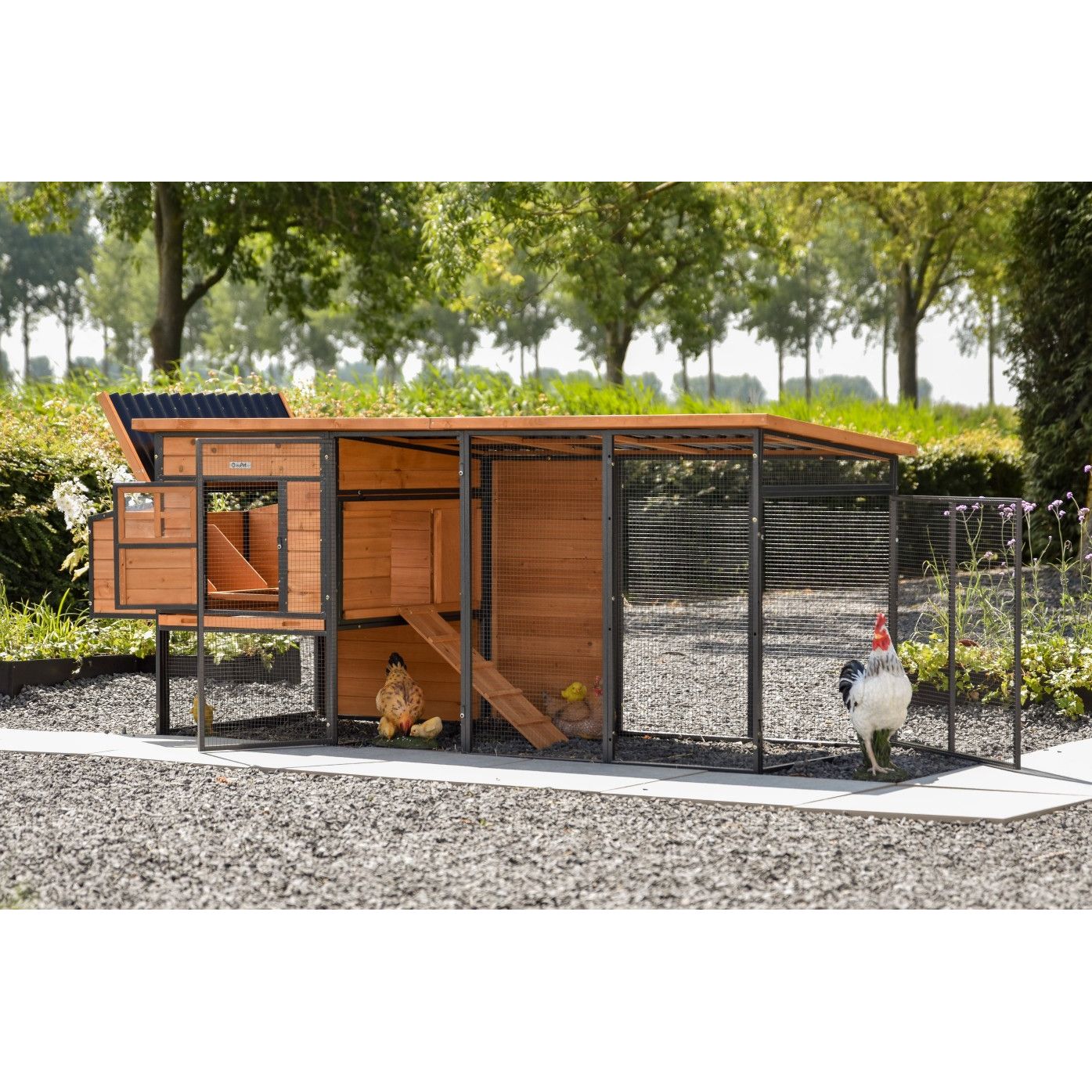 Stall Judy ist ein geräumiger, durchdachter Hühnerrstall auf stabiler Basis aus Dennenhout (Kiefernholz) mit einem lackierten Metallenrahmen und Kunststoffdach – solide und langlebig. Er wird als Bausatz geliefert mit vormontierten Paneelen, Metallrahmen, Gitter, Schiebelade, Doppeltür und Montagematerial inklusive.