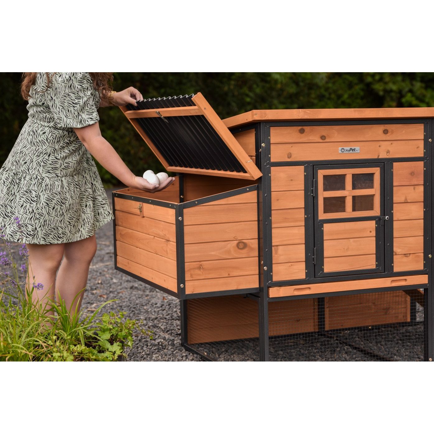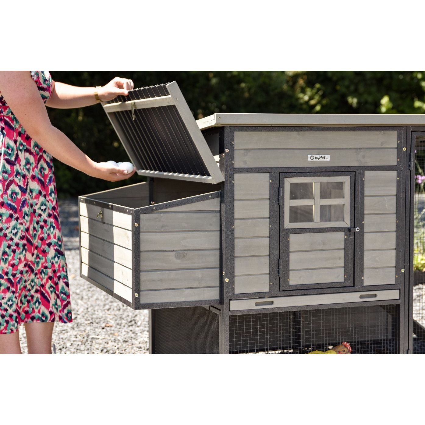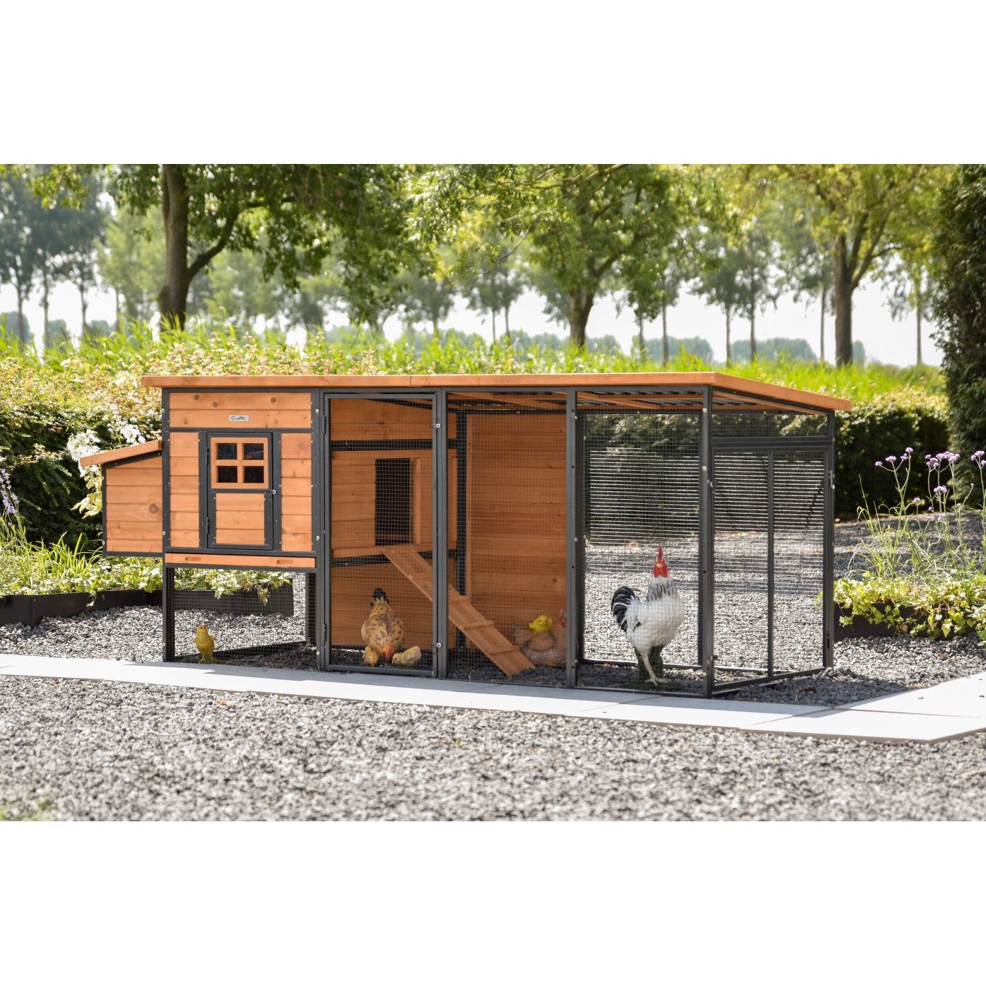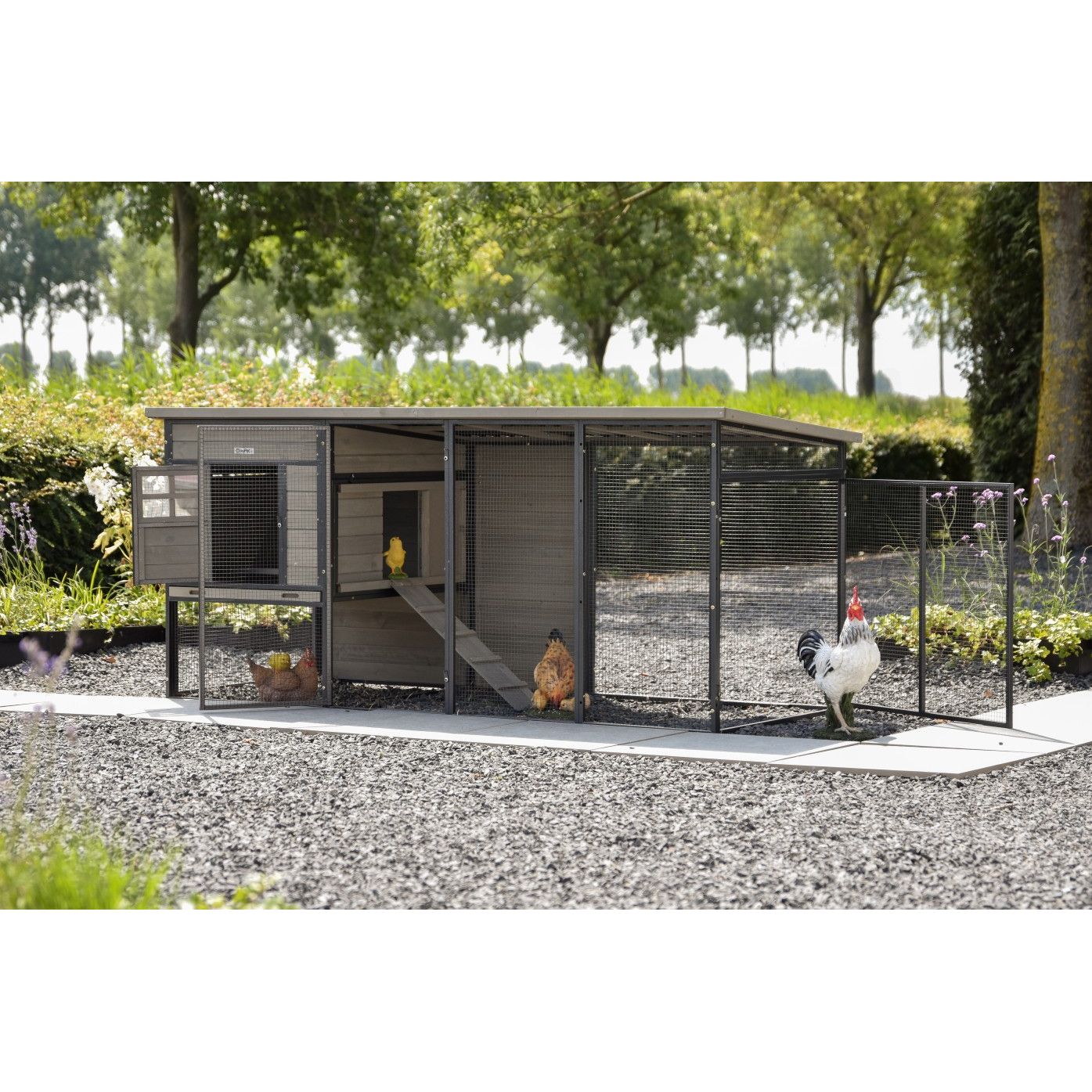 Stall Judy ist ein geräumiger, durchdachter Hühnerrstall auf stabiler Basis aus Dennenhout (Kiefernholz) mit einem lackierten Metallenrahmen und Kunststoffdach – solide und langlebig. Er wird als Bausatz geliefert mit vormontierten Paneelen, Metallrahmen, Gitter, Schiebelade, Doppeltür und Montagematerial inklusive.