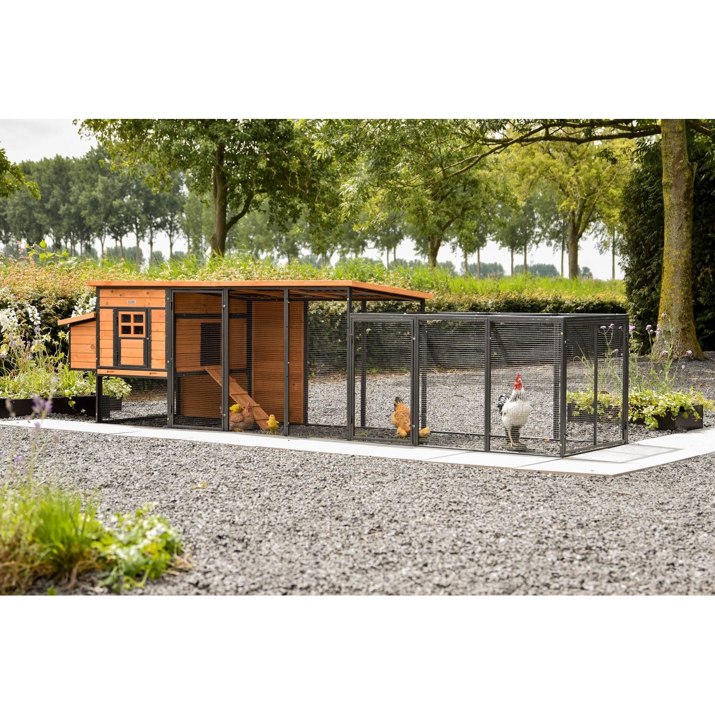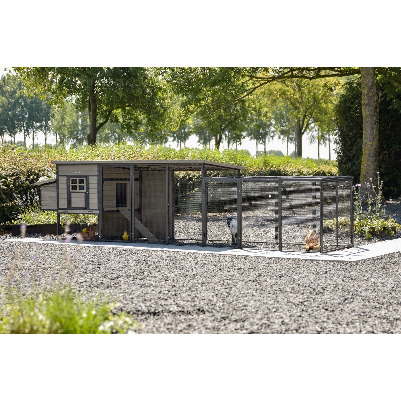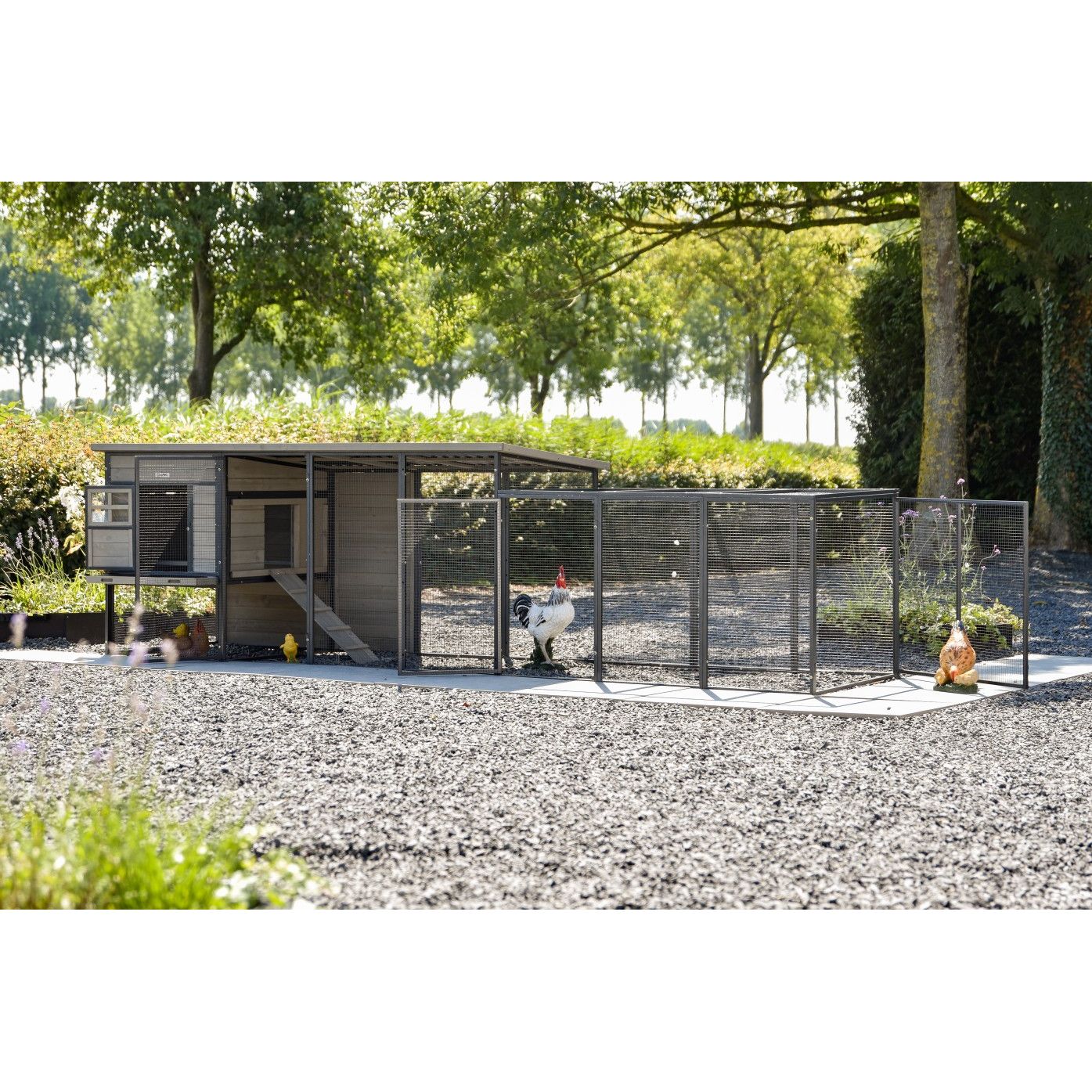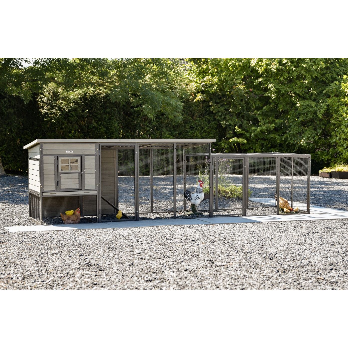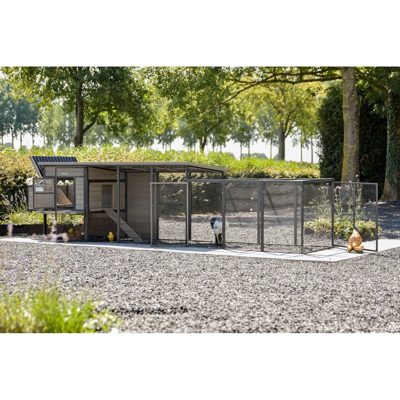 Es ist ratsam, das Holz erneut zu beizen, um es wetterbeständig zu machen. Der Auslauf ist nur als Anbau nutzbar, nicht separat verwendbar.