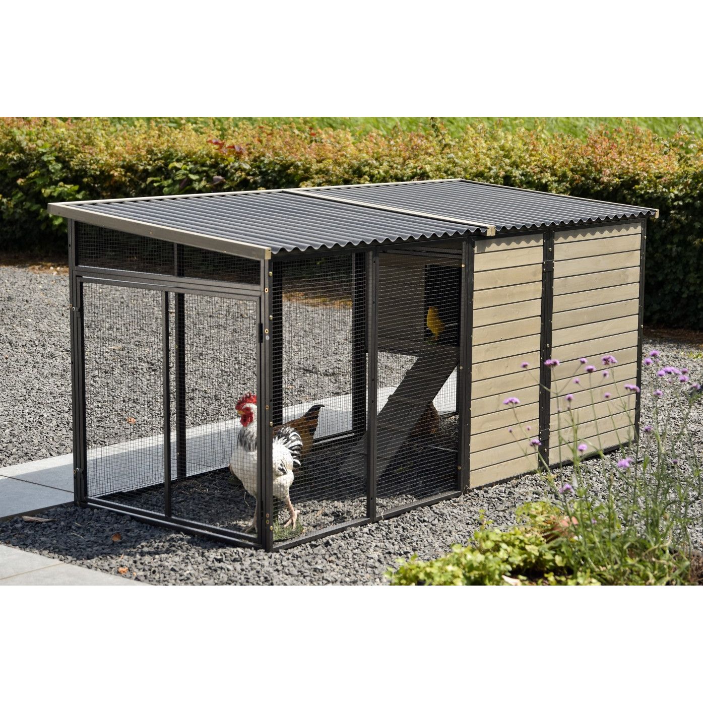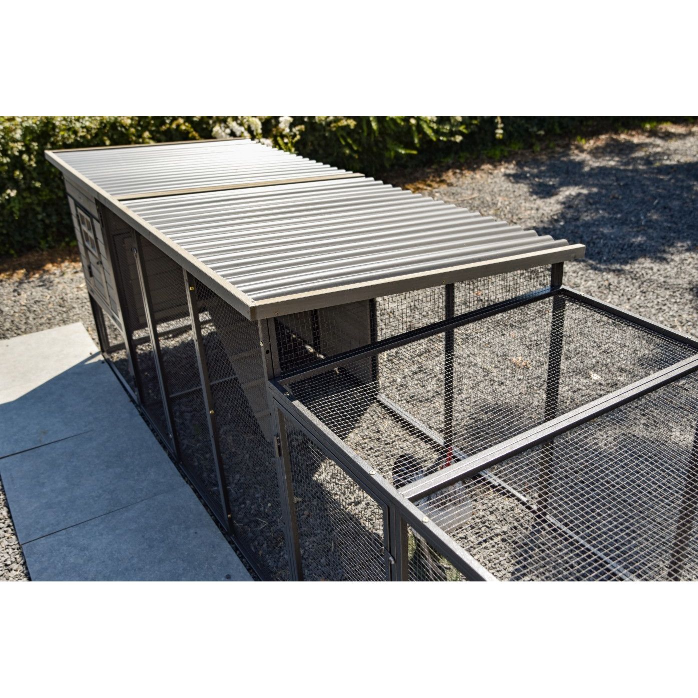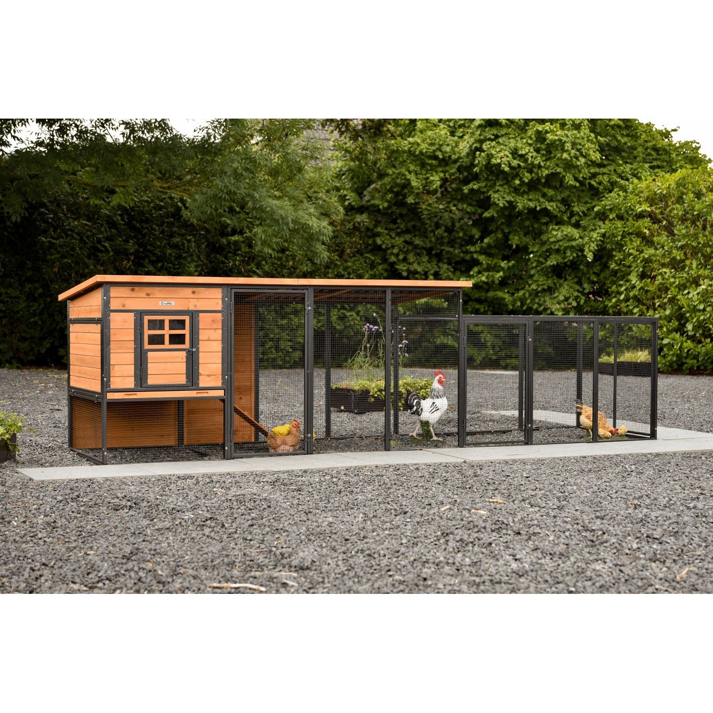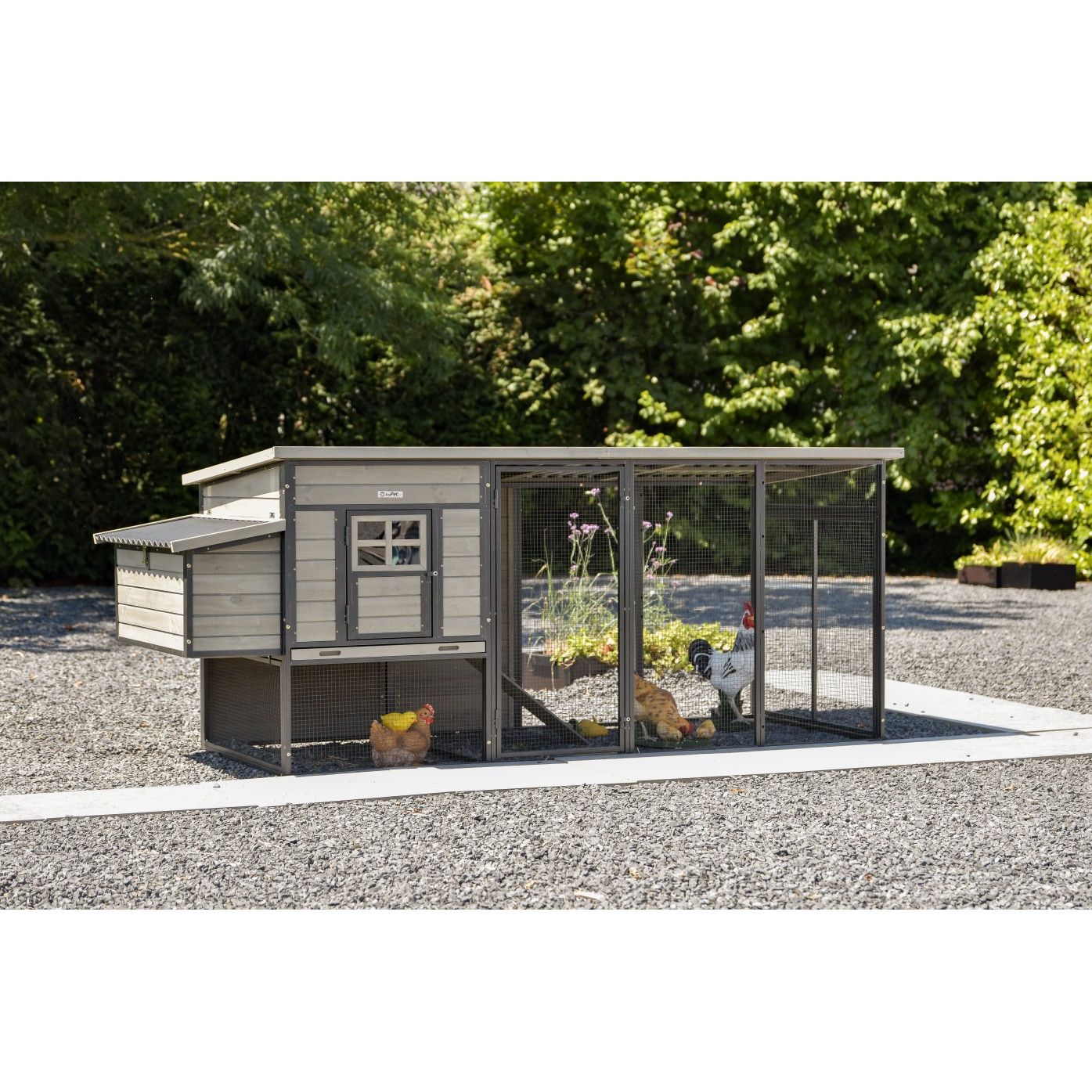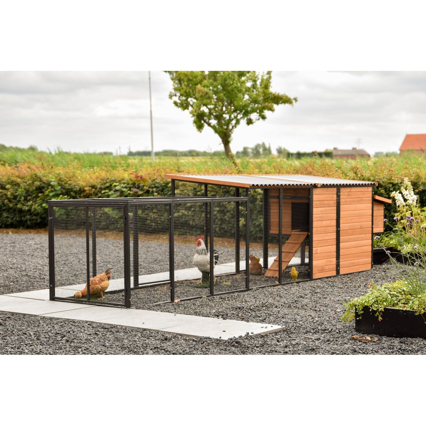 Es ist ratsam, das Holz erneut zu beizen, um es wetterbeständig zu machen. Der Auslauf ist nur als Anbau nutzbar, nicht separat verwendbar.