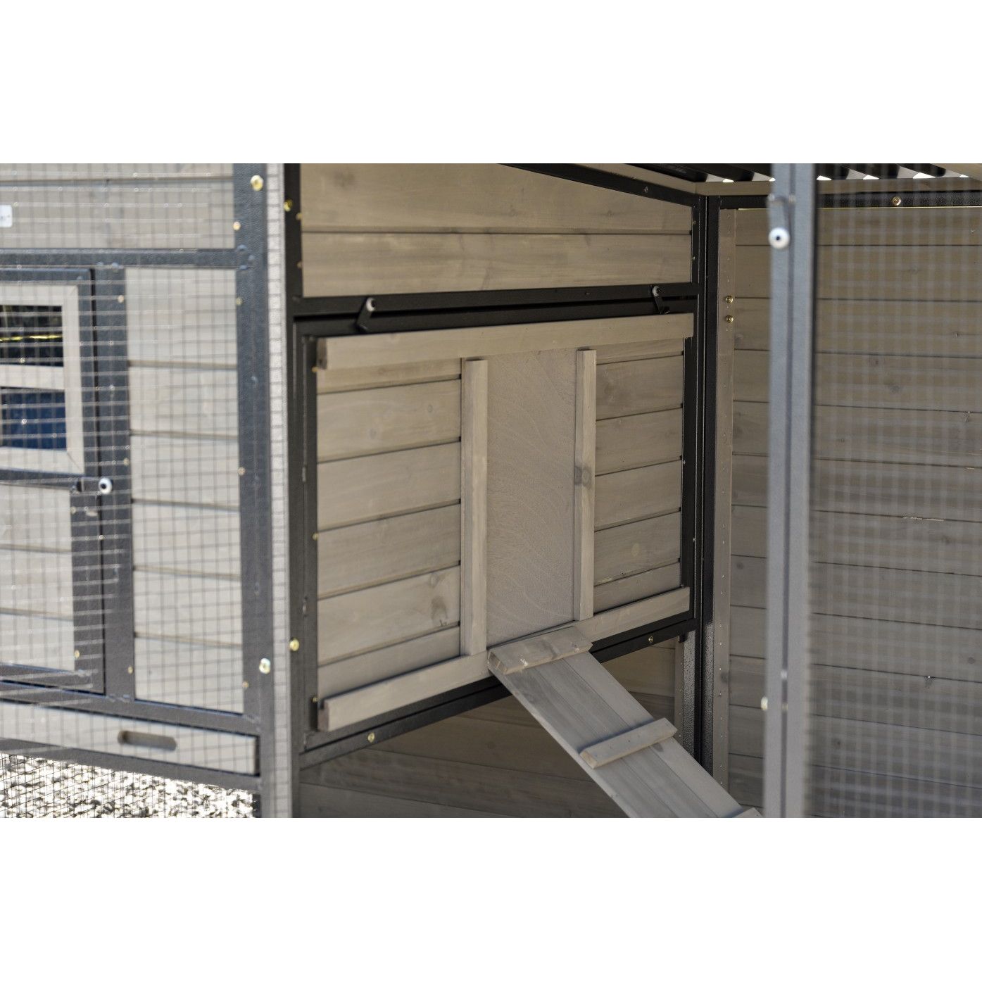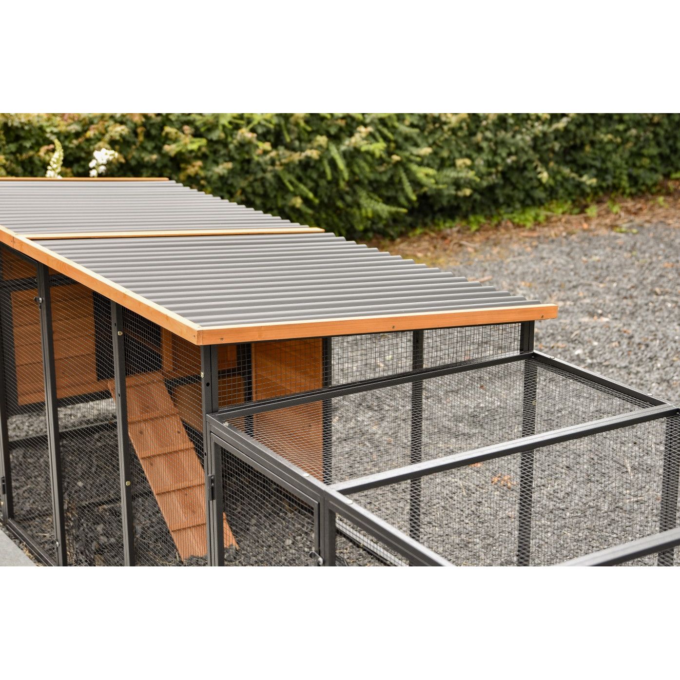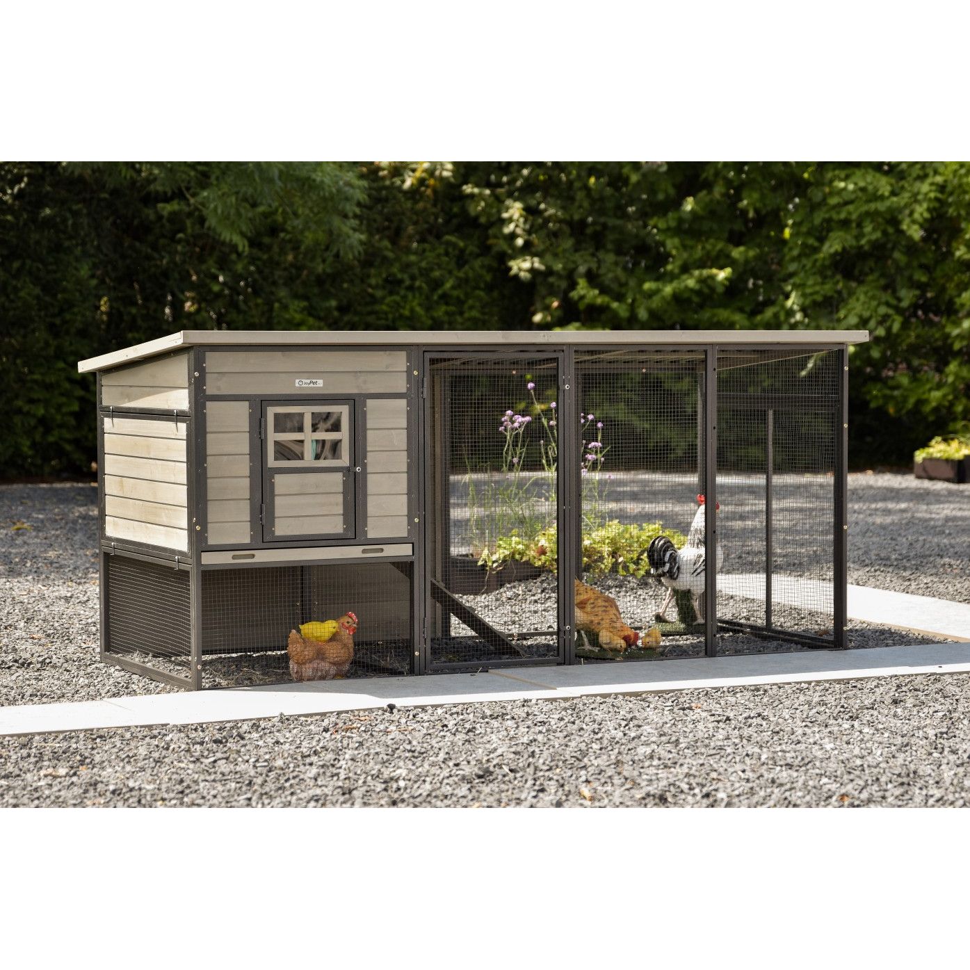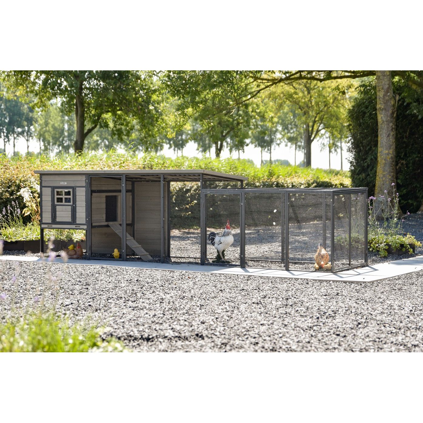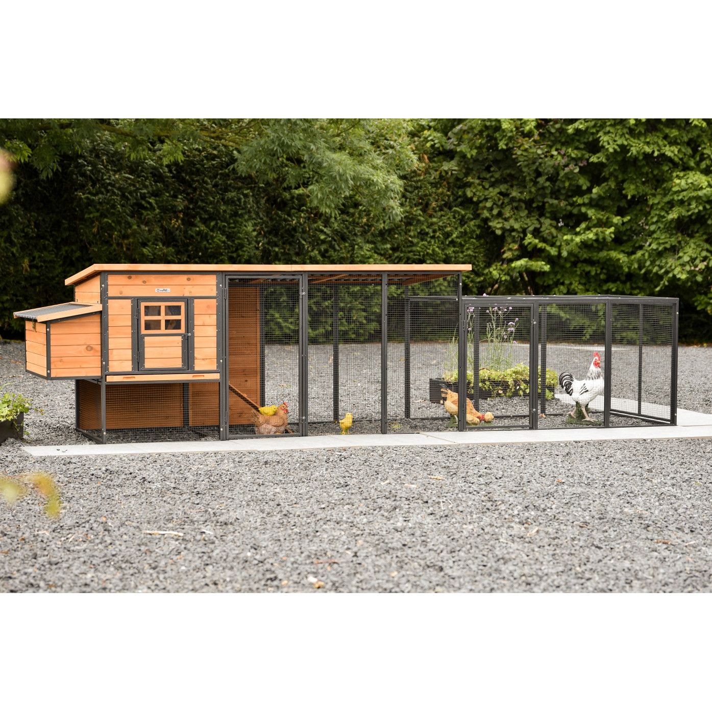 Es ist ratsam, das Holz erneut zu beizen, um es wetterbeständig zu machen. Der Auslauf ist nur als Anbau nutzbar, nicht separat verwendbar.