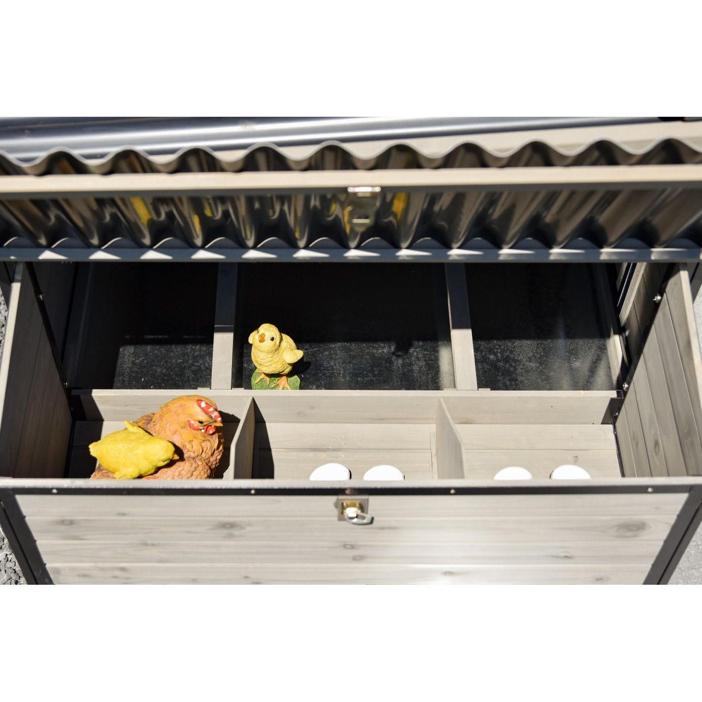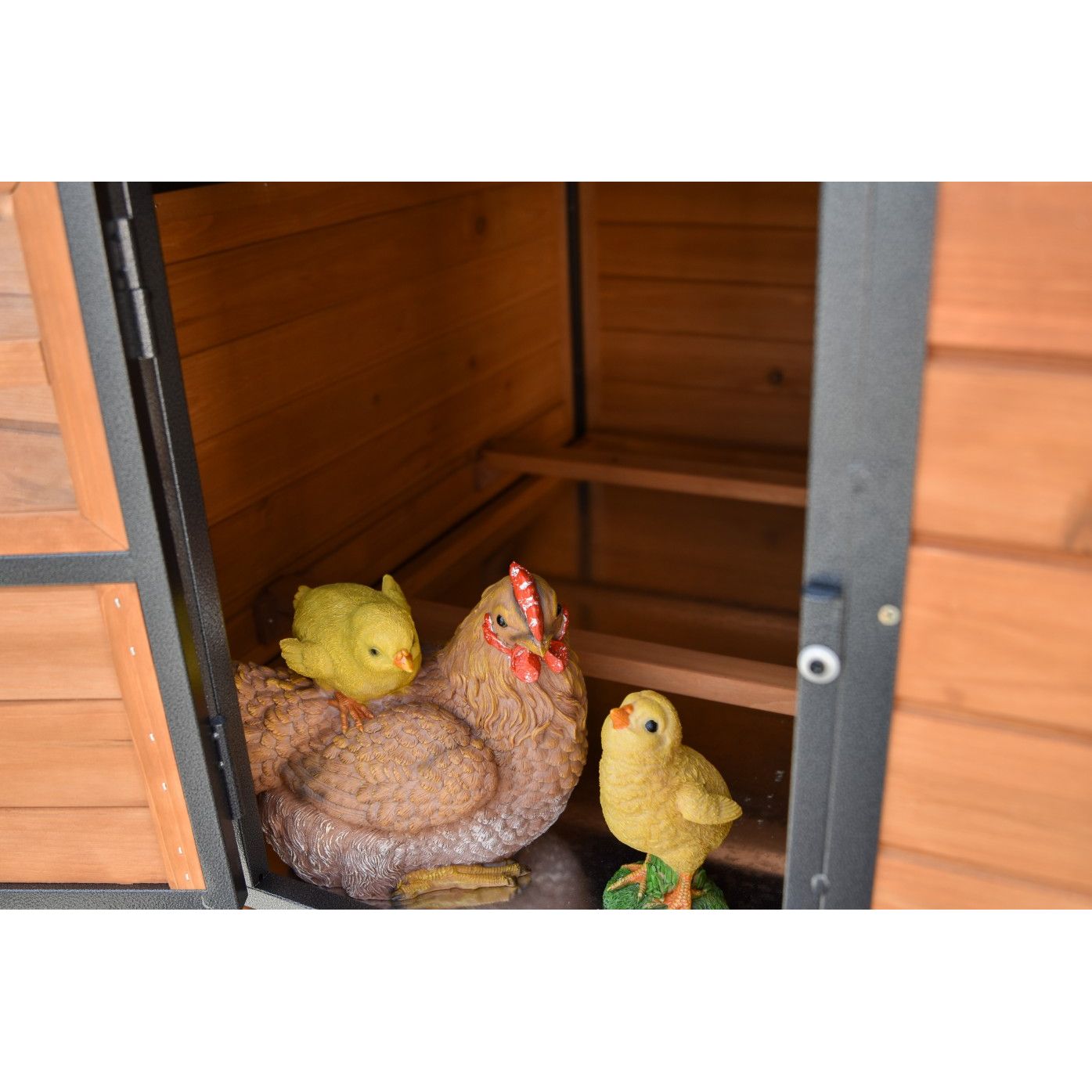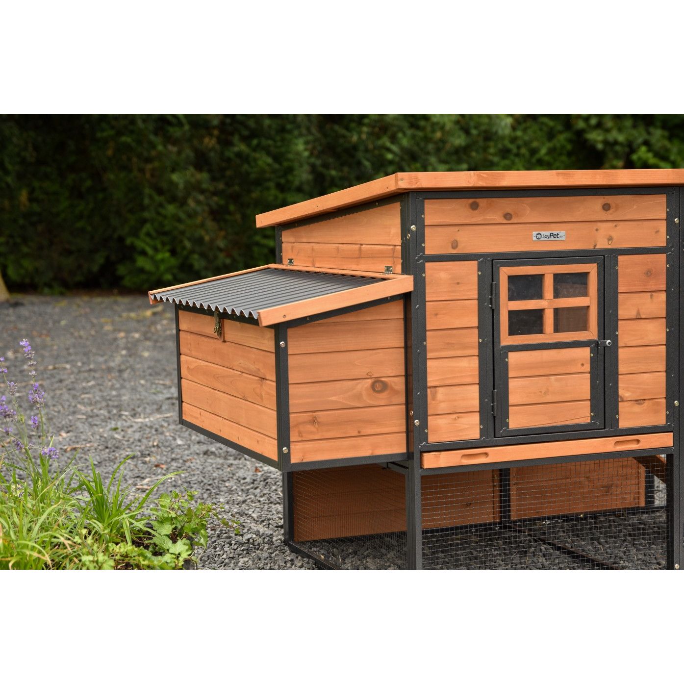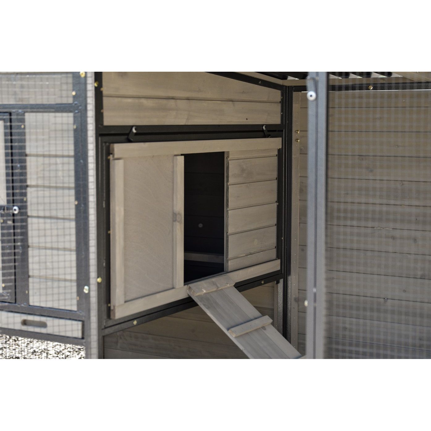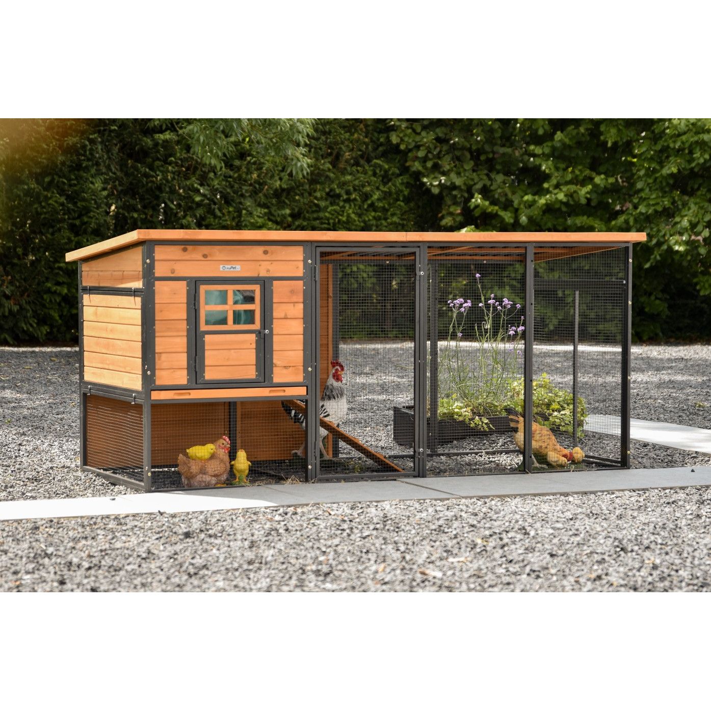 Es ist ratsam, das Holz erneut zu beizen, um es wetterbeständig zu machen. Der Auslauf ist nur als Anbau nutzbar, nicht separat verwendbar.