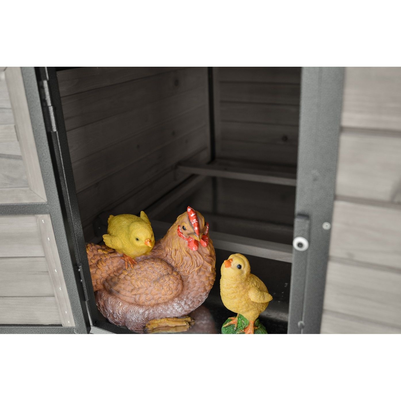 Der Nachthausbereich enthält eine praktische Schublade für Reinigung und ist durch eine verschiebbare Luke einfach zugänglich. Durch optionale Ausbauteile (z. B. Nistkasten oder Auslauf) passt sich Stall Judy flexibel Ihren Anforderungen an. Zubehör wie Spielgeräte, Futter-/Trinkbehälter oder Fundament ist nicht enthalten.