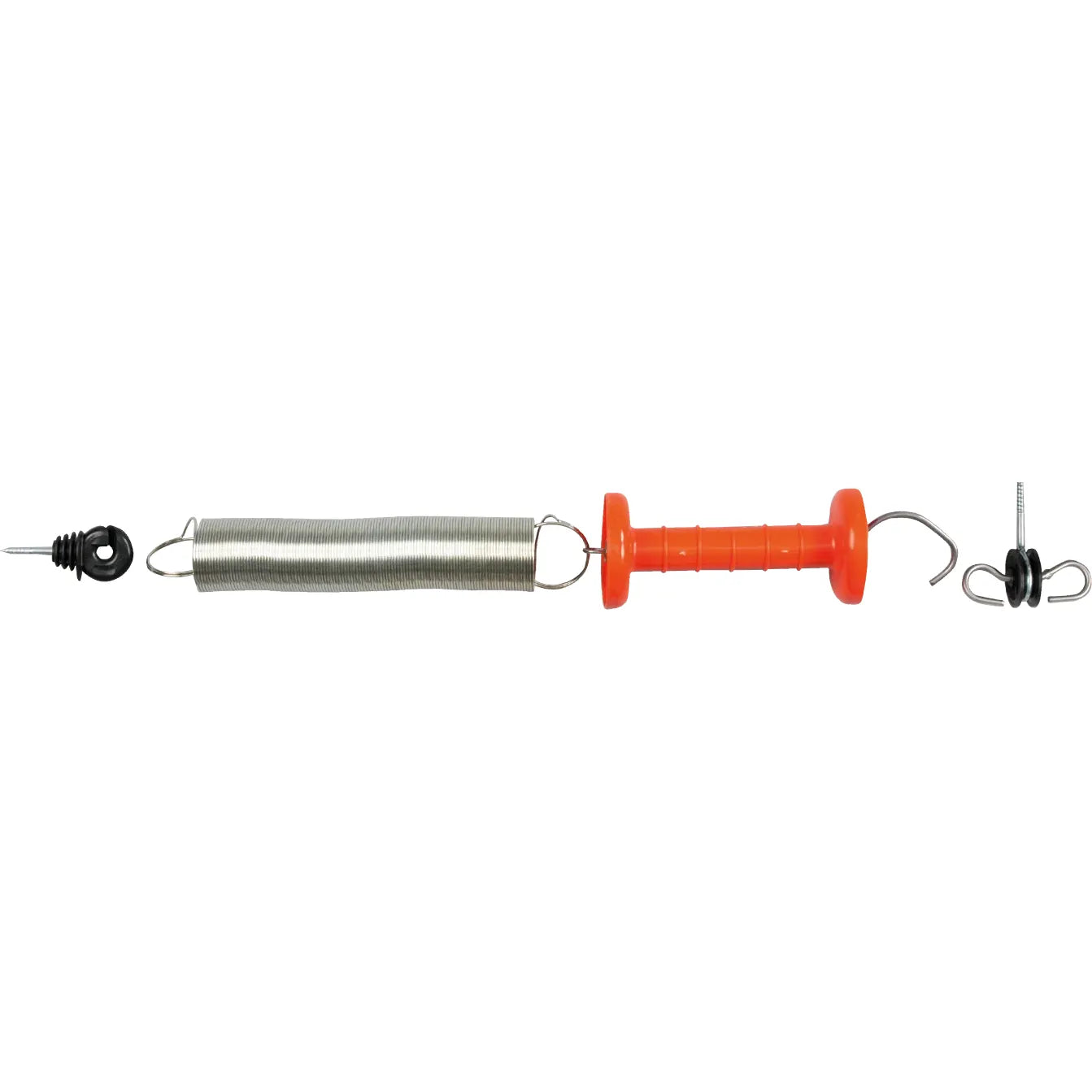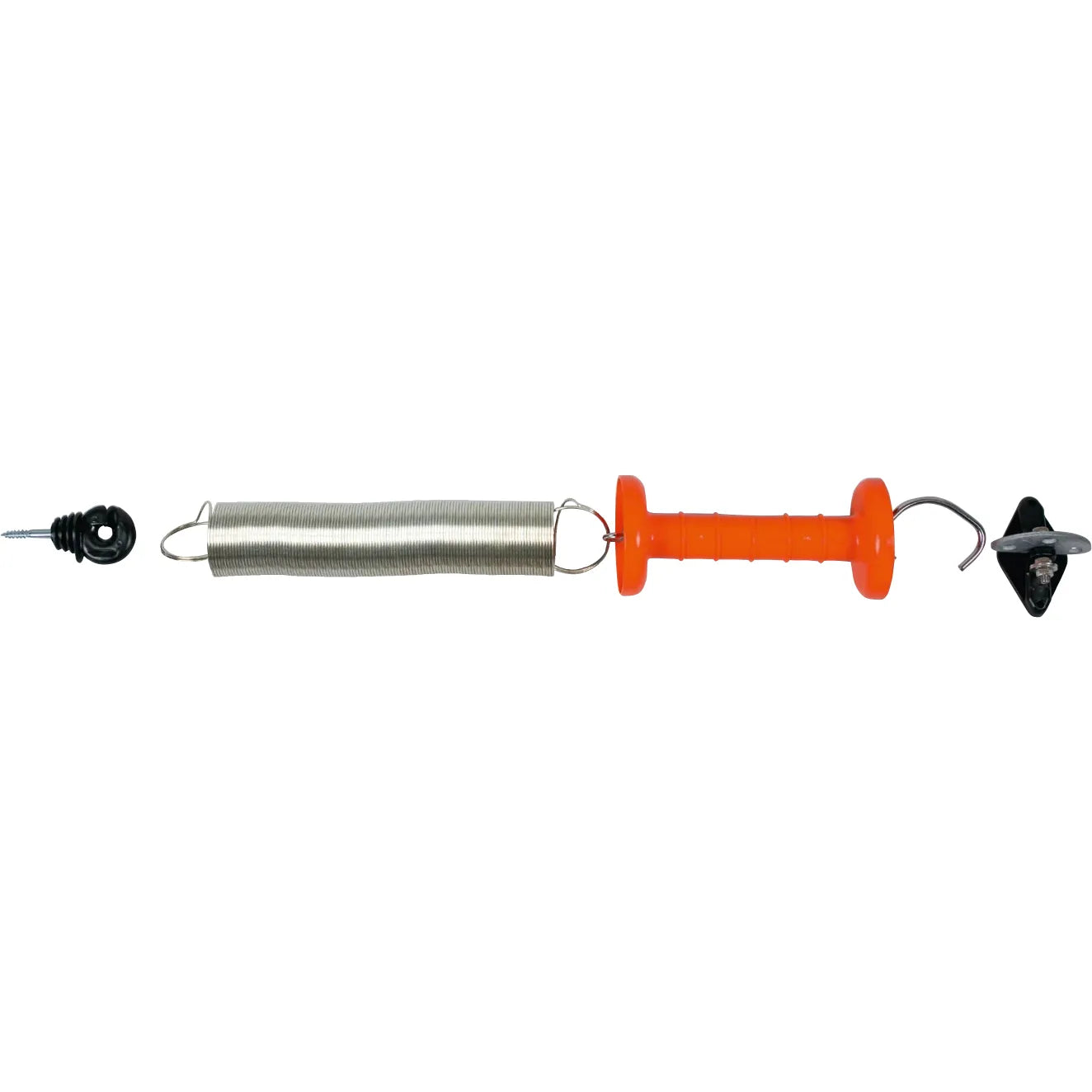 Ein Torspannfederset besteht aus 4 Teilen: Torgriff, Torgriff­isolator, Torspann­feder galvanisch verzinkt und Isolator zum Einhängen der Feder. ­PATURA Torspann­federsets enthalten eine besonders grosse Feder und sind geeignet für alle Torbreiten von 3 bis 5 Meter. In ausgehängtem Zustand ist die Feder stromlos, zieht sich auf ca. 25 cm zusammen und hängt zusammen mit dem Griff am Torpfosten herunter. Zum Schliessen des Tores wird der Torgriff mit der Feder auf der anderen Seite des Tores in den Torgriffisolator eingehängt. Von hier aus erhalten Torgriff und Feder automatisch Strom.