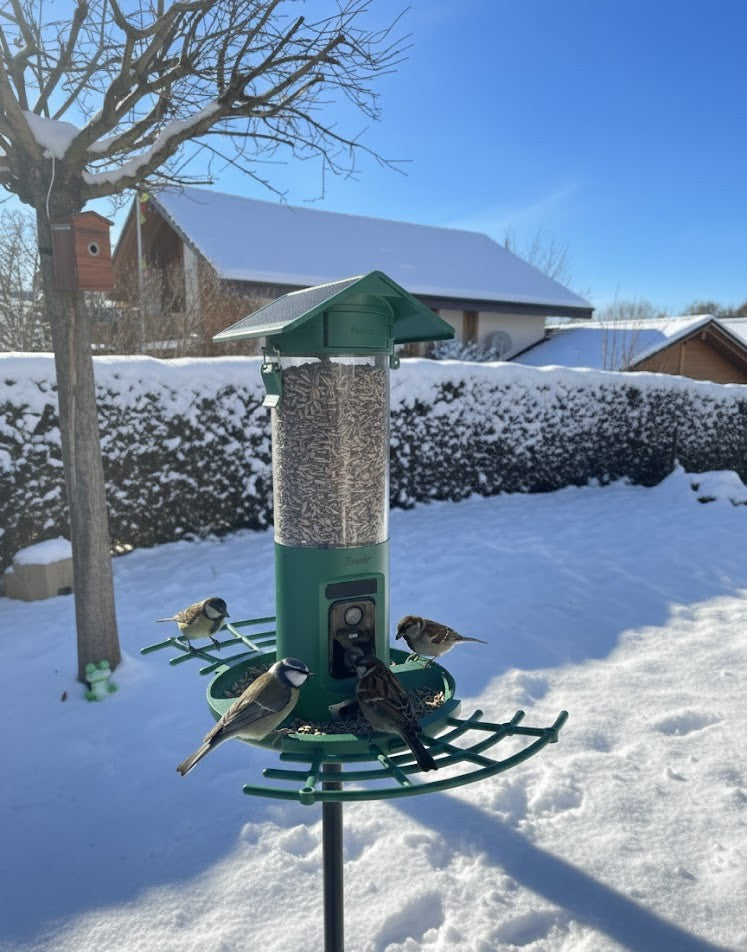 Das robuste, wetterfeste Kunststoffgehäuse schützt Technik und Futter zuverlässig bei jedem Wetter. Die grosszügige Futterkammer sorgt dafür, dass Ihre gefiederten Gäste stets versorgt sind – ob im Sommer oder Winter.
